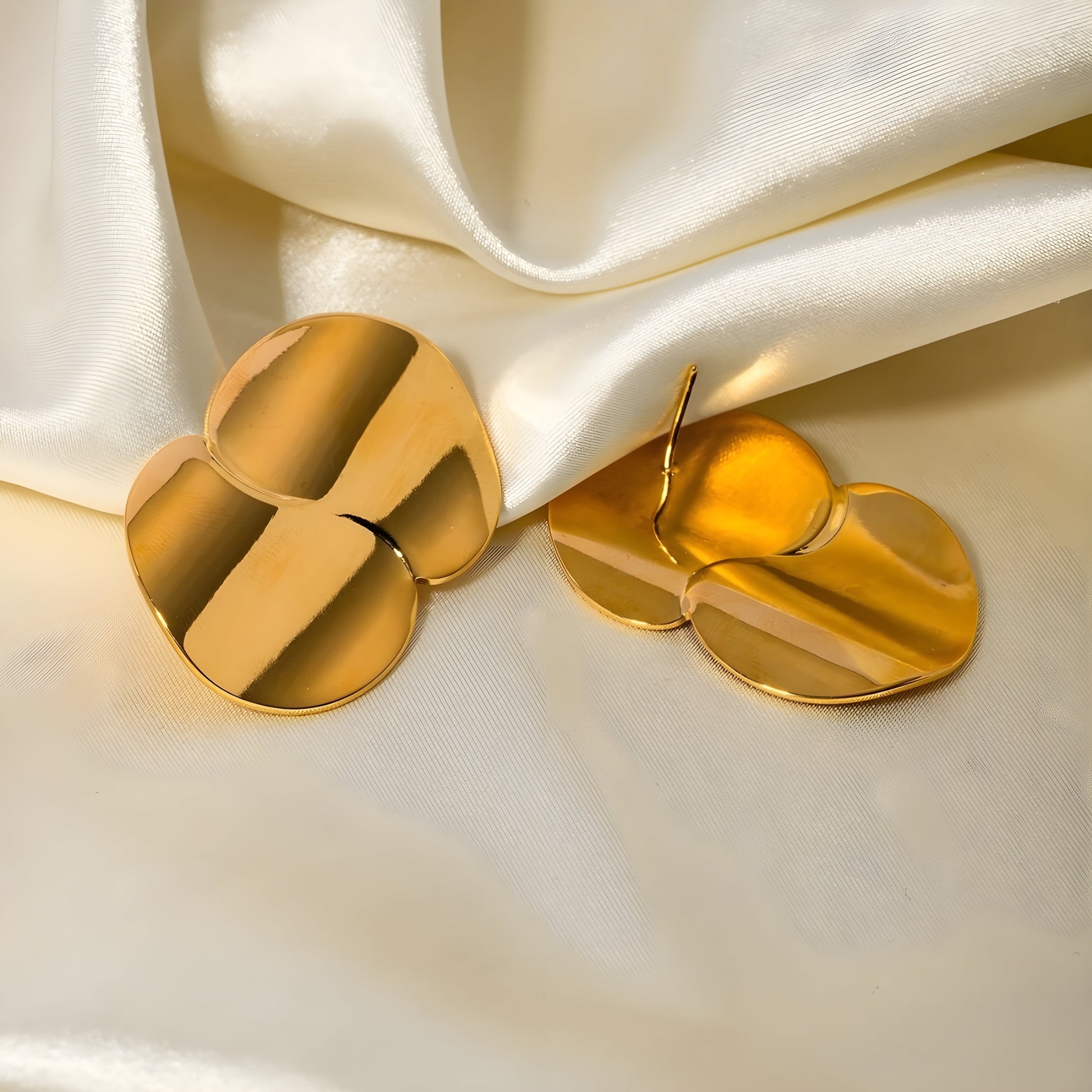 These earrings have a unique, abstract design, featuring two overlapping golden shapes that create a smooth, rounded form. The polished finish gives them a sleek and luxurious appearance, and the geometric structure adds a contemporary flair. The large, sculptural design makes these earrings a statement piece that adds drama and sophistication to any outfit.