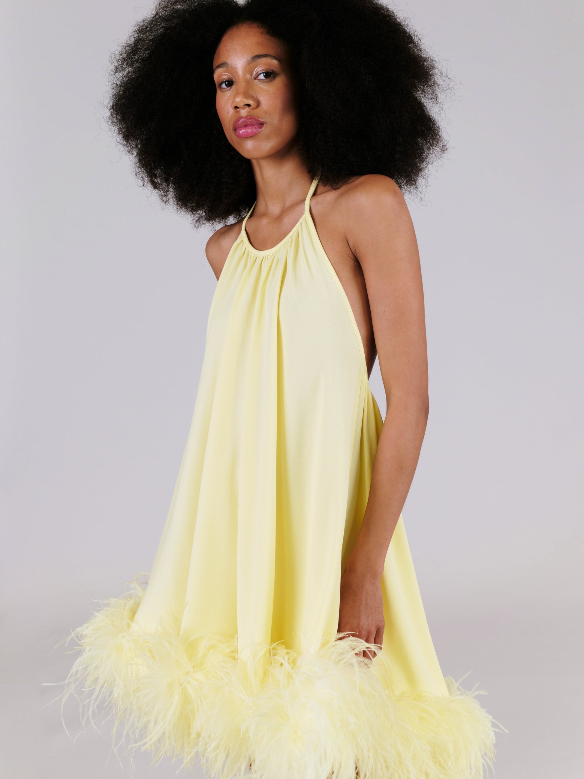 The Georgia Dress is the perfect attire for your grand adventures. With a halter neck closure and a full skirt adorned with feathers, this dress will illuminate your journey with its light.