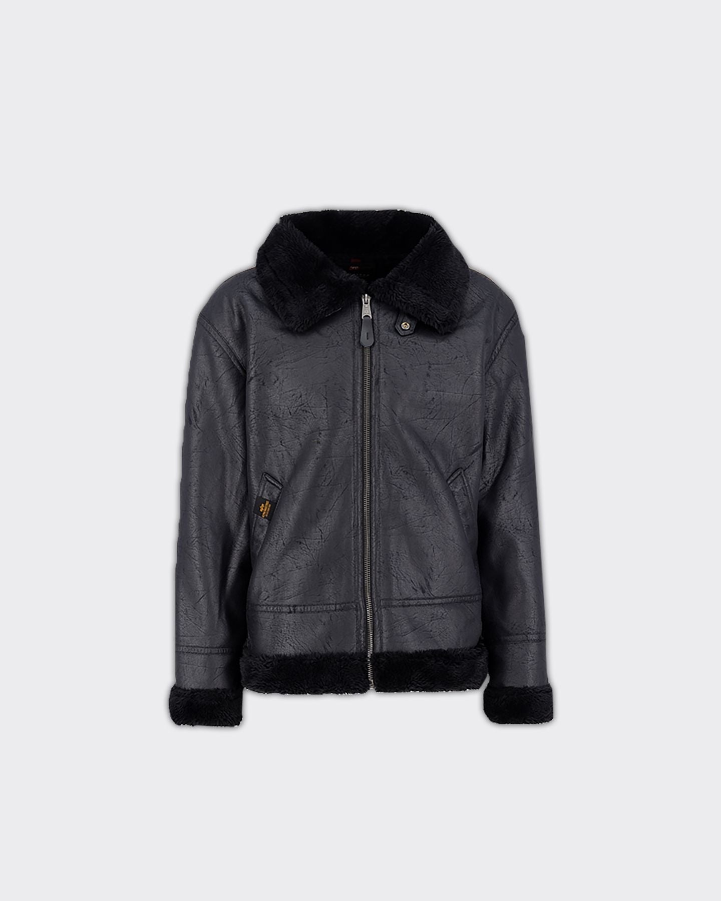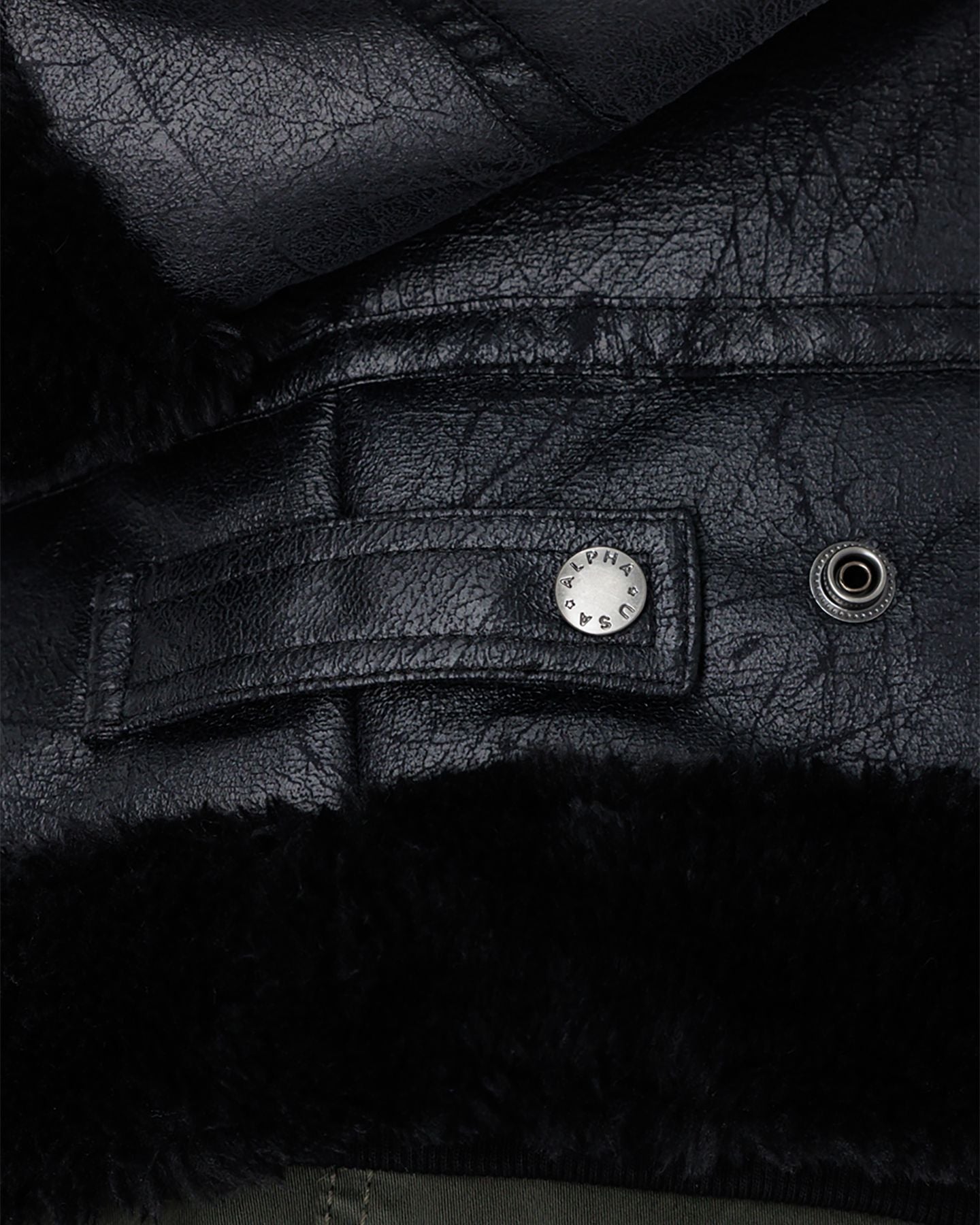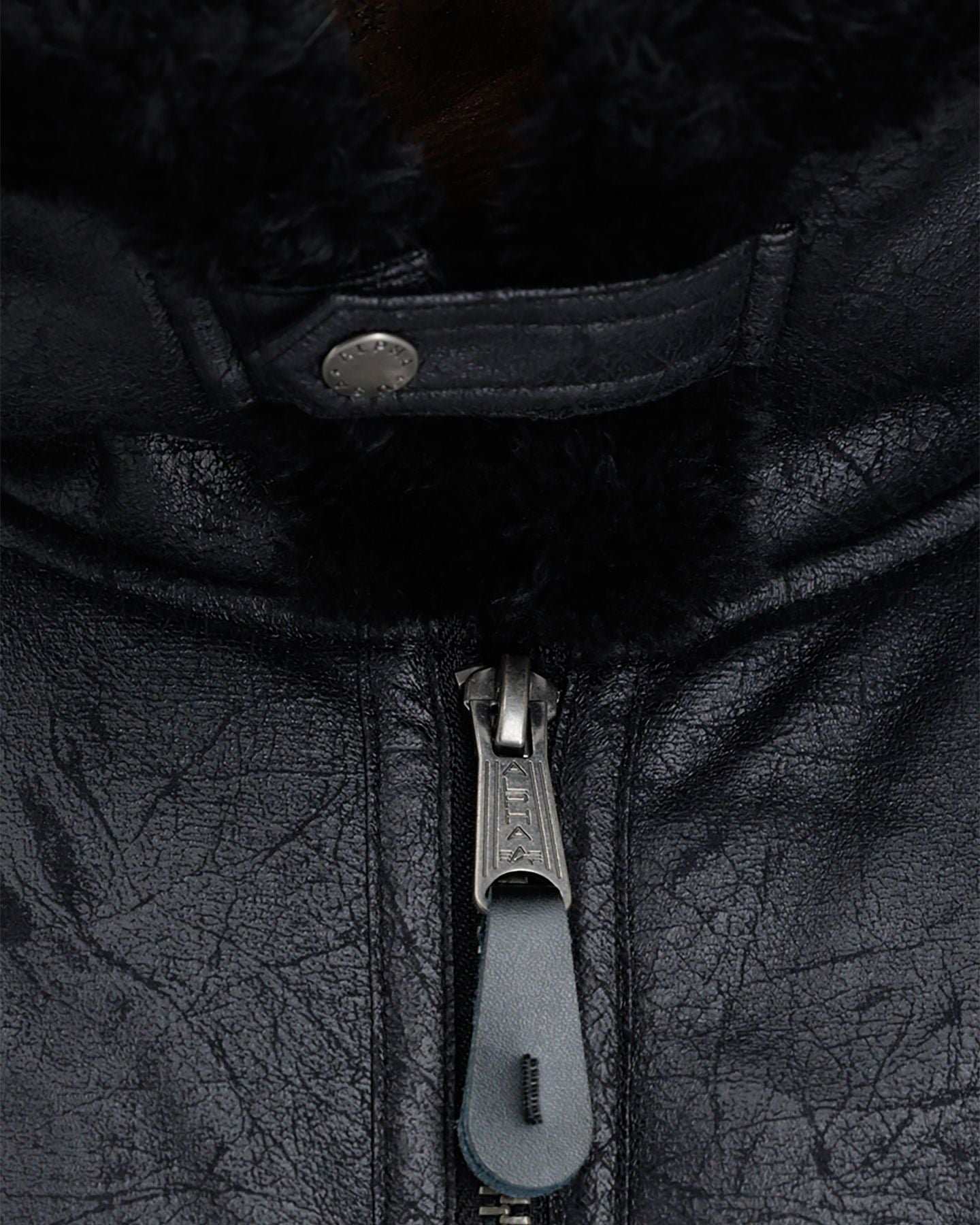 Giubbotto aviatore B3 in pelle nera con collo e polsini in pelliccia sintetica, chiusura a cerniera frontale e dettagli in metallo.