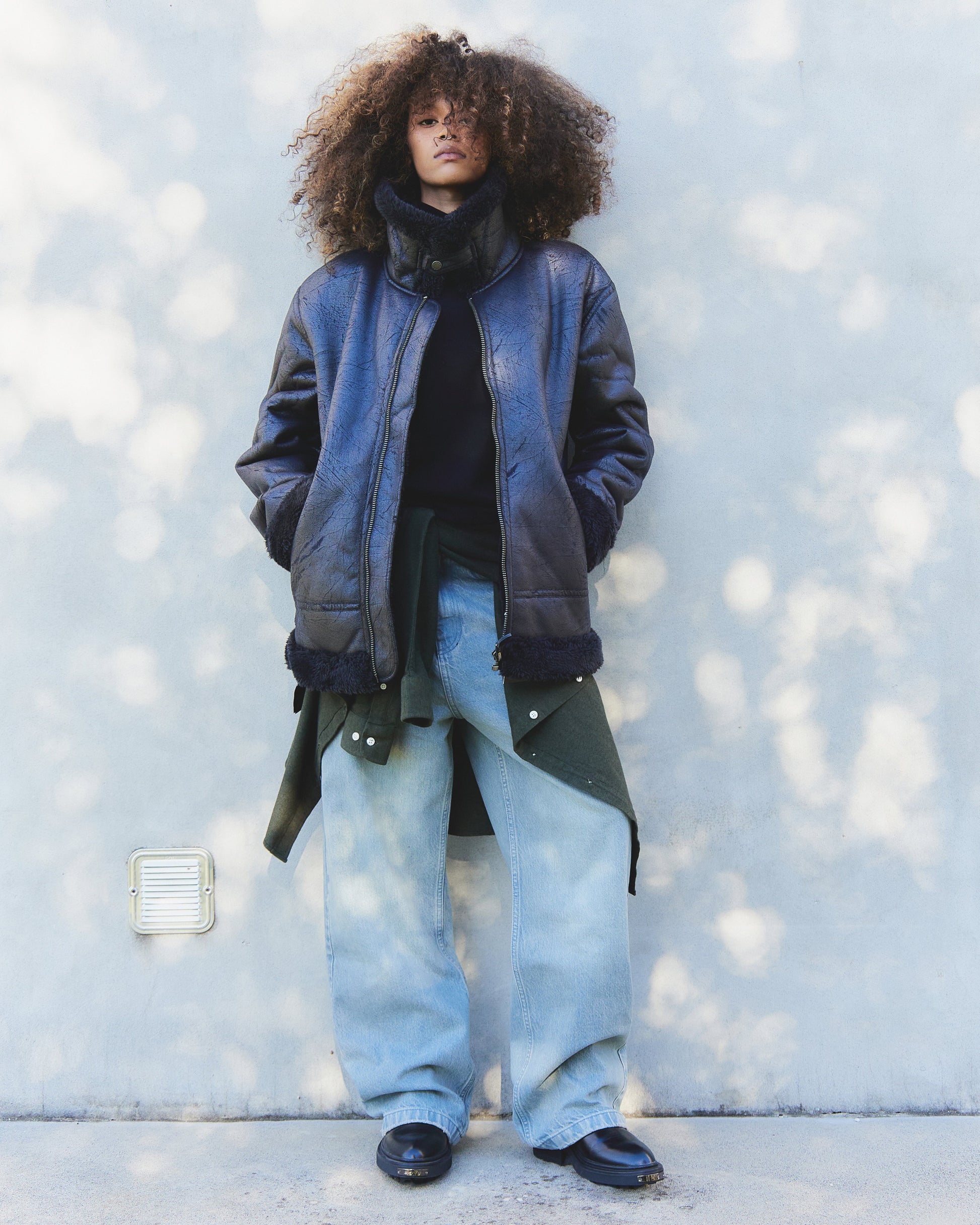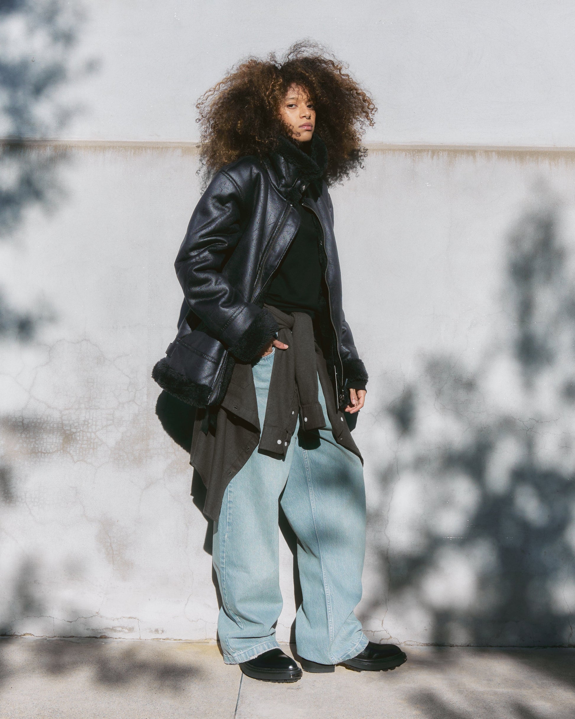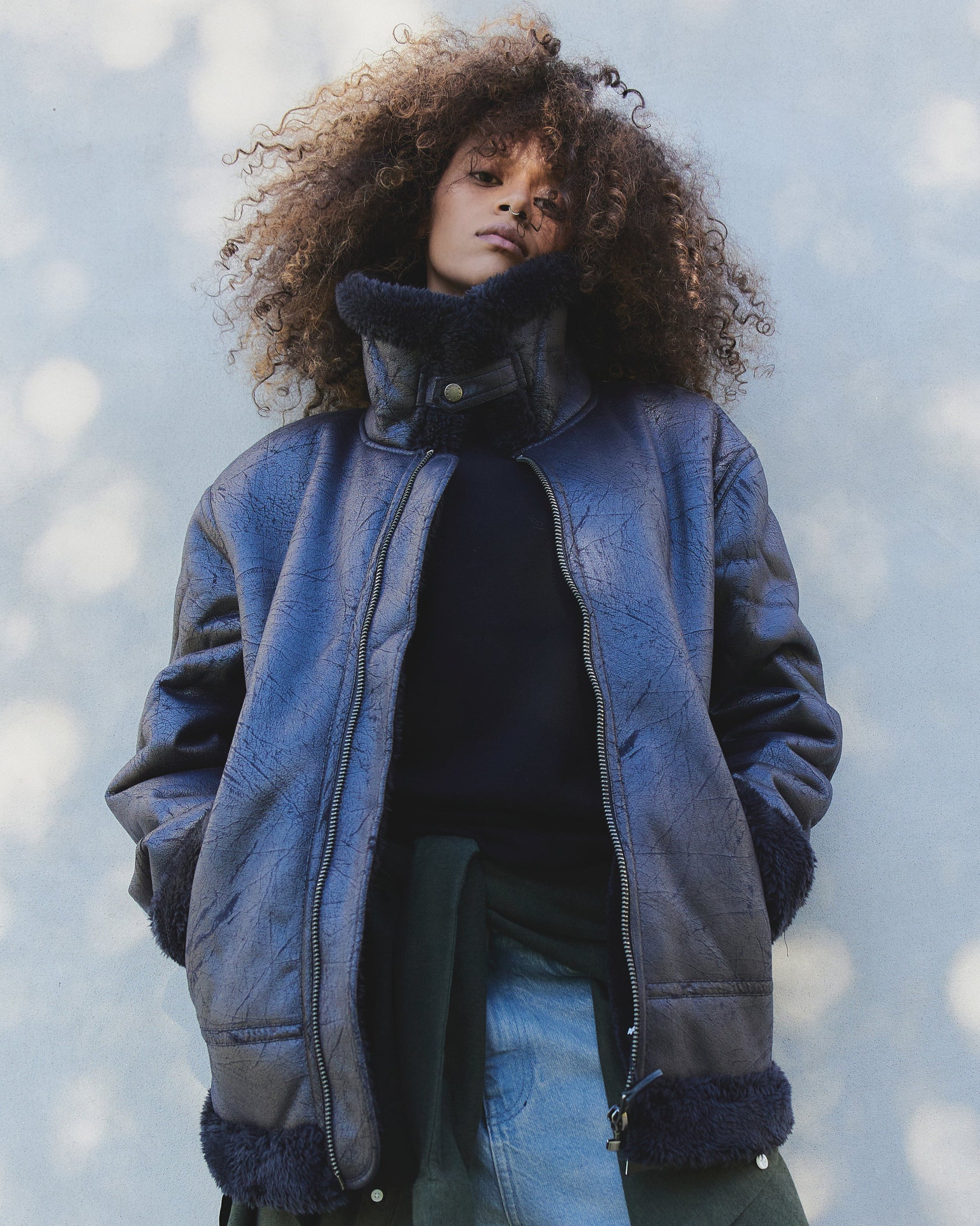 Giubbotto aviatore B3 in pelle nera con collo e polsini in pelliccia sintetica, chiusura a cerniera frontale e dettagli in metallo.