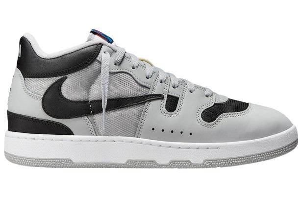 the nike mac attack qs sp travis scott cactus jack is unveiled in an engaging light smoke grey, black, and white color combination, incorporating a mix of leather and mesh across its upper. the mesh is prominently featured on the vamp and side panels, while high-quality leather forms the majority of the shoe’s construction.
