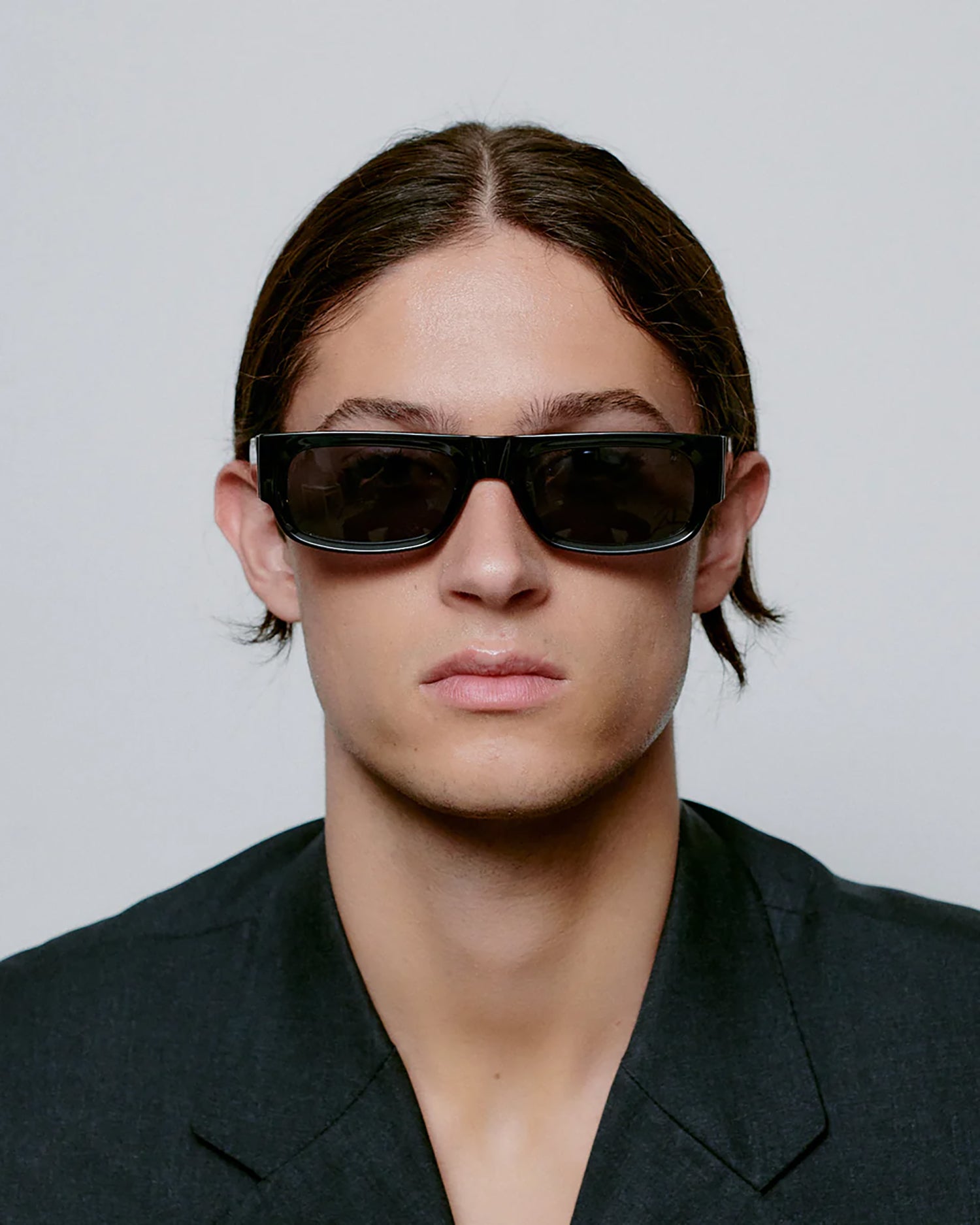 Occhiale da sole in acetato. Protezione uv 400, lenti in policarbonato, cerniere ottiche di alta qualità, borsa per la pulizia inclusa, aste modellabili con anima in metallo.