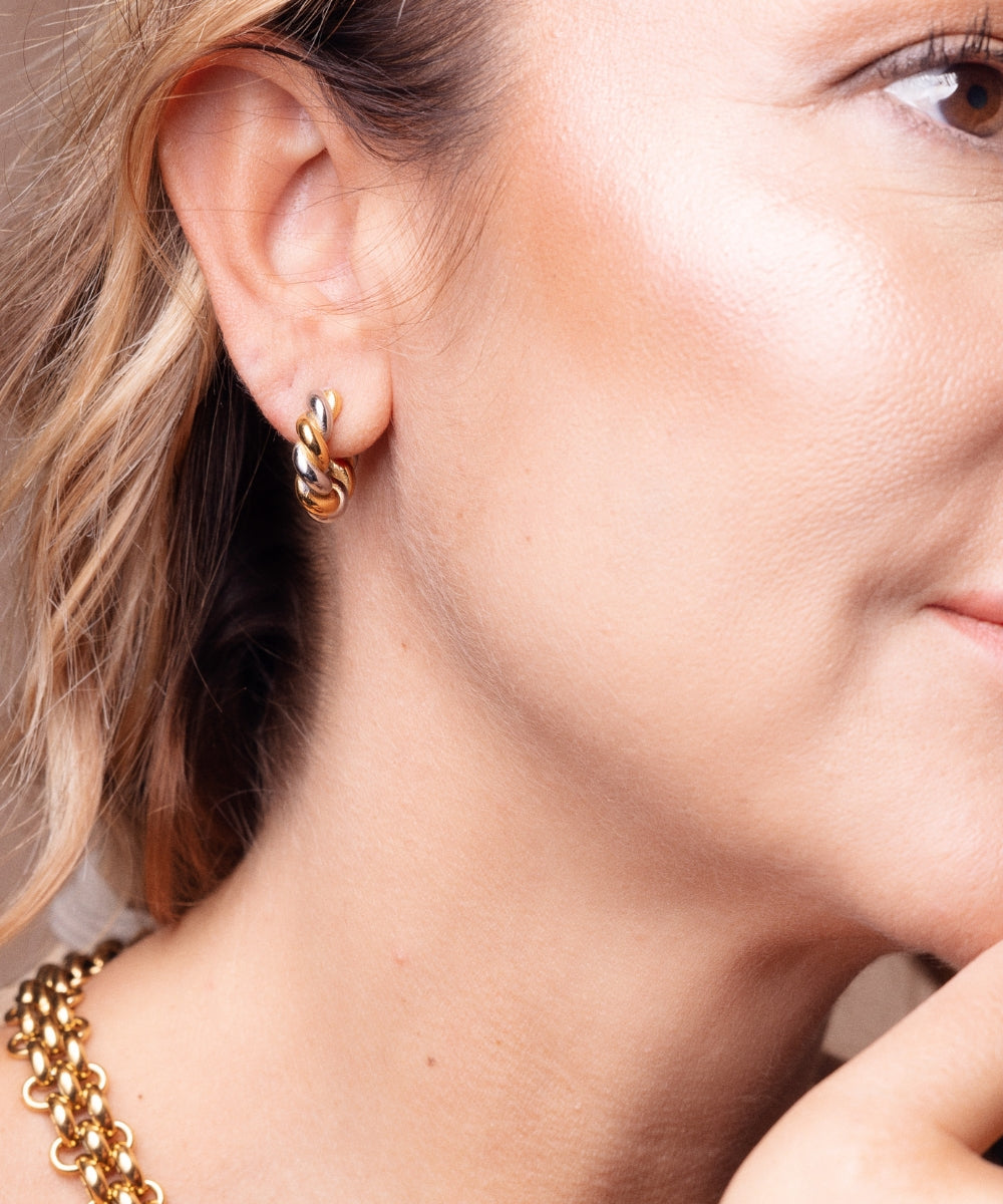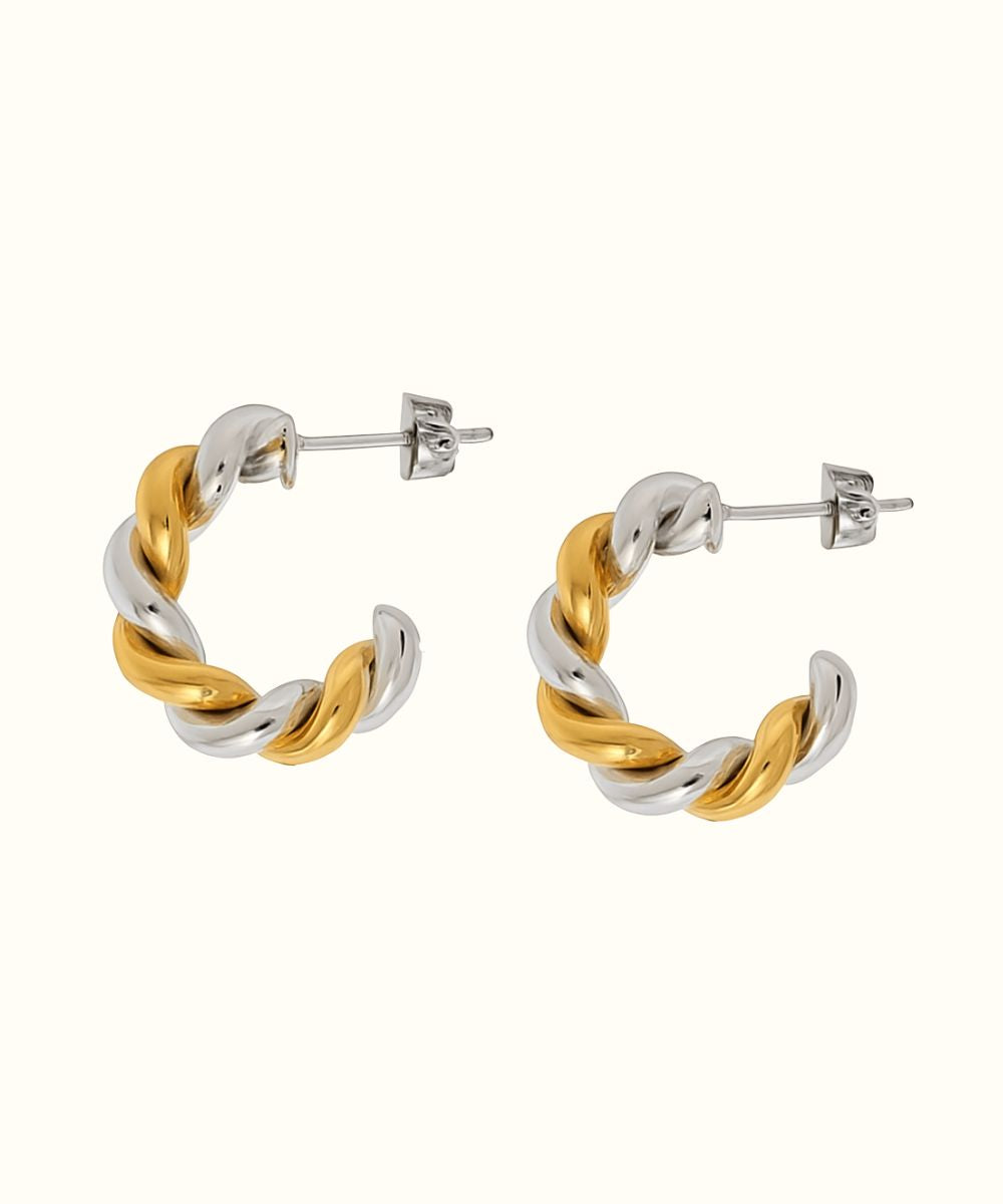 L'Orecchino Torchon bicolore unisce eleganza e versatilità in un design raffinato. La combinazione di due tonalità dona un tocco moderno e sofisticato, perfetto per valorizzare ogni outfit. Leggero e confortevole, è l’accessorio ideale per chi desidera distinguersi con stile in ogni occasione.