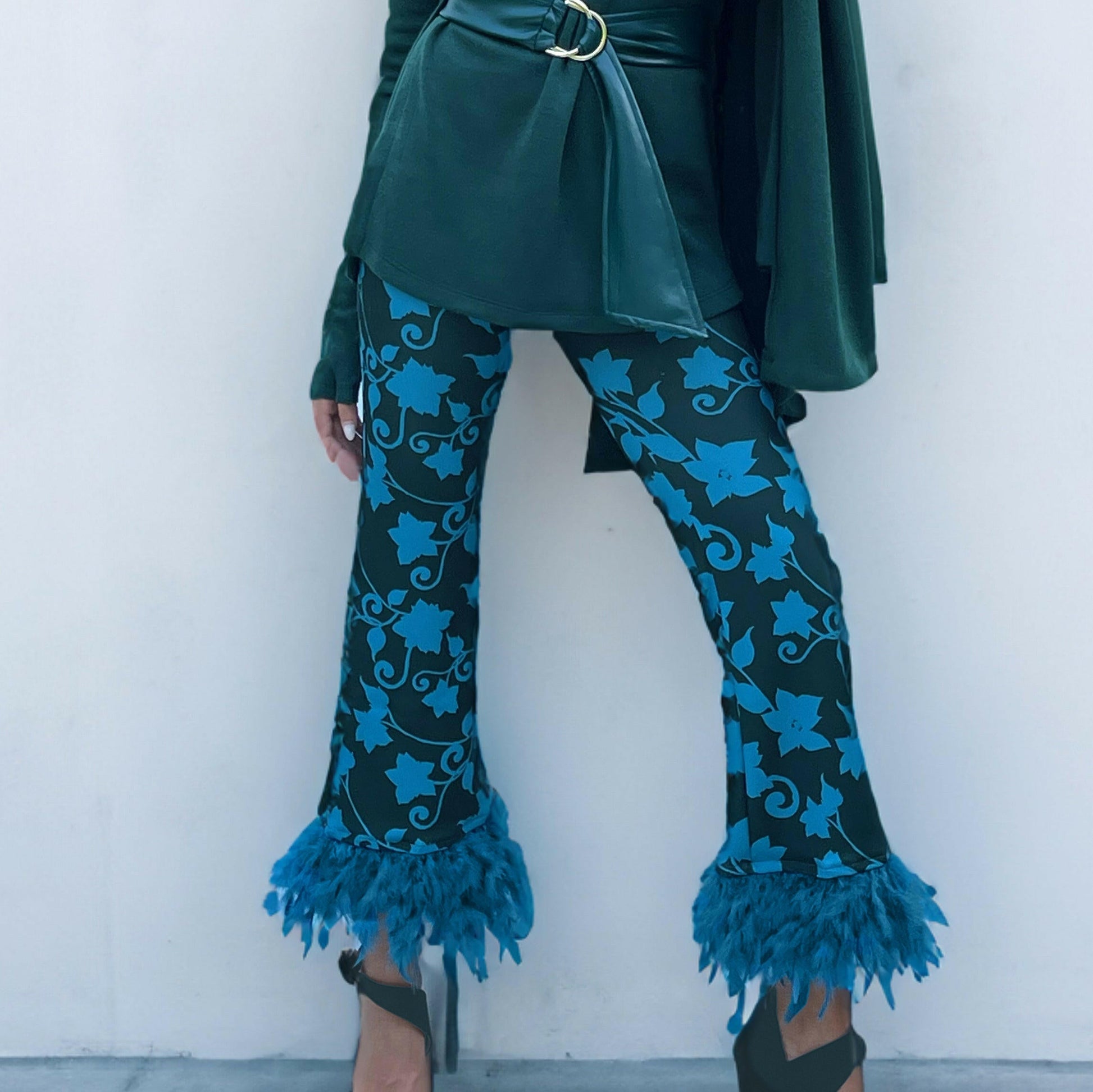 Pantaloni alla caviglia in crépe stretch in un disegno esclusivo floreale in un' inedita variante verde bottiglia e turchese, orlati da un bordo di piume in tono con la stampa.