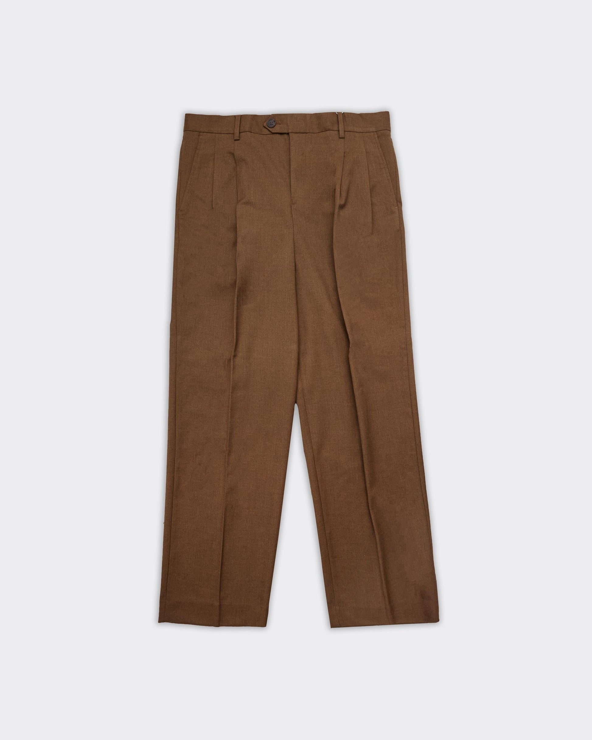 Pantalone color cognac in tessuto liscio, con passanti in vita, pinces frontali e tasca posteriore con bottone.