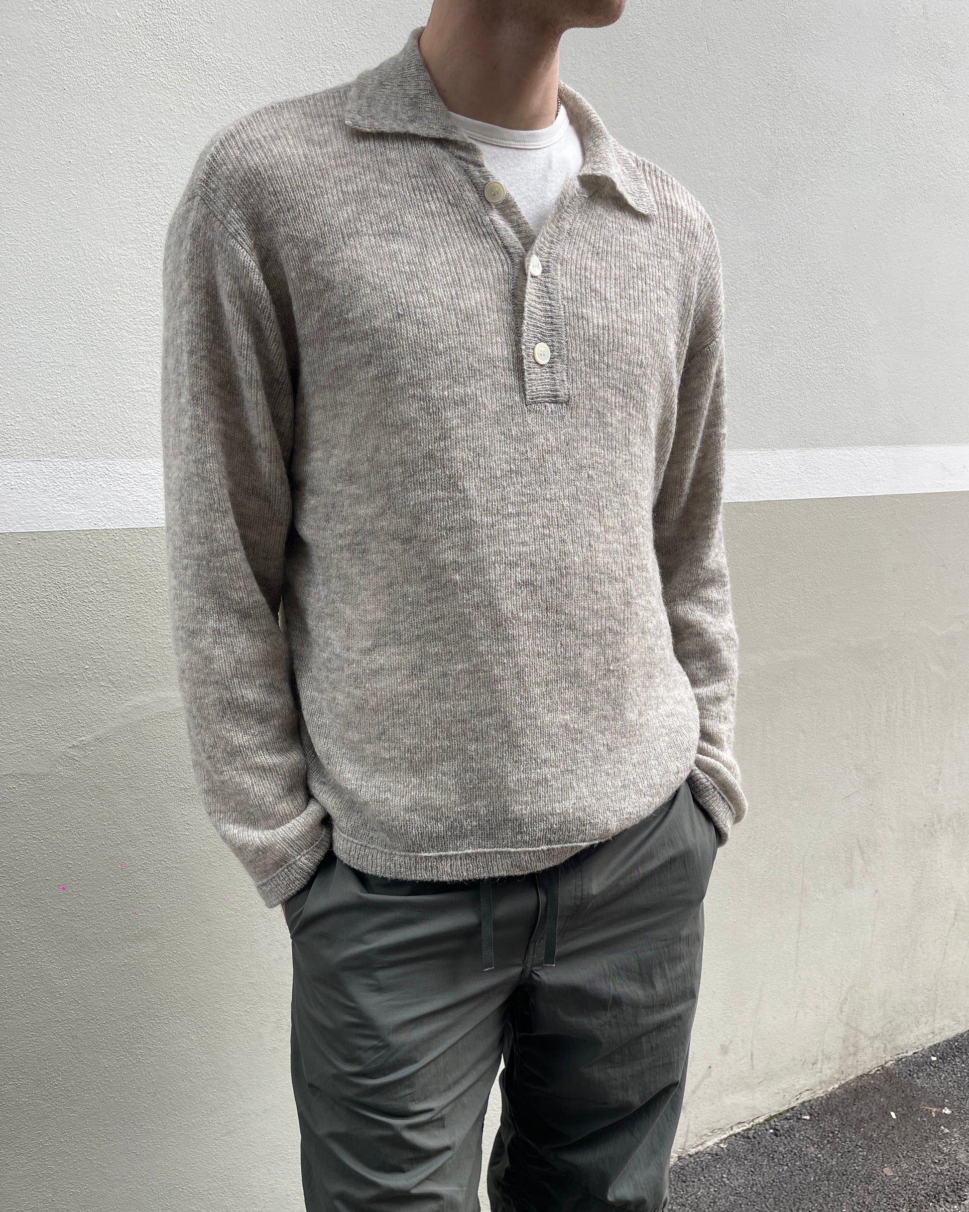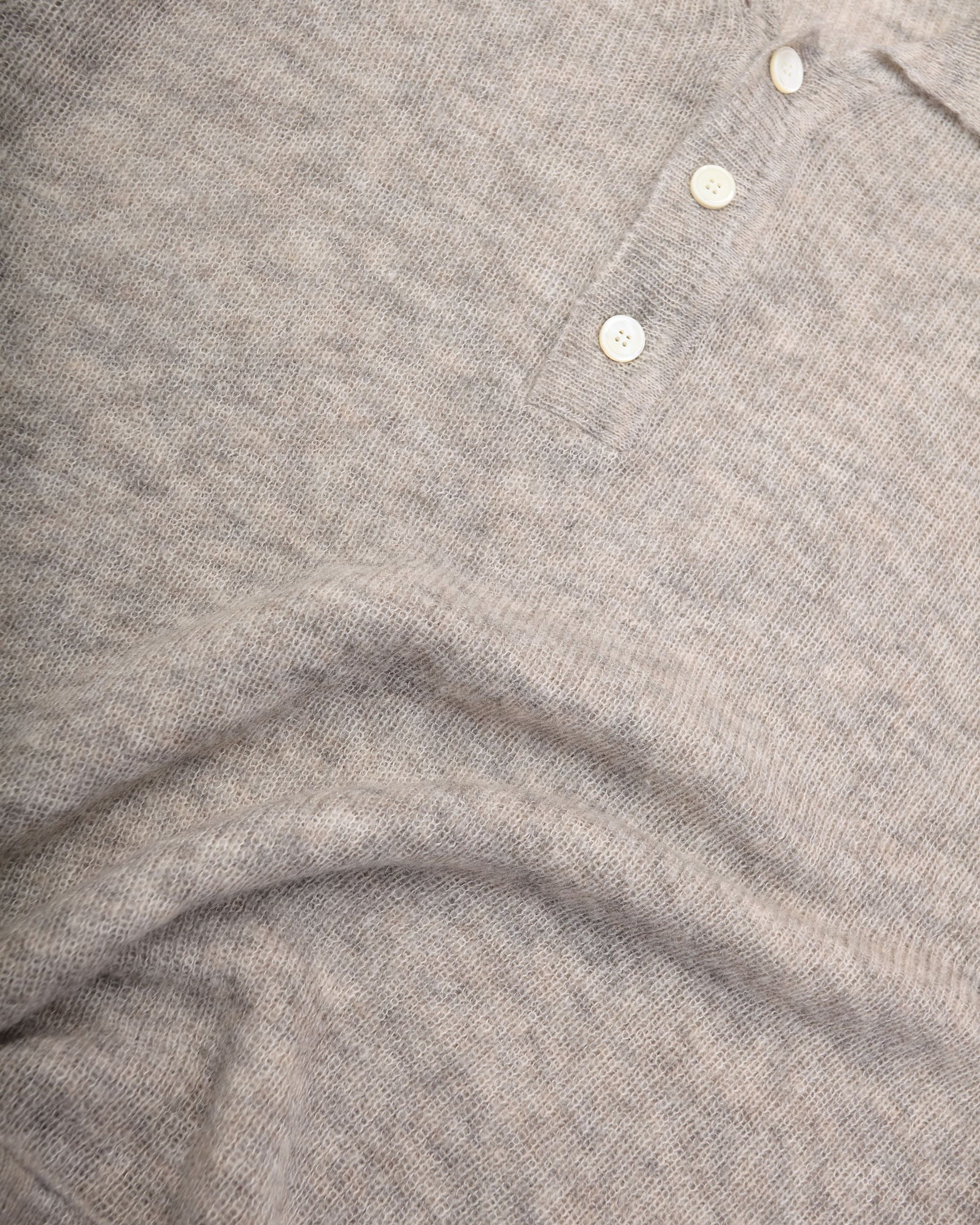 Maglia grigia con collo a polo, tre bottoni sul davanti, tessuto in maglia visibile.
