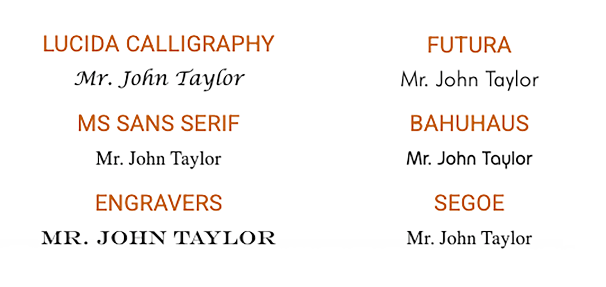Want to make your bag truly unique? We offer custom engraving with a text of your choice, such as your initials or name! The standard font for customization is Lucida Calligraphy, but you can choose another font from those shown in the image. Just select your preferred font from the dropdown menu.