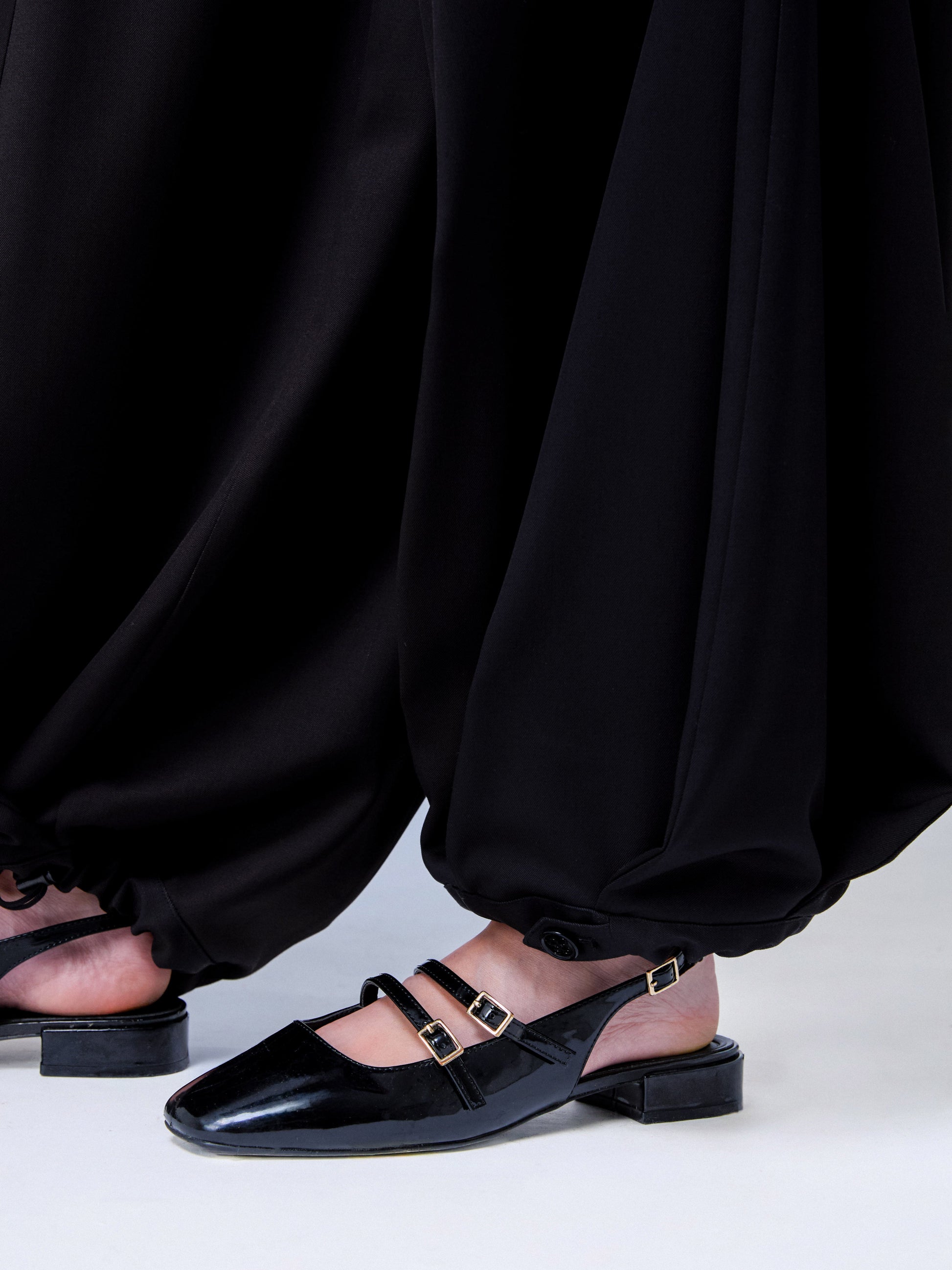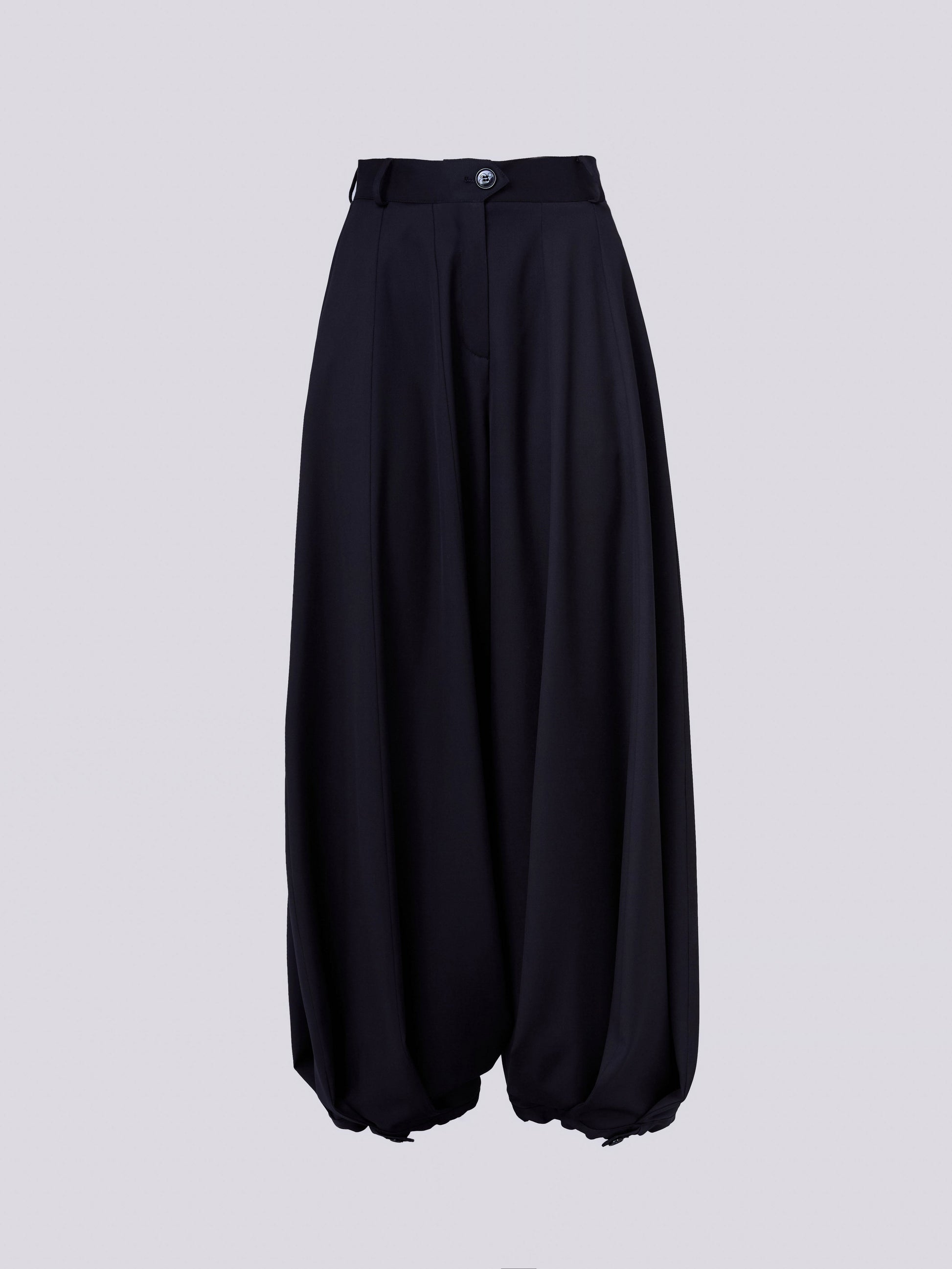 The Abby trousers showcase a sculptural silhouette with their high waist and rounded balloon legs, creating an elegant and striking shape.