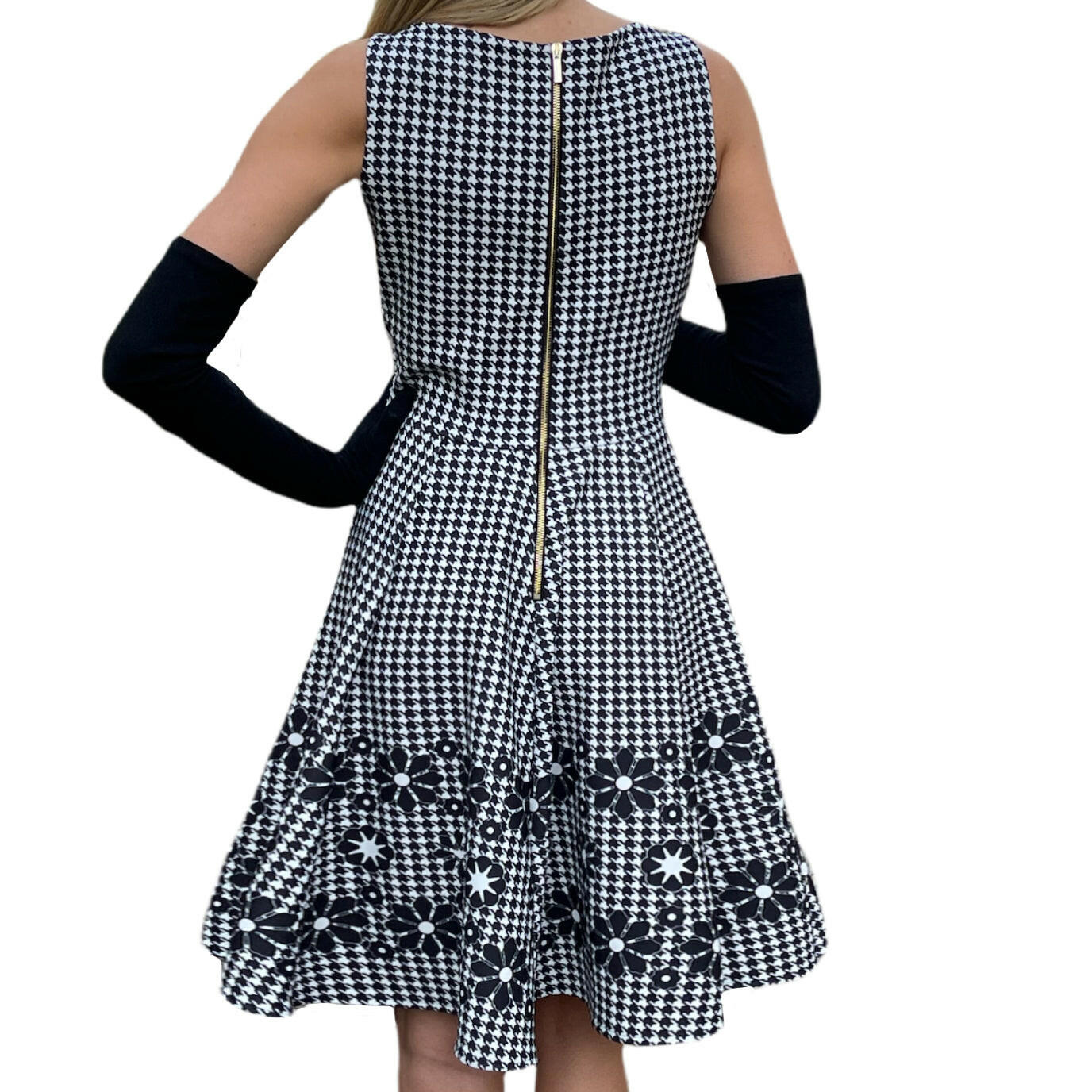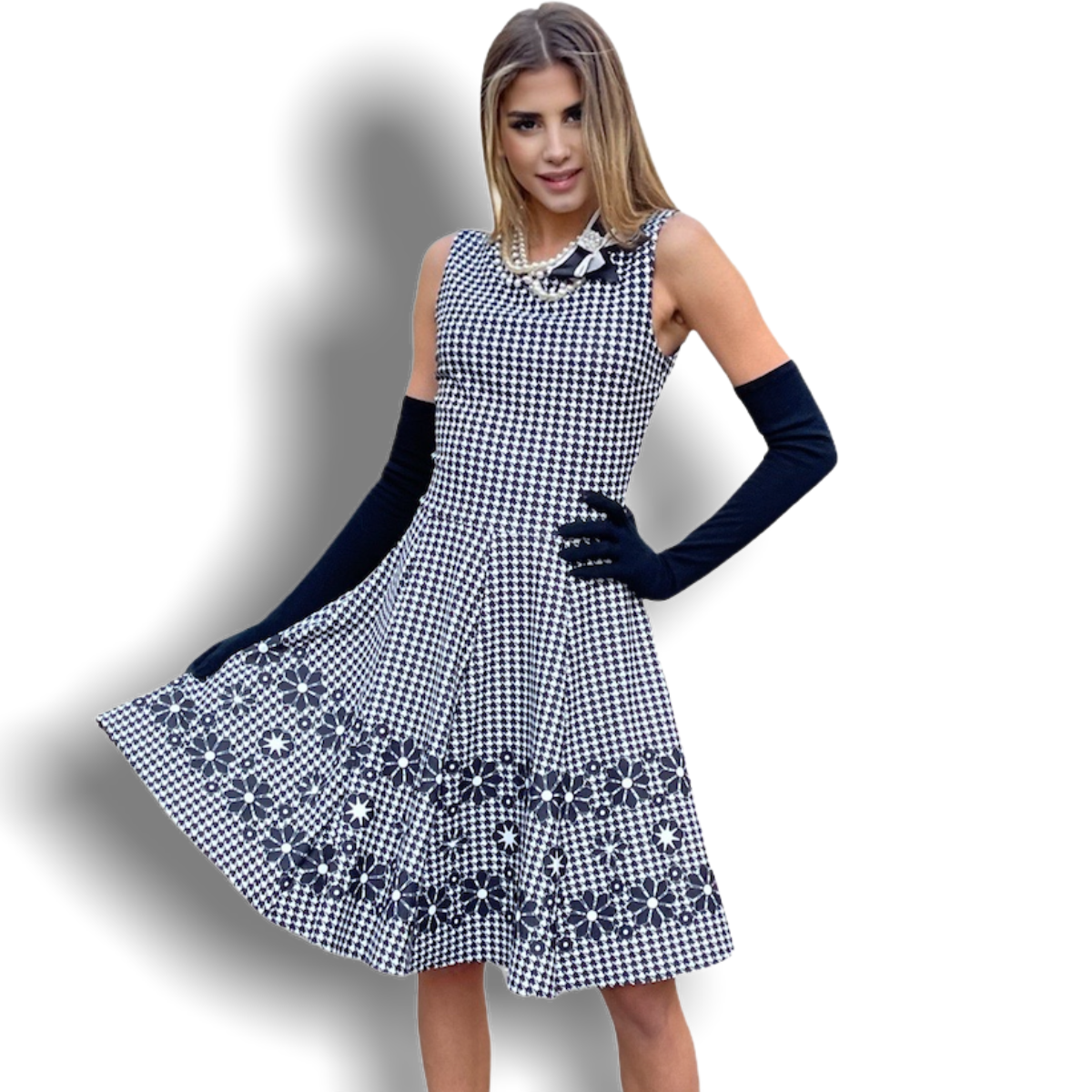 Abito stile anni 50' in disegno esclusivo fondo pied-de-poule e bordo di margherite stilizzate.