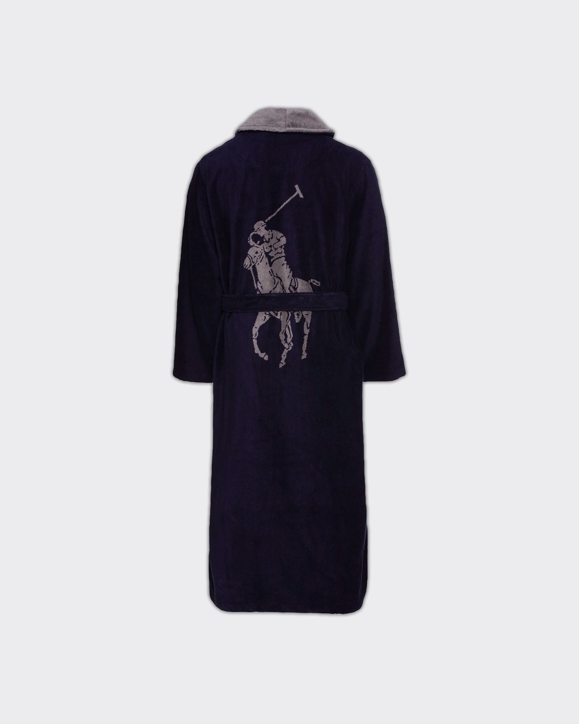 Accappatoio blu navy con logo sul petto e dettaglio sul retro, colletto a contrasto e cintura.