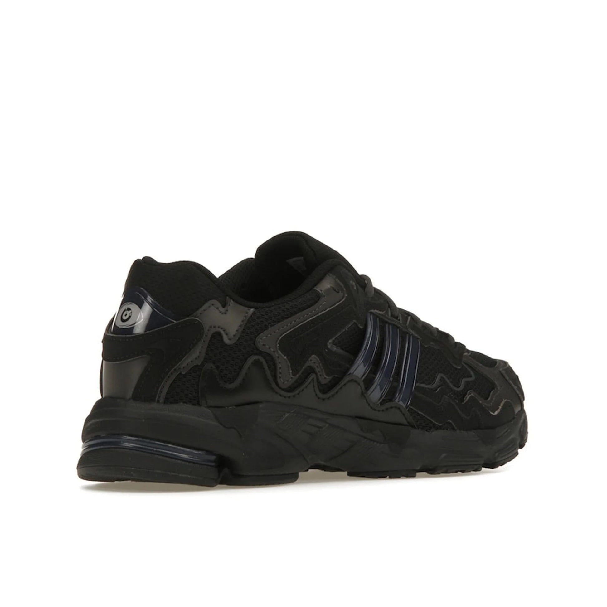 - Design Monocromatico: La tomaia è realizzata in mesh traspirante di colore nero, arricchita da sovrapposizioni in pelle sintetica con un effetto "fuso" che simboleggia la fluidità e la libertà espressiva di Bad Bunny. Le iconiche tre strisce laterali in TPU presentano una tonalità navy, aggiungendo un sottile contrasto cromatico.