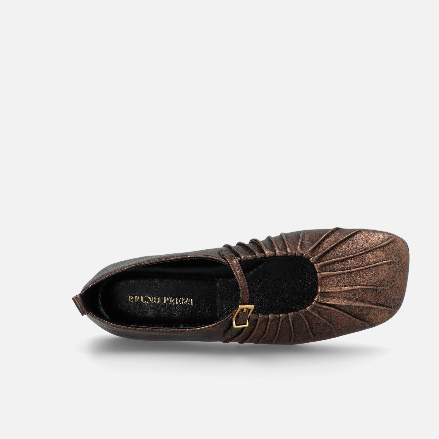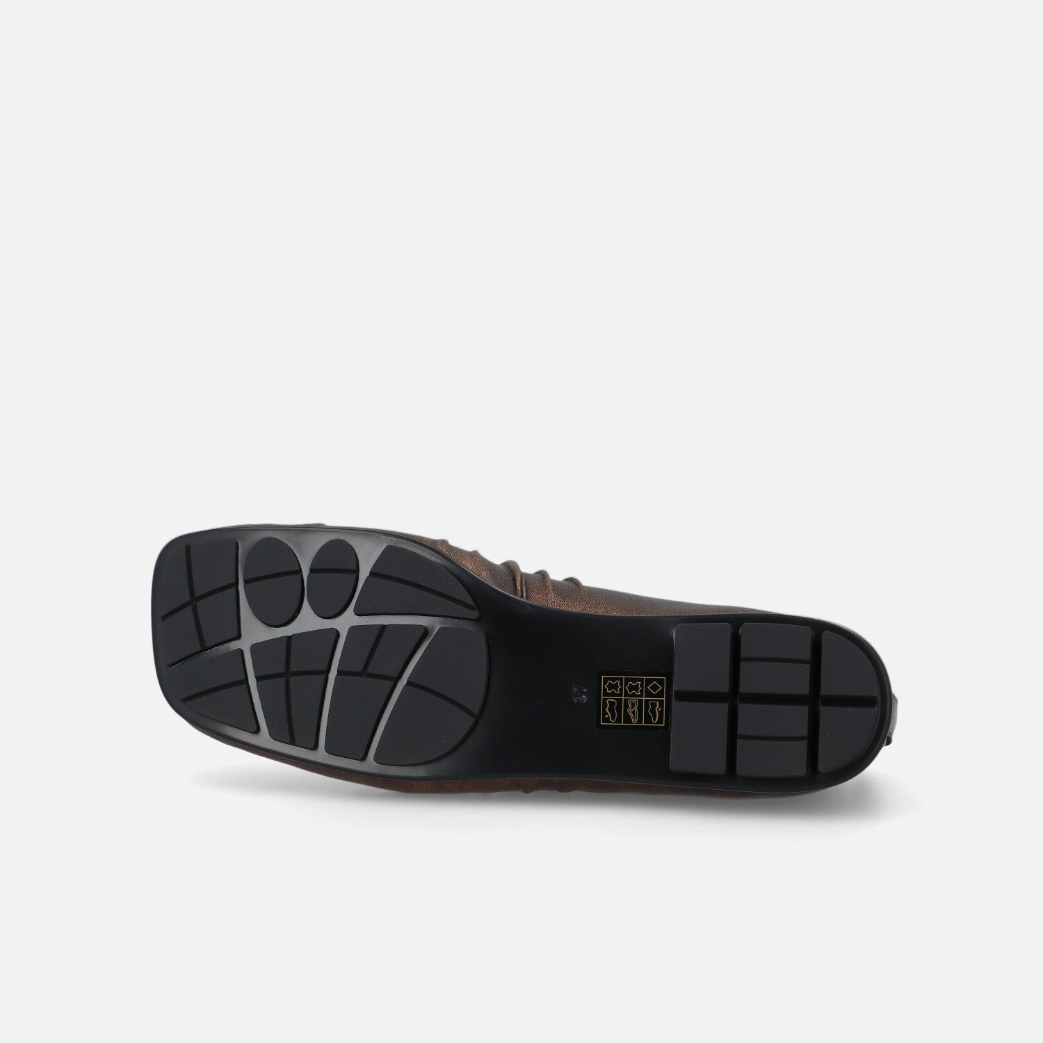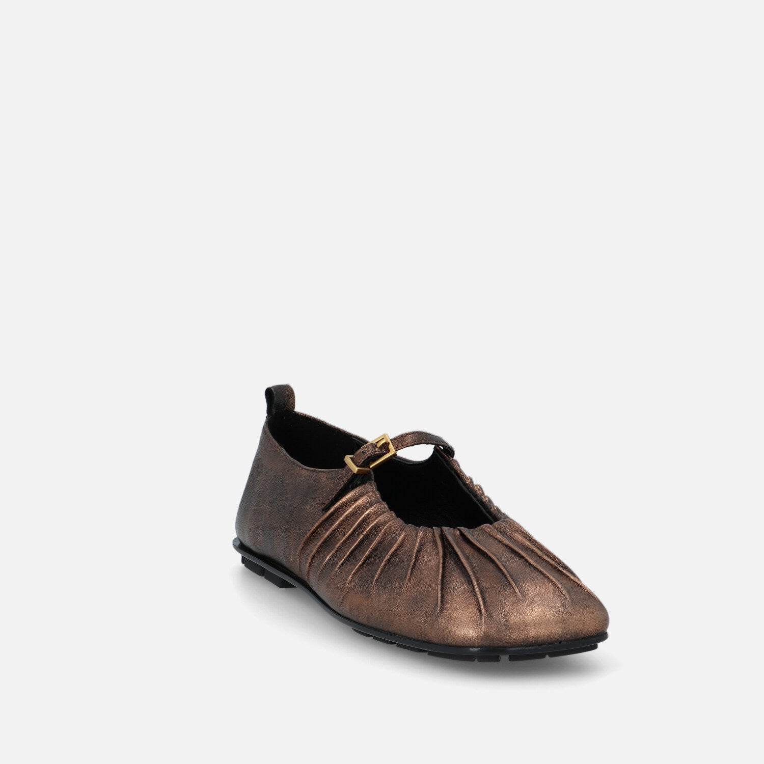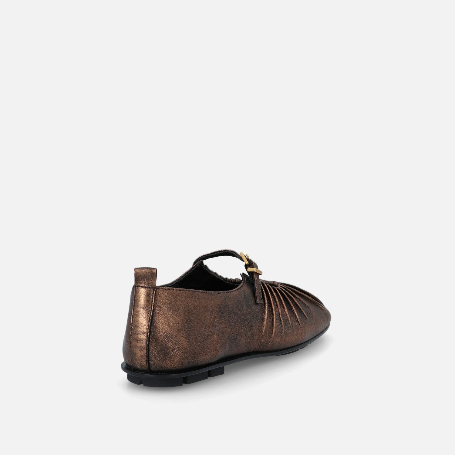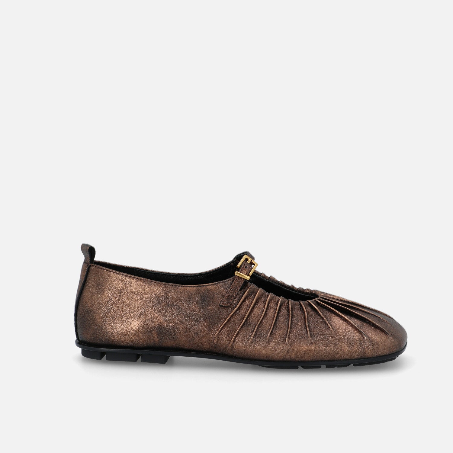 Baer Aveo è una ballerina a punta squadrata in pelle marmorizzata con effetto metal è un mix equilibrato di comfort, stile e ricercatezza. La tomaia è impreziosita da arricciature laterali, che creano un interessante gioco di volumi e texture. Il modello è completato da un cinturino sottile con micro fibbia dorata sul collo del piede e da una linguetta posteriore che ne facilita la calzata. La suola ultraflat in gomma con tasselli assicura praticità e grip. Un design originale e sofisticato, ideale per chi cerca una calzatura bassa con un tocco artistico e contemporaneo.