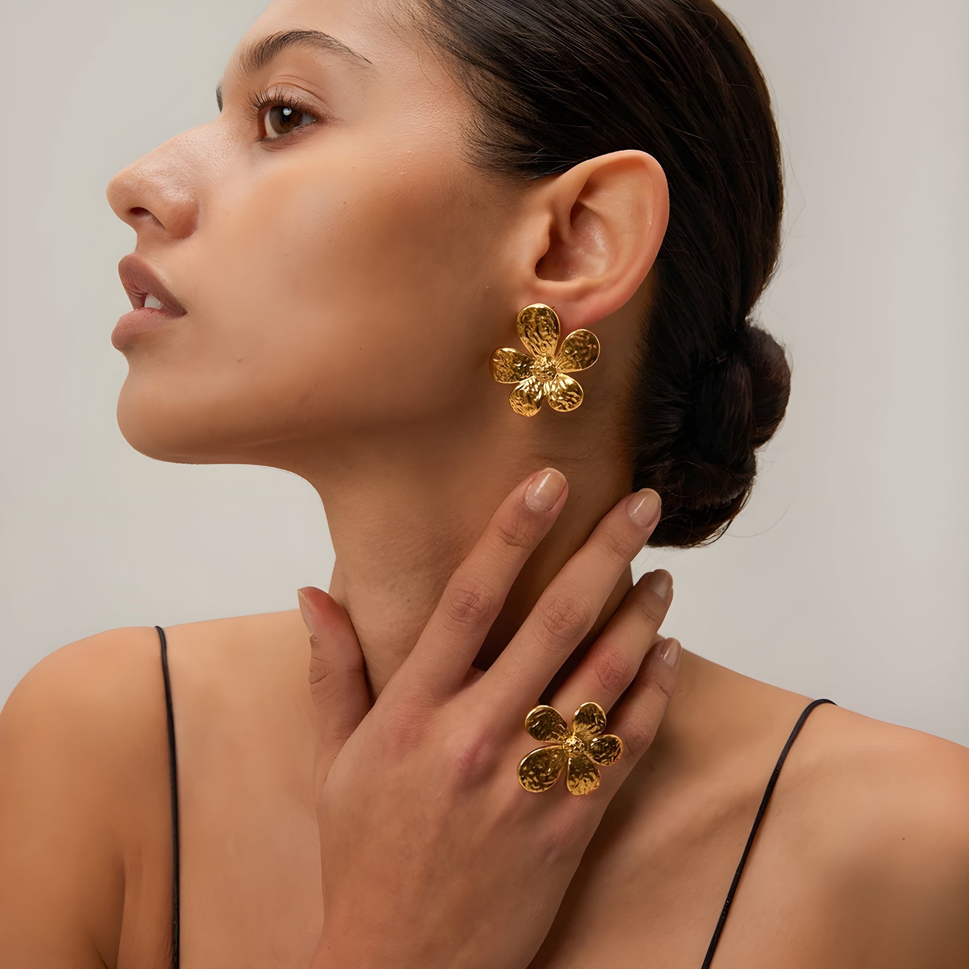 These earrings are designed in the shape of golden flower petals. The petals have a textured finish that gives them a hammered, organic look, adding depth and character to the design. The earrings are bold yet elegant, with the gold creating a bright, luxurious sheen that contrasts beautifully with the intricate details of each petal. This design gives off a vintage-inspired, yet modern vibe, making them suitable for both casual and more formal occasions.