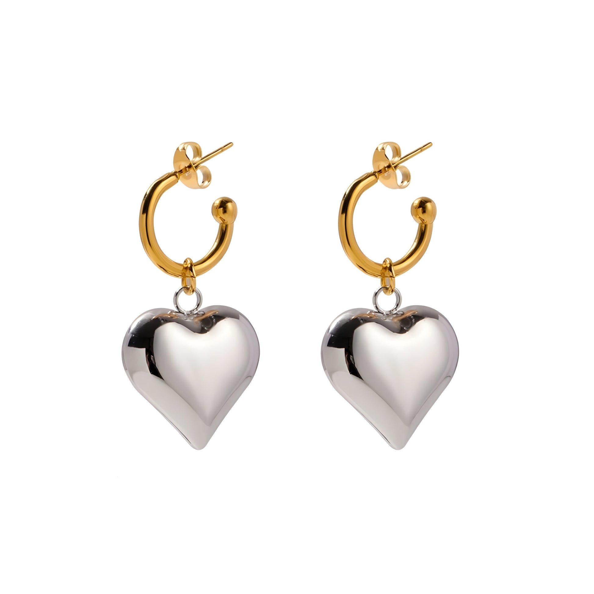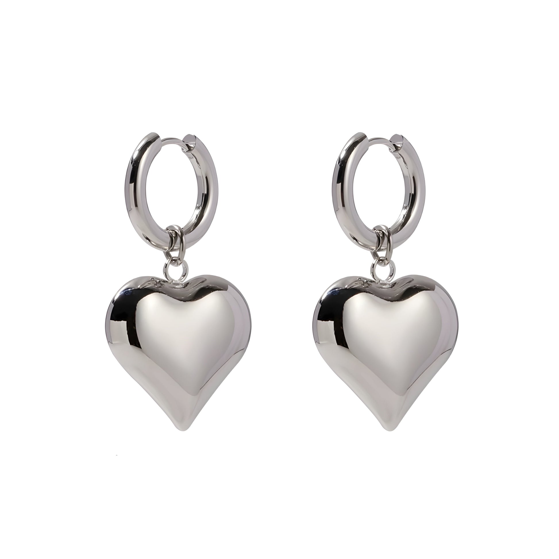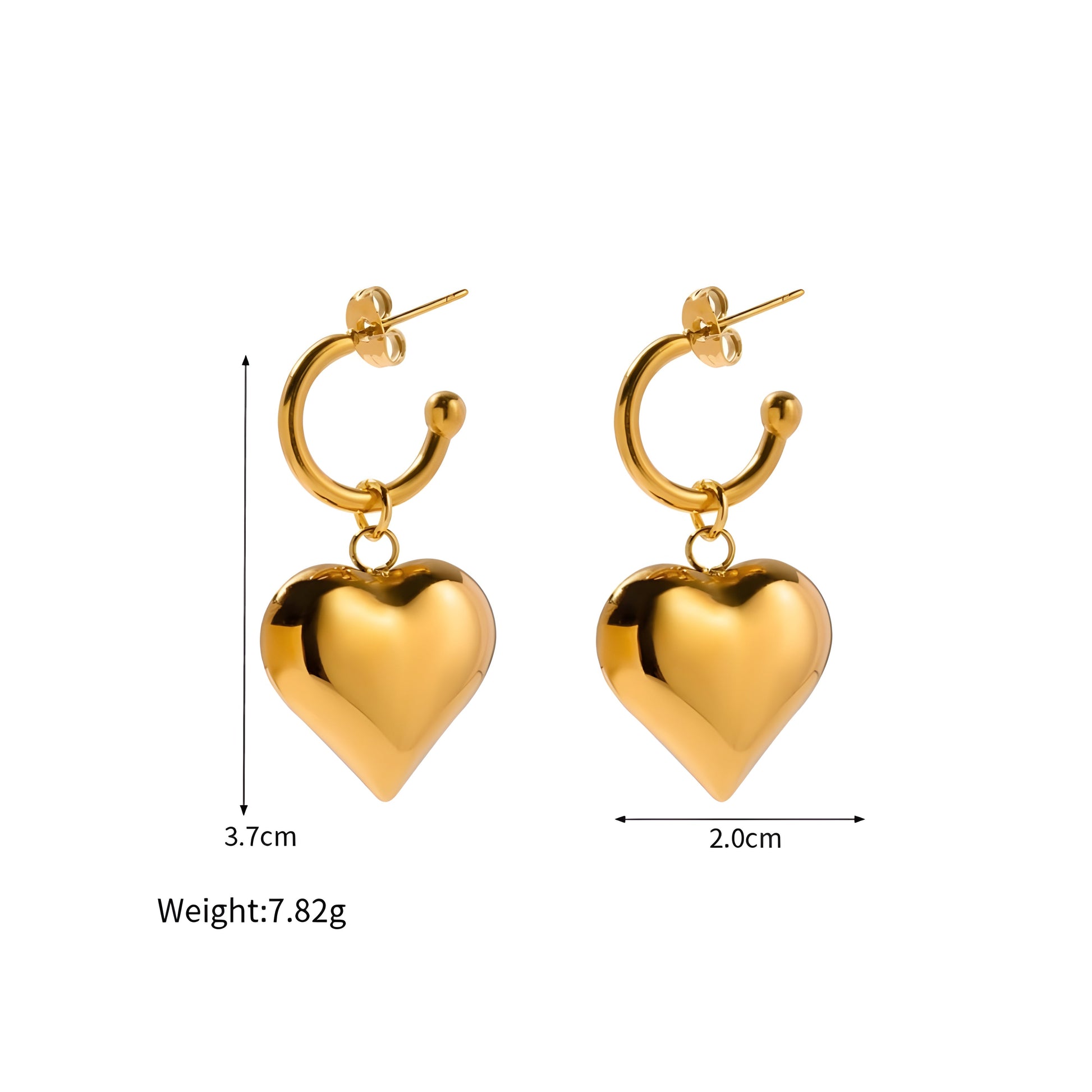 These earrings have a sleek and simple design, available in both gold and silver colors. Each earring features a large, sturdy hoop connected to a smooth, shiny heart-shaped pendant. The minimalist yet elegant design offers a modern take on classic beauty.