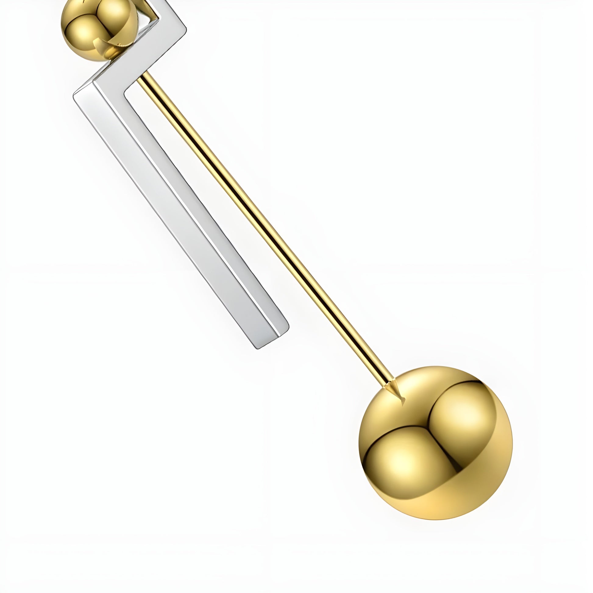 These earrings have a minimalist and modern design. The combination of different metals creates contrast and visual appeal. One part of the earring features a geometric structure with clean, angular lines in silver, while a large golden ball hangs at the bottom of each earring. This symmetrical design creates a chic and artistic look that can be paired with various styles.