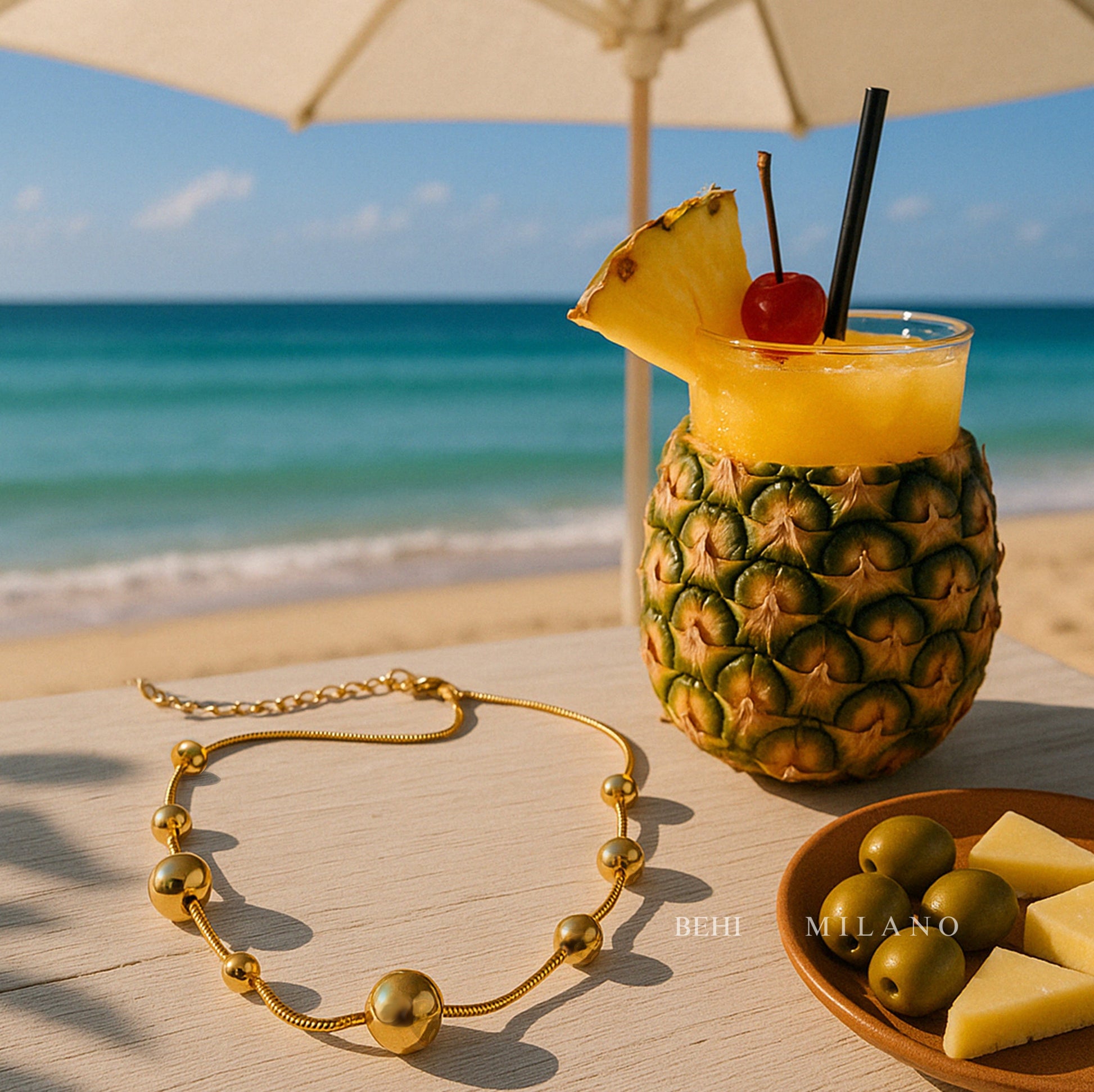 This necklace features a minimalist and chic design, making it a perfect choice for both casual and formal styles. The thin gold chain is beautifully complemented by glossy round beads, creating a harmonious contrast with the delicate, slender bars. The evenly spaced beads add a modern and elegant touch, while the textured details of the gold wires offer a unique and refined look.