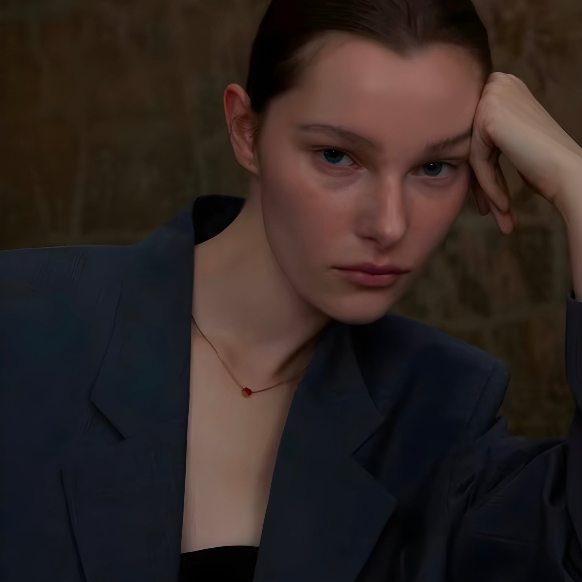 This necklace features a delicate design with a heart-shaped pendant made from smooth, glossy material in a rich red hue. The simple and refined shape of the heart adds a subtle yet bold touch to the overall aesthetic. Its sleek gold-tone chain complements the pendant perfectly, creating a harmonious balance of luxury and elegance.