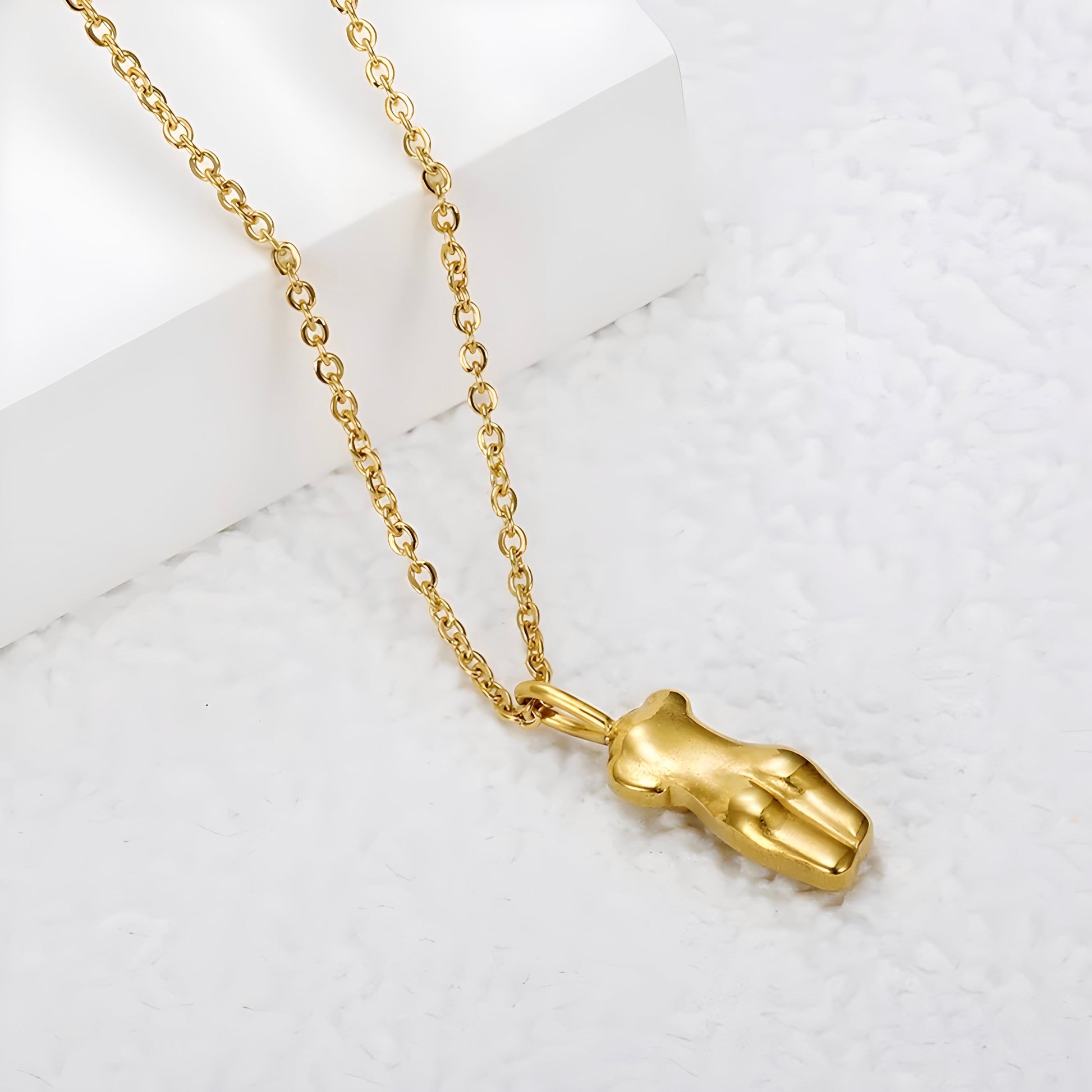 The necklace in the image features a delicate, sculpted pendant resembling a stylized human torso. Its sleek and minimalistic design is made from gold, providing a sophisticated and elegant look. The necklace chain is fine and complements the modern aesthetic of the pendant. The shiny finish of the pendant adds to its refined and luxurious appearance.