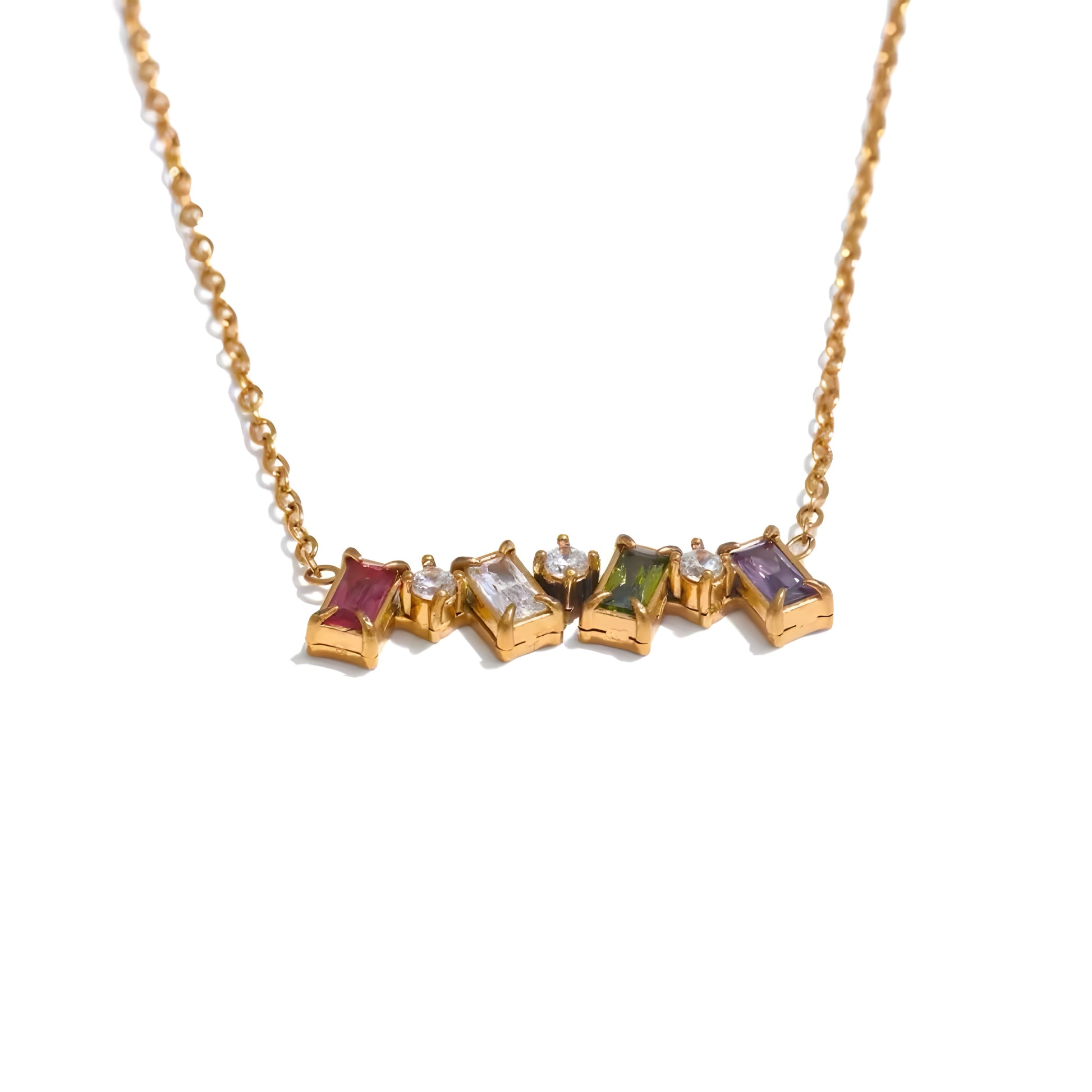 These charming gold necklaces feature an elegant design with a series of rectangular gemstones, each in a different vibrant color. The gemstones are framed in gold settings, providing a beautiful contrast against their striking colors, which include green, clear, pink, and purple. The stones are arranged neatly in a row, each separated by small clear diamonds, creating a sparkling, sophisticated touch.