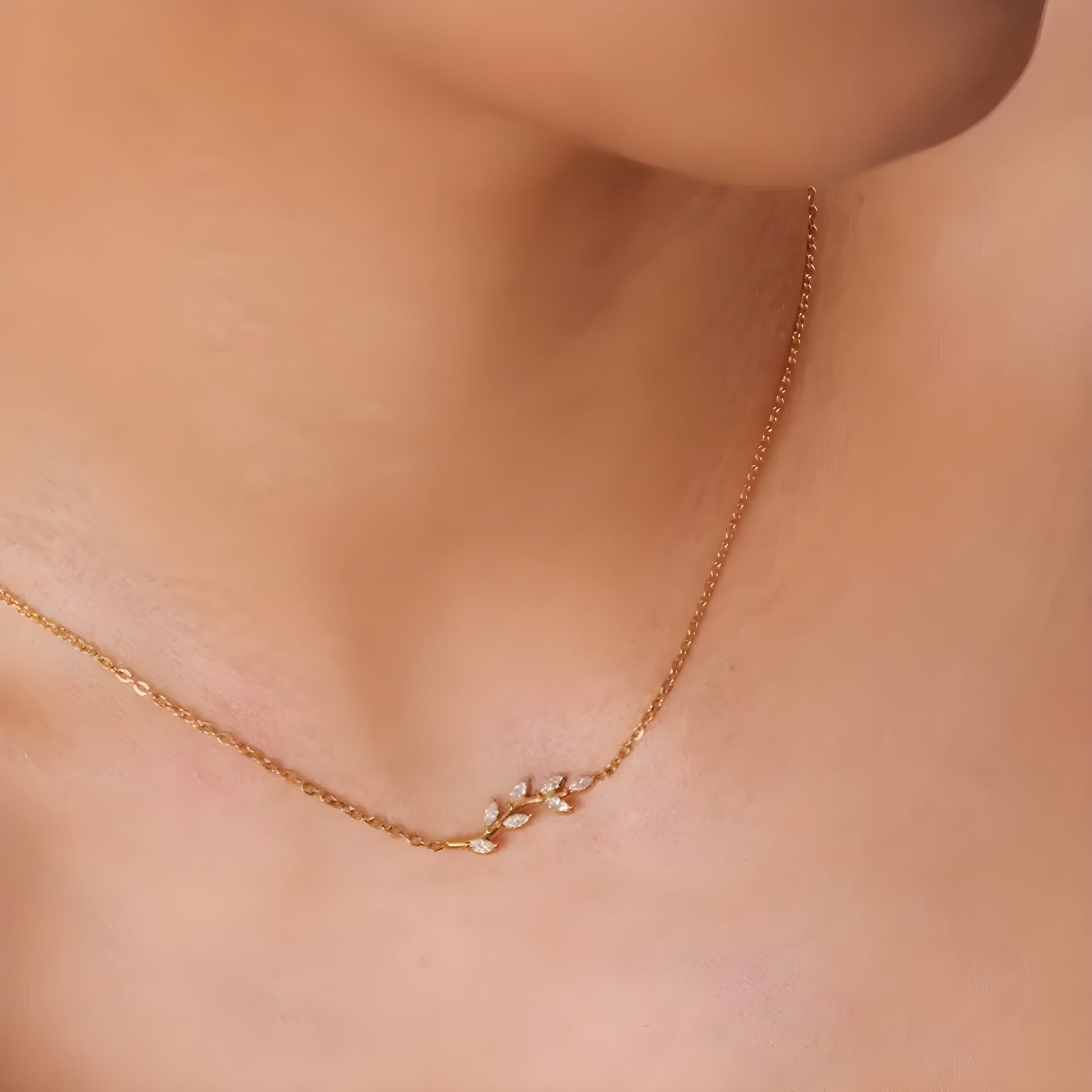 The necklace shown is a minimalist design featuring a delicate gold chain with a pendant that resembles a small branch. The branch is adorned with clear gemstones, arranged in a simple yet elegant way. The gold finish adds sophistication to the piece, while the design itself evokes a natural and organic feel, ideal for those who enjoy understated, nature-inspired jewelry.