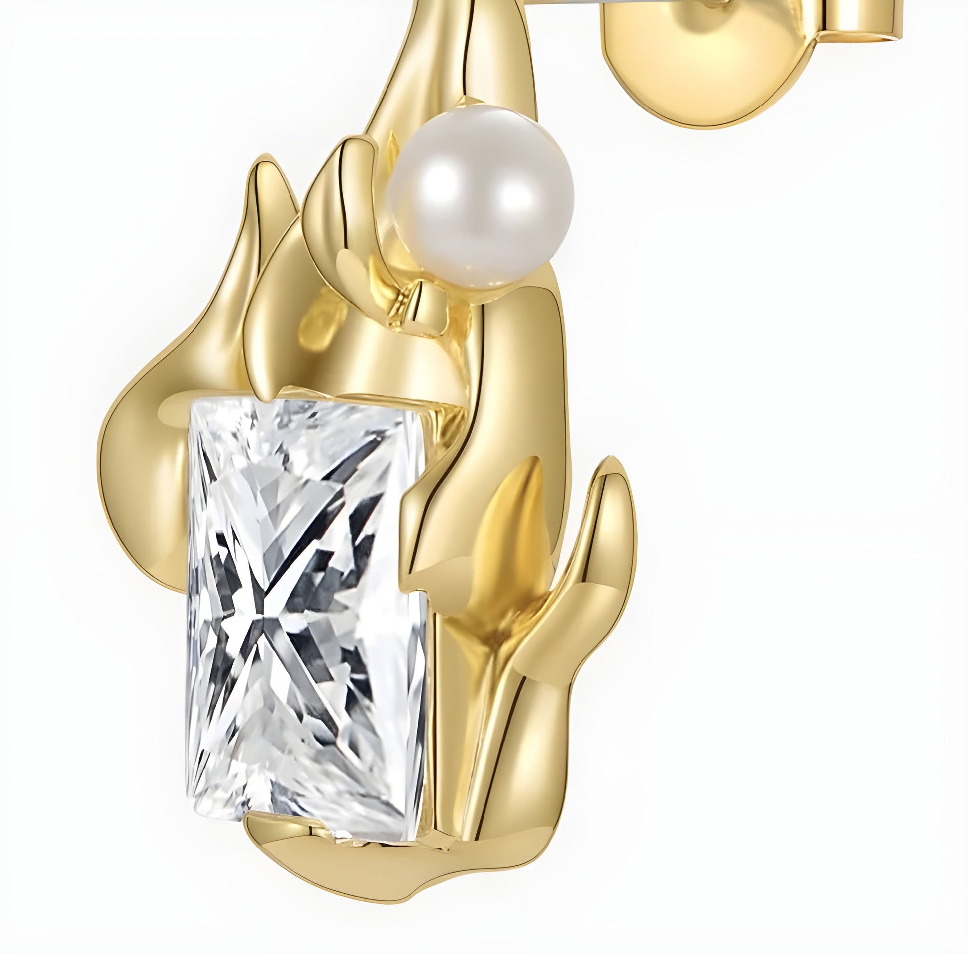 This earring from the BEHI Collection is crafted with exceptional precision and delicacy, featuring a unique, asymmetrical design where every detail is artistically crafted. The use of gemstones for added allure, combined with symbols of the flame of fire and pearls, imbues the piece with deep meaning and symbolism. Its modern and chic design embodies strength and beauty, making it an ideal choice for those who appreciate jewelry with a profound and captivating concept.