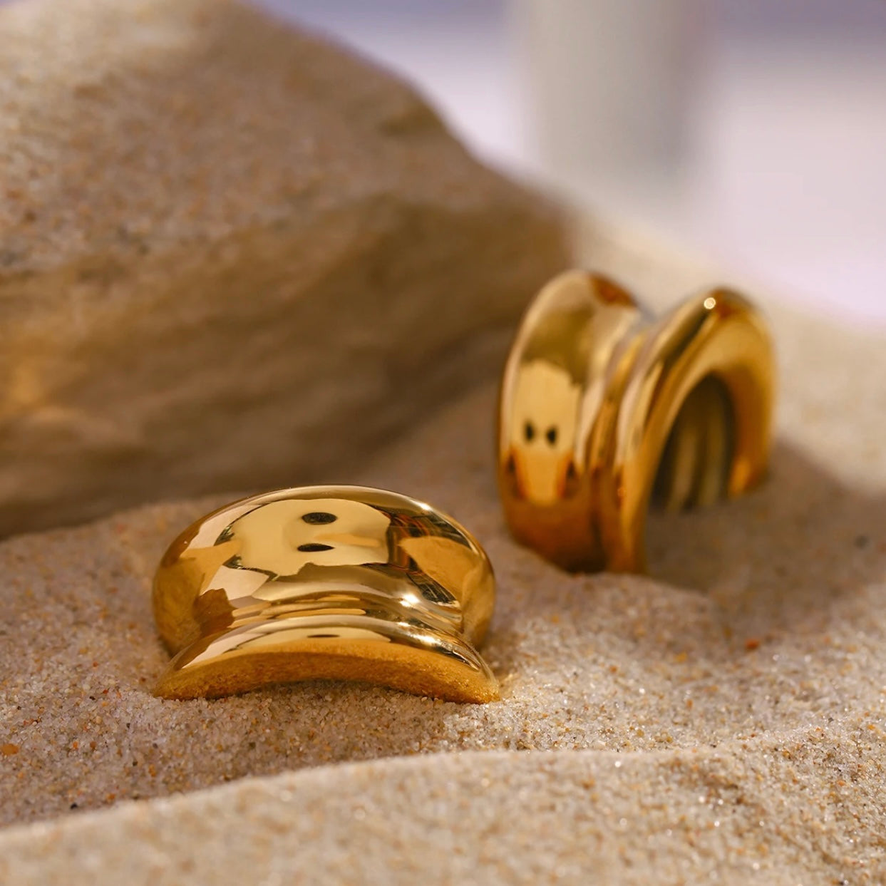 These earrings are earcuffs with a sleek and modern design. They consist of several interconnected golden rings that are smooth and shiny. These earcuffs easily wrap around the ear, creating a bold yet luxurious look with their unique and intricate shape.