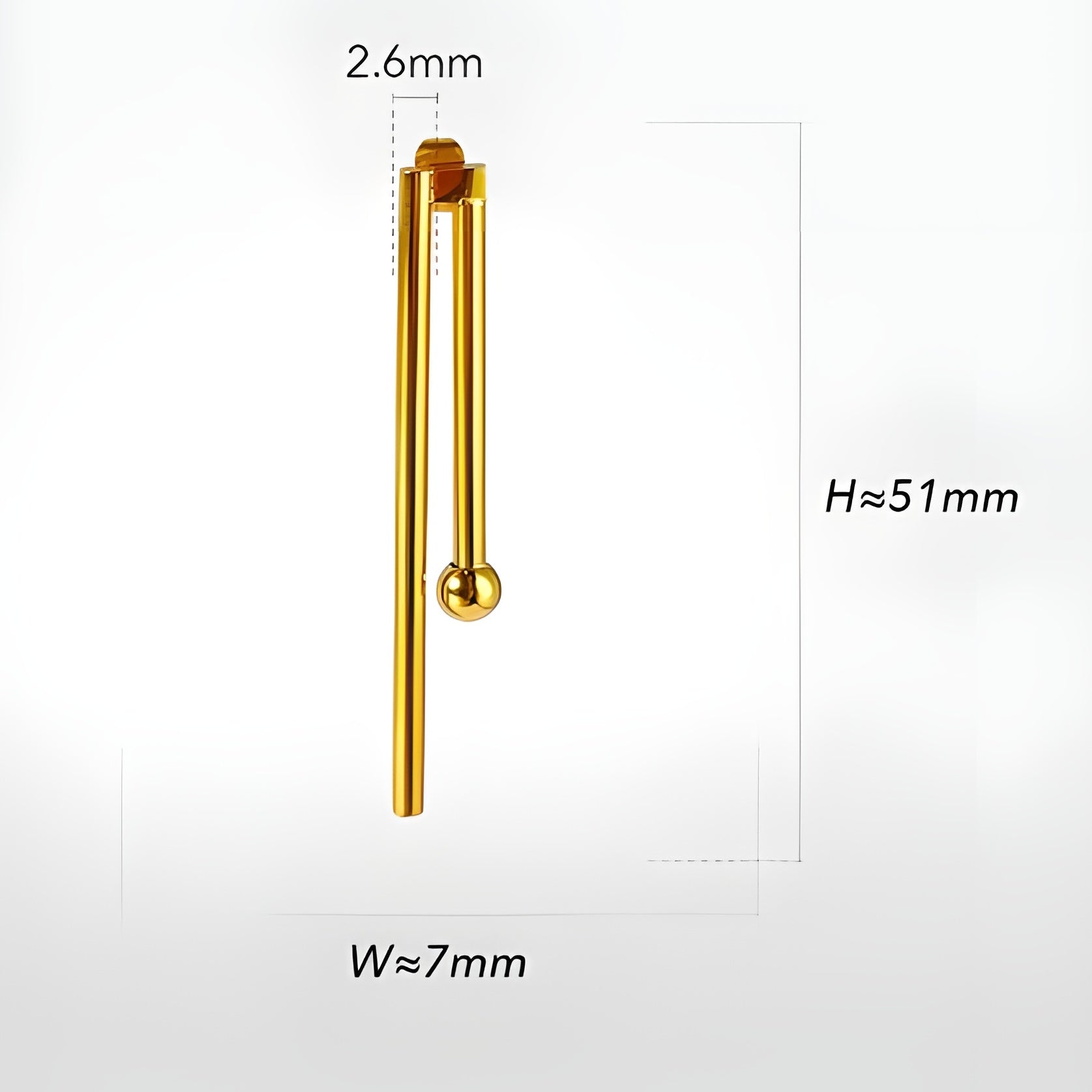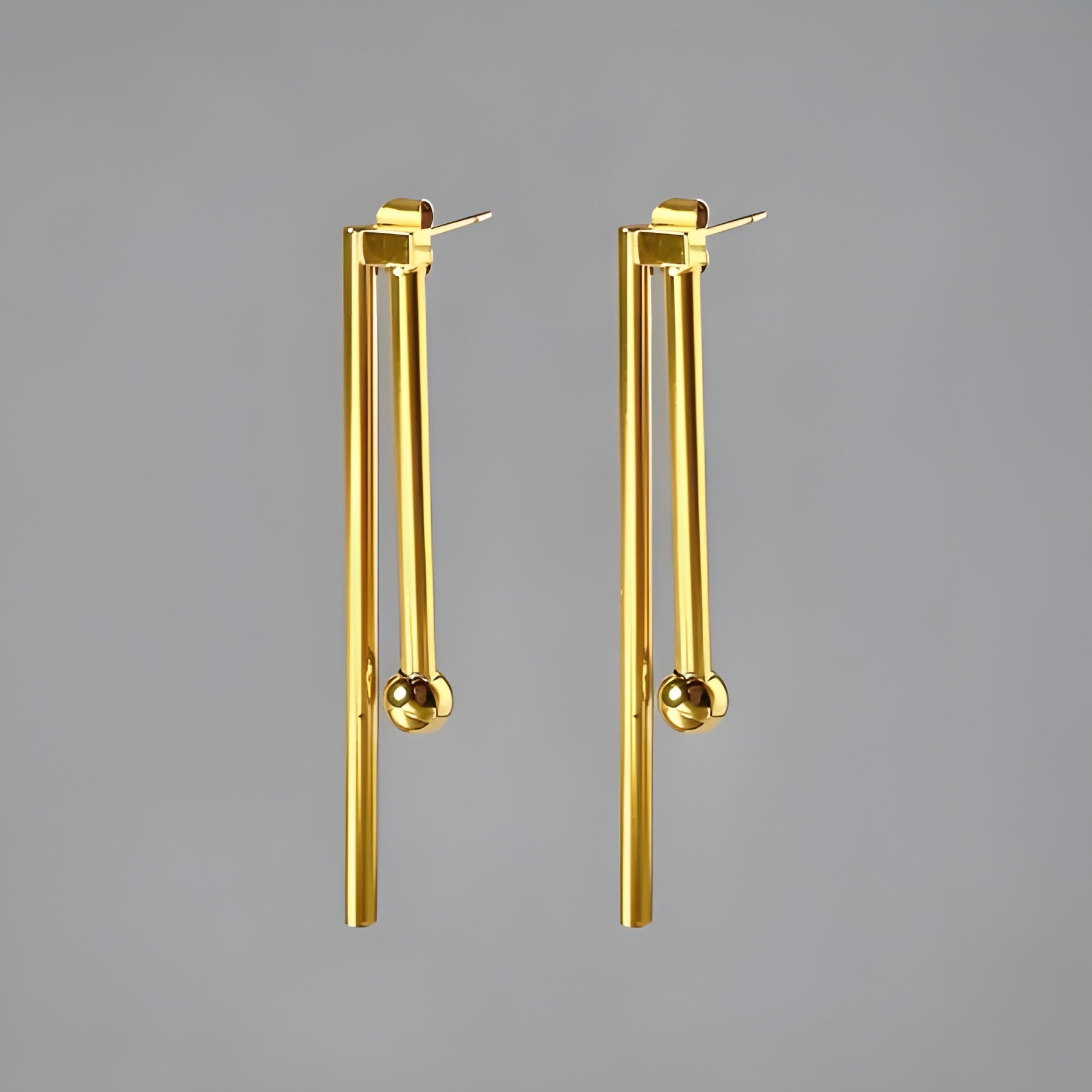 This simple and modern earring from the BEHI COLLECTION showcase a sleek and modern aesthetic, crafted in polished gold. Each earring is made up of two slim vertical bars of different lengths, one of which ends with a small golden sphere. The clean lines and asymmetrical balance create a minimalist yet artistic vibe.