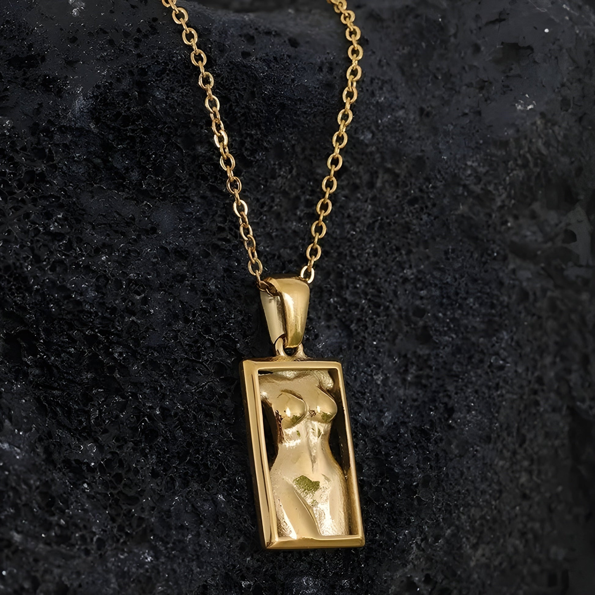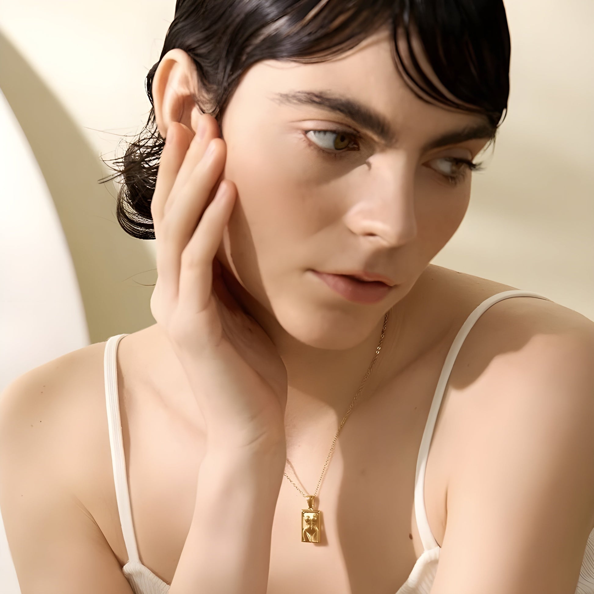 This necklace features a rectangular pendant showcasing a sculpted figure of a woman’s torso in gold-tone metal. The pendant’s design is bold, modern, and artistic, with a smooth, polished finish giving it an elegant yet contemporary appearance. The chain is simple, complementing the pendant without overpowering it. This necklace captures a sense of modern femininity and strength, blending artistry with fashion.