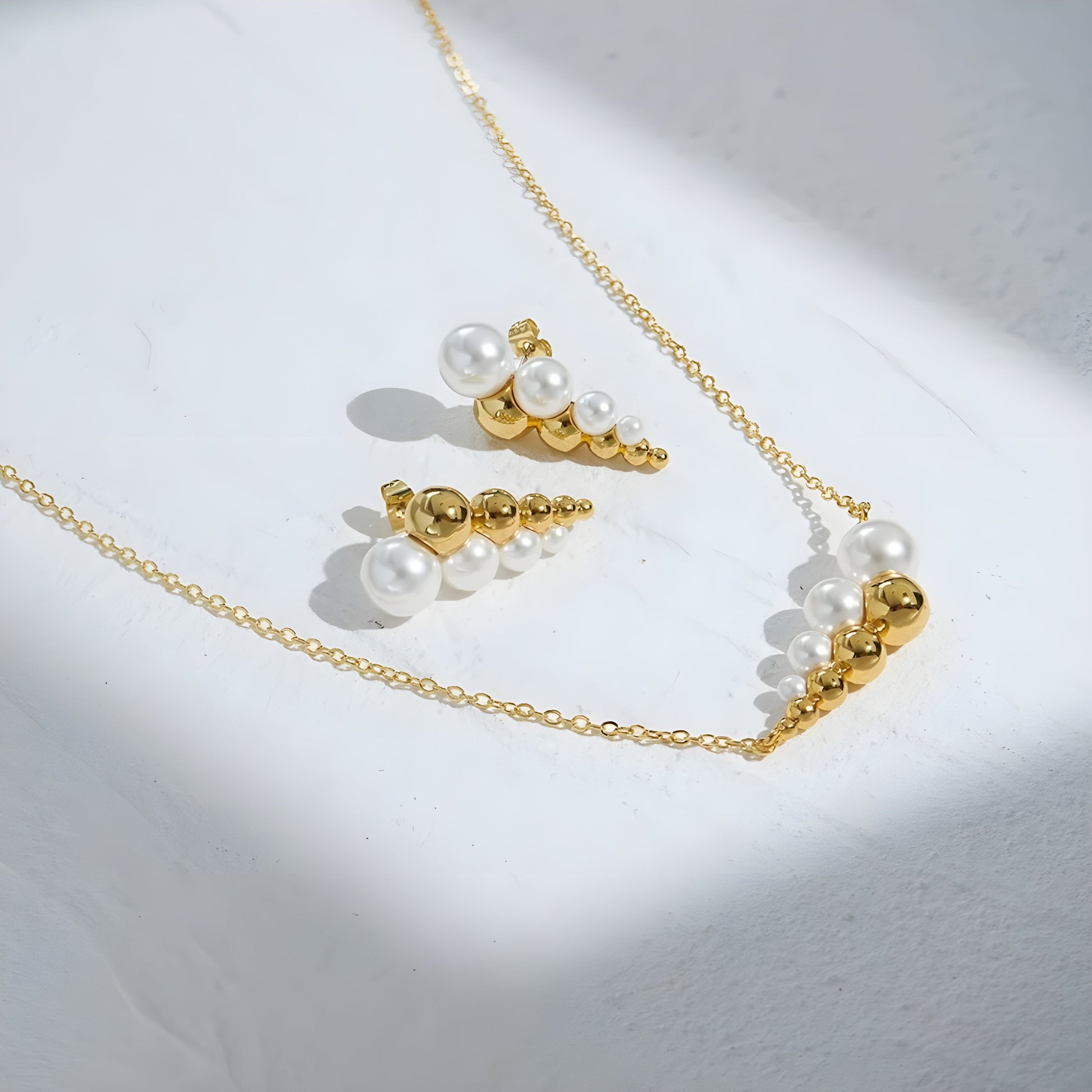 This exquisite earring from the Behi Collection, crafted from a combination of large and small golden spheres and pearls, adds a sense of grandeur and uniqueness to your style with its elegant and eye-catching design. This masterful piece harmonizes perfectly with chic and classic styles and can be paired with the matching necklace from the same collection, effortlessly drawing attention in every moment.