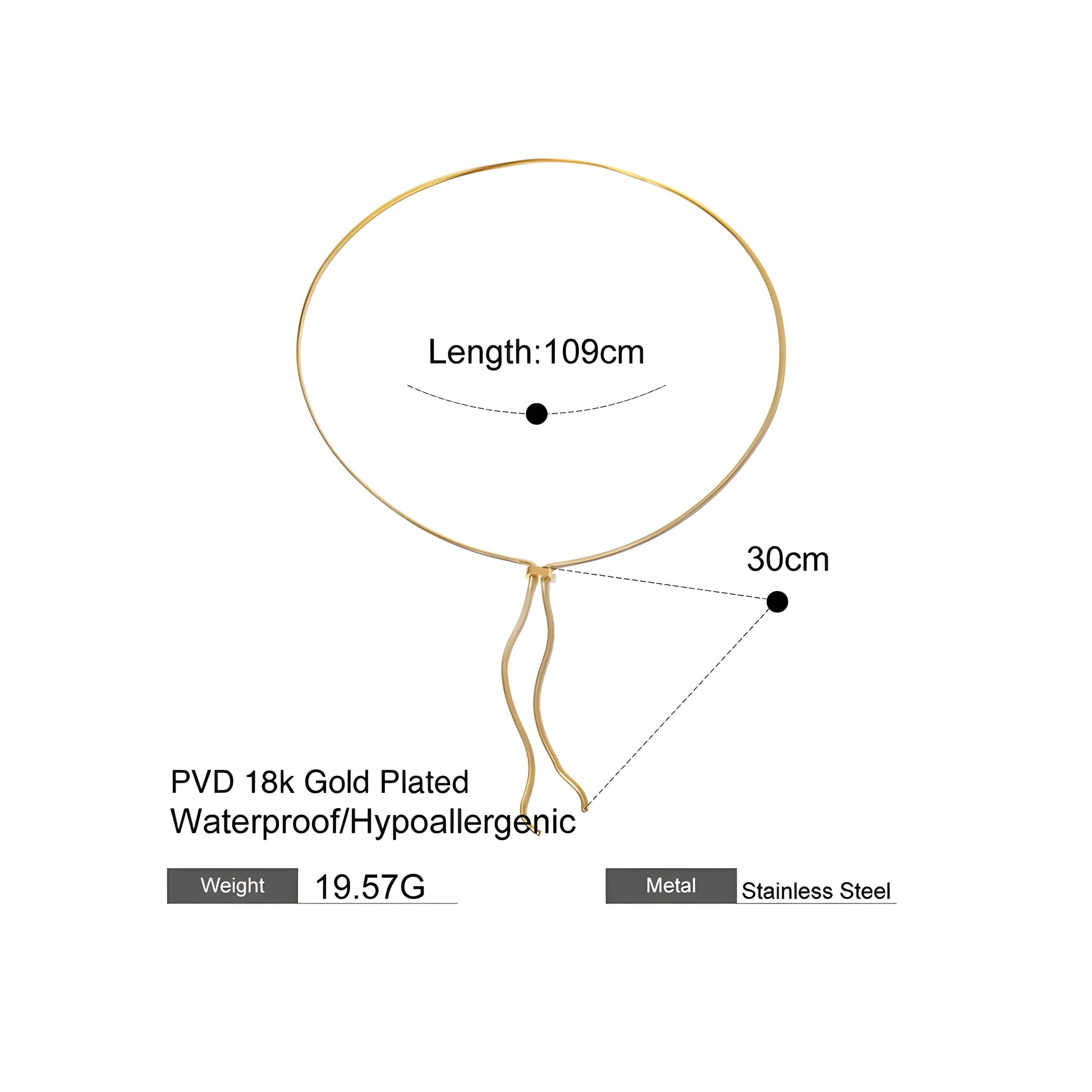 This necklace features a stunning serpentine design with a sleek and modern aesthetic. The piece is crafted with a smooth, gold-plated finish, and the central feature is a unique loop at the top that seamlessly transitions into two flowing, twisted strands of metal, creating a soft, elegant movement. The intertwining strands cascade down in a fluid, graceful manner, offering an elegant and sophisticated look.