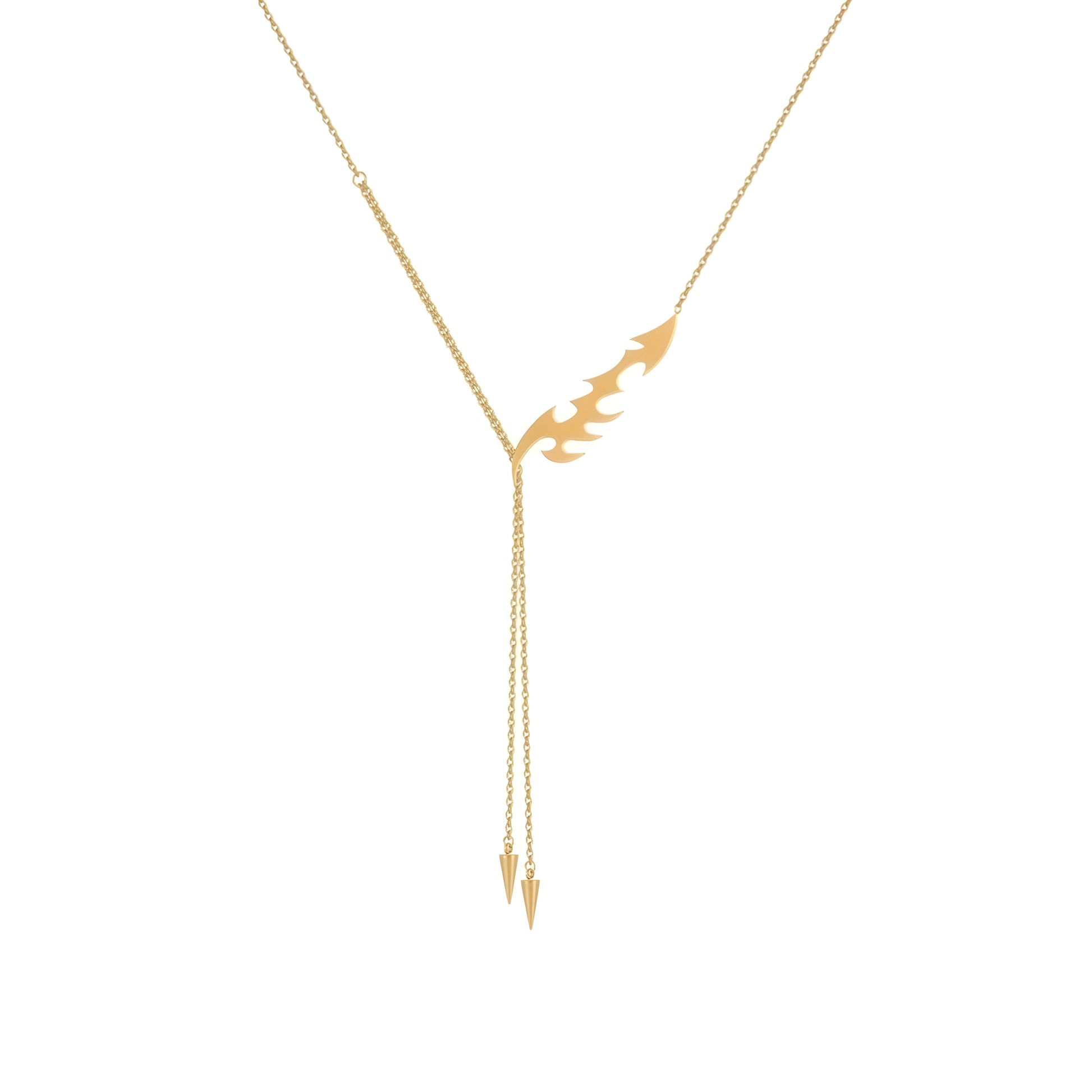This Behi Milano necklace blends modern design with symbolic elegance. The delicate gold chain features an abstract flame or leaf-shaped pendant, creating a bold yet refined look. Its asymmetrical Y-shape, with a long dangling chain, adds a stylish and eye-catching touch. This piece is perfect for those who appreciate unique, unconventional jewelry and pairs beautifully with minimalist outfits.