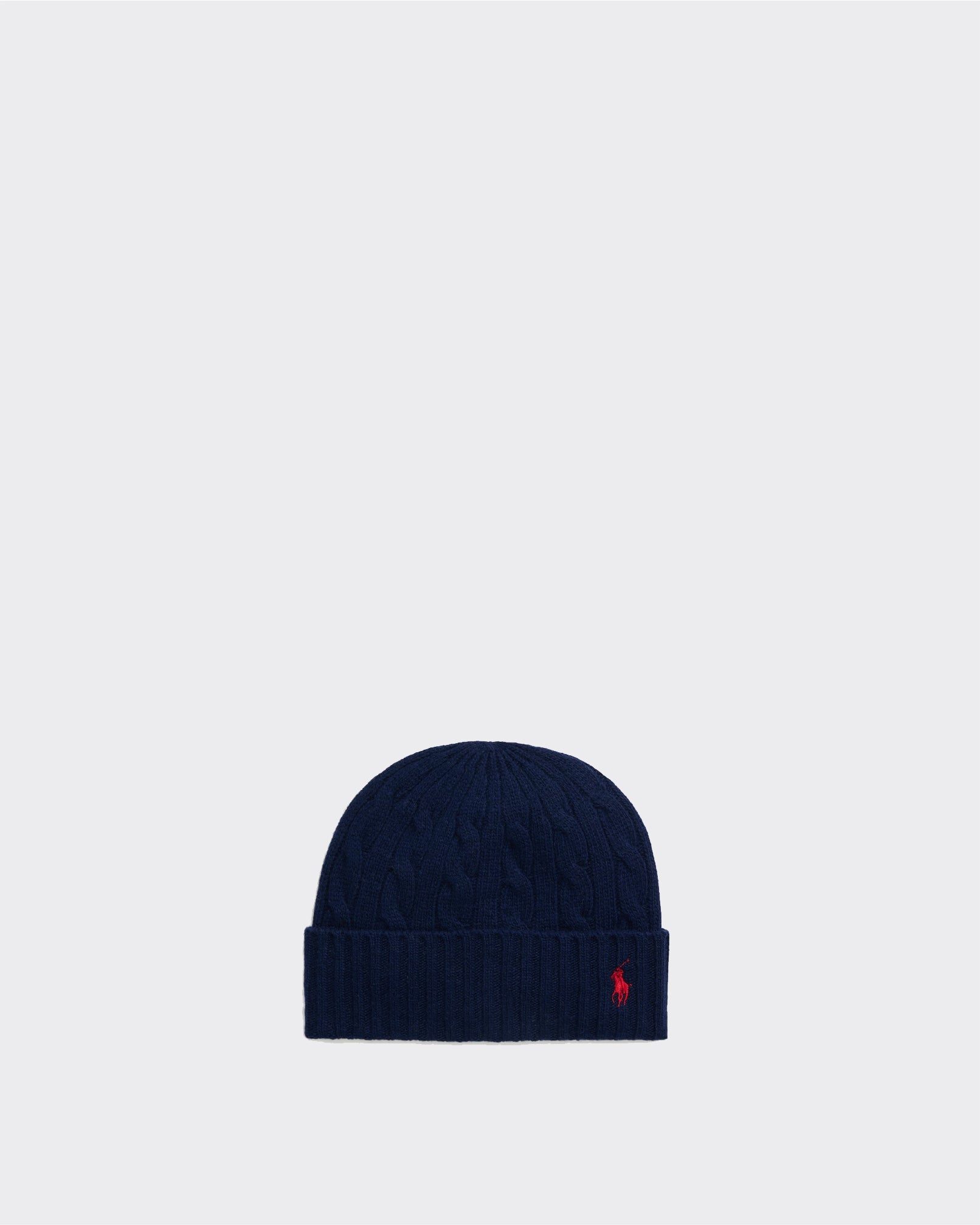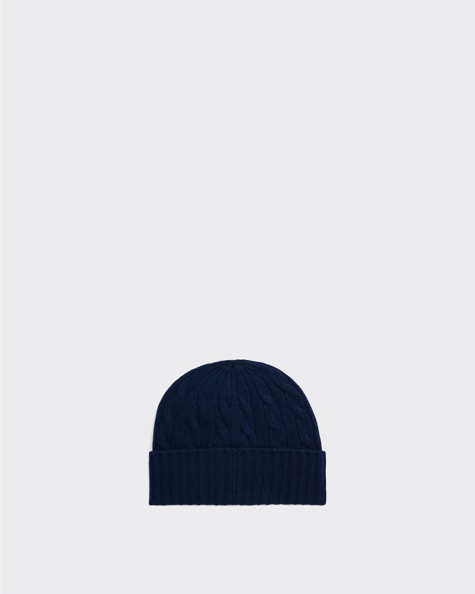 Berretto in maglia a trecce di colore blu navy con logo ricamato.