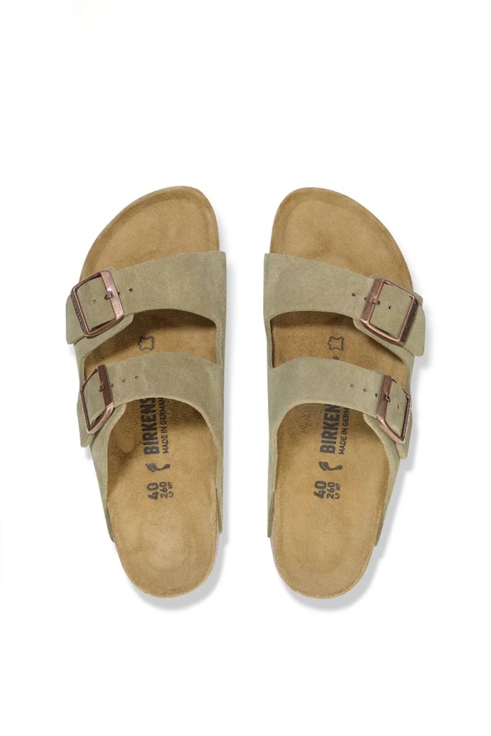 Il sandalo BIRKENSTOCK Arizona si distingue per la straordinaria comodità e il look naturale e casual. La tomaia in soffice pelle scamosciata avvolge il piede come una seconda pelle, mentre il plantare anatomico in sughero e lattice assicura un sostegno ottimale a ogni passo. Il sottopiede, anch’esso in morbida pelle scamosciata, e la suola in EVA garantiscono leggerezza e comfort. Completa il tutto la doppia fibbia in metallo, regolabile per una calzata personalizzata. “Made in Germany”.