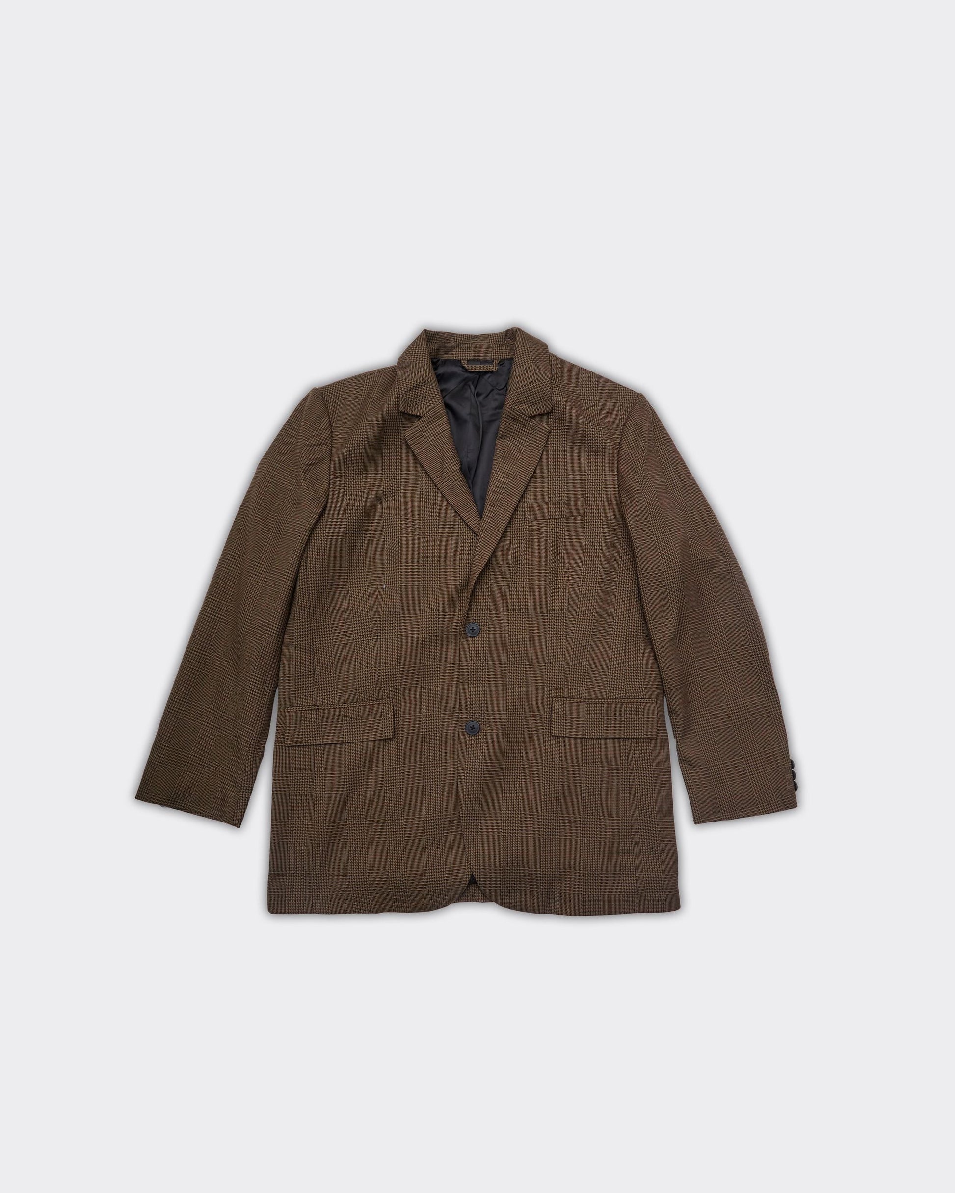 Blazer marrone con motivo pied-de-poule, tessuto a quadri. Presenta tasche a pattina sul davanti e un bottone centrale.
