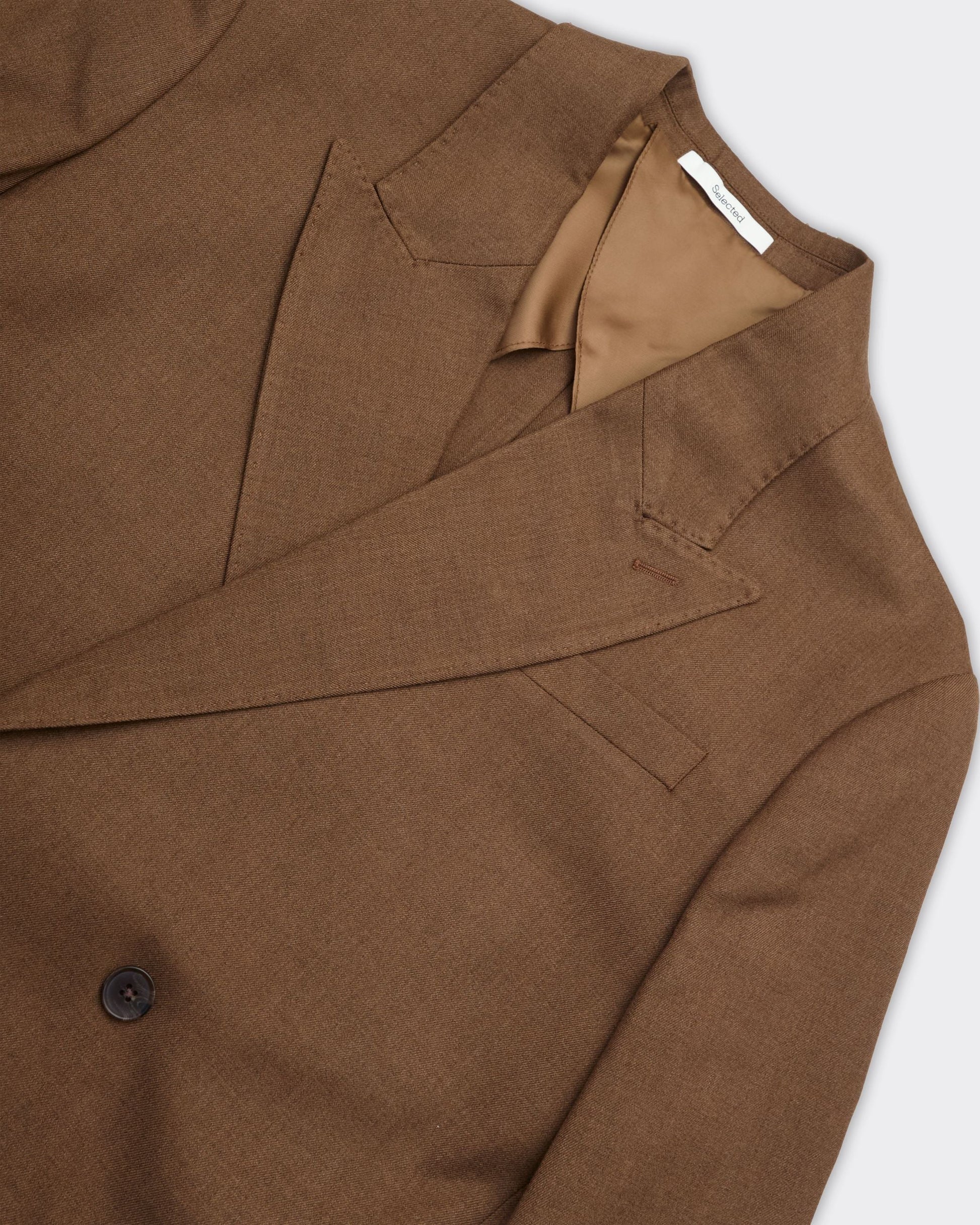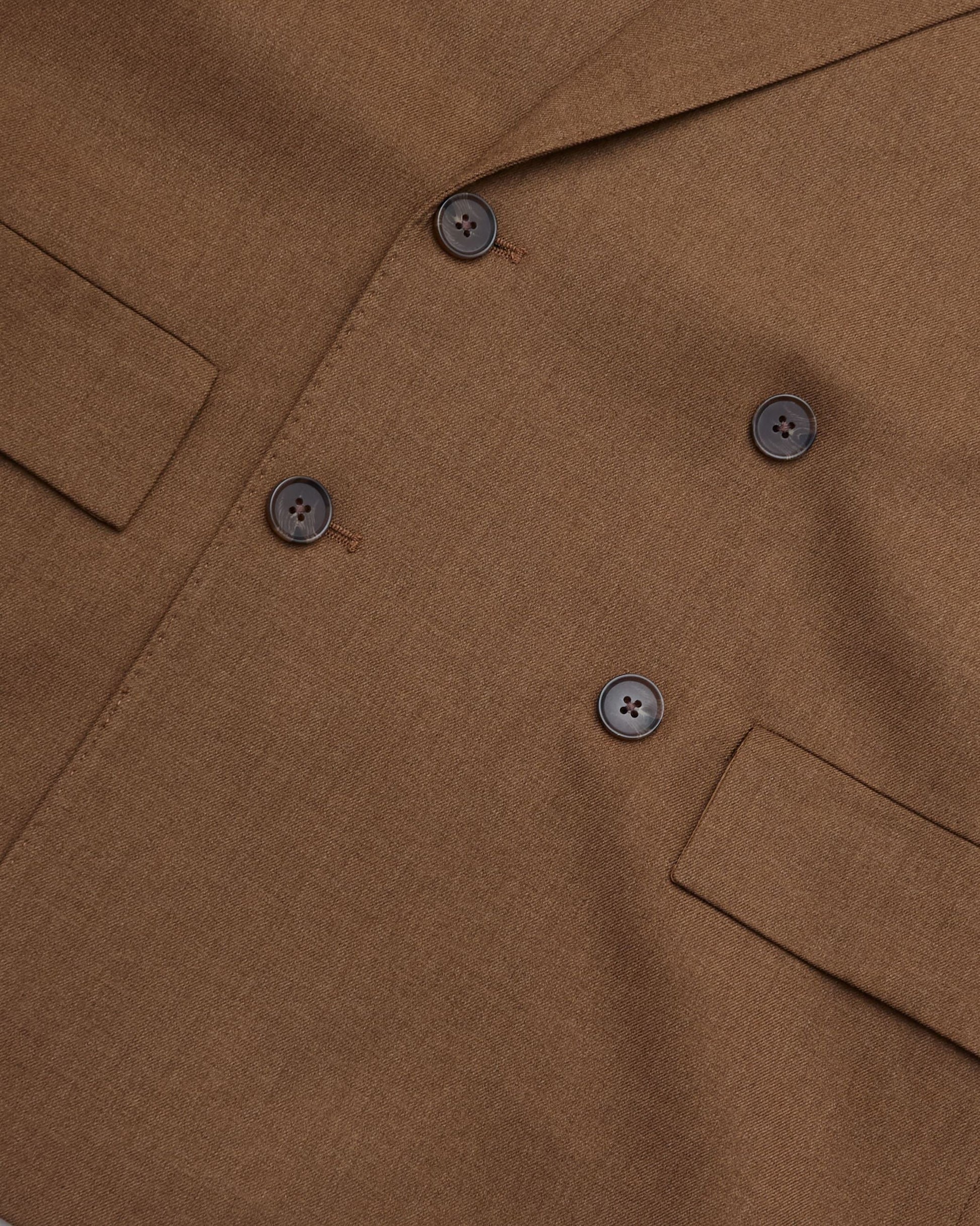 Blazer doppio petto color cognac, con tasche frontali e bottoni. Tessuto liscio e dettagli curati.