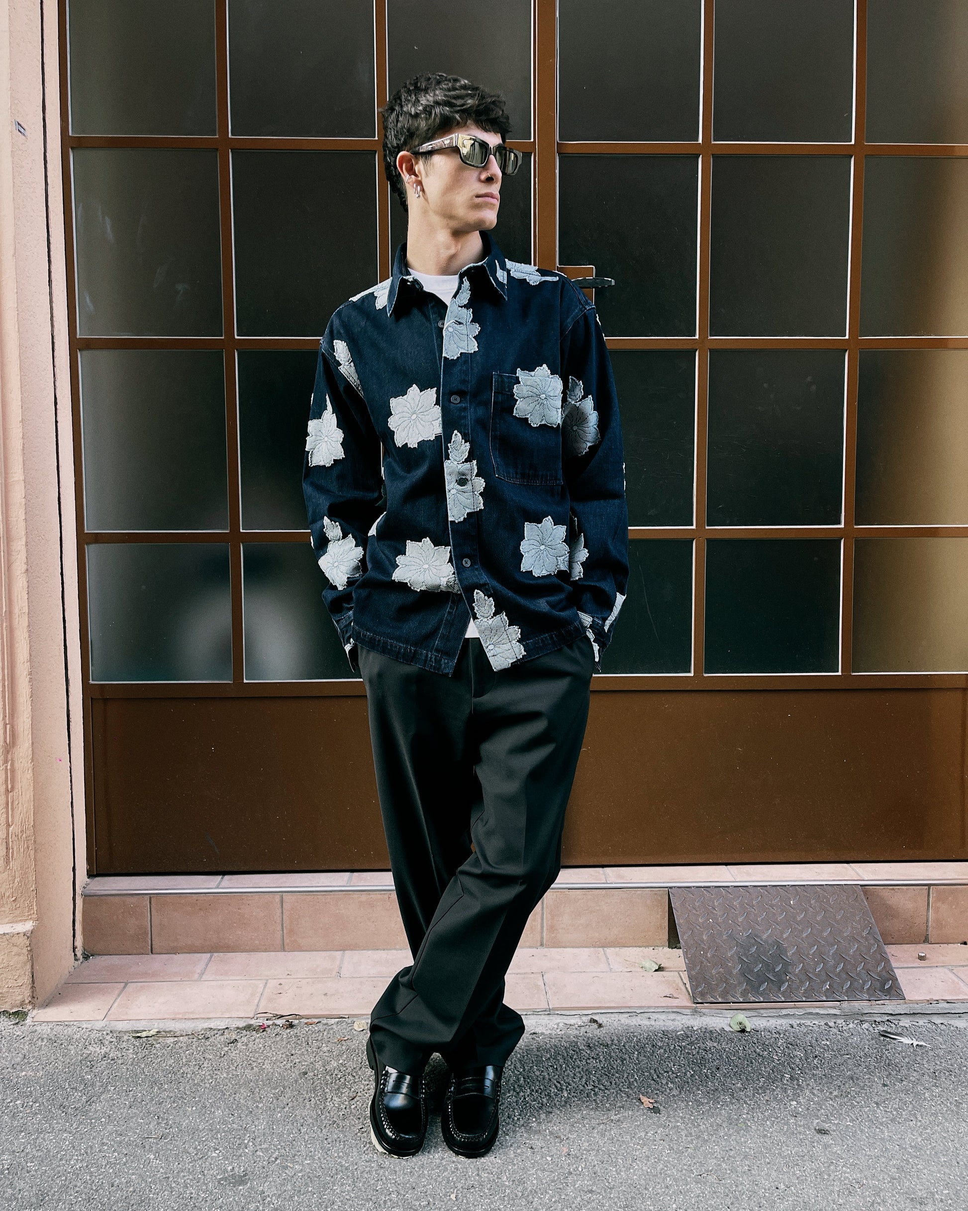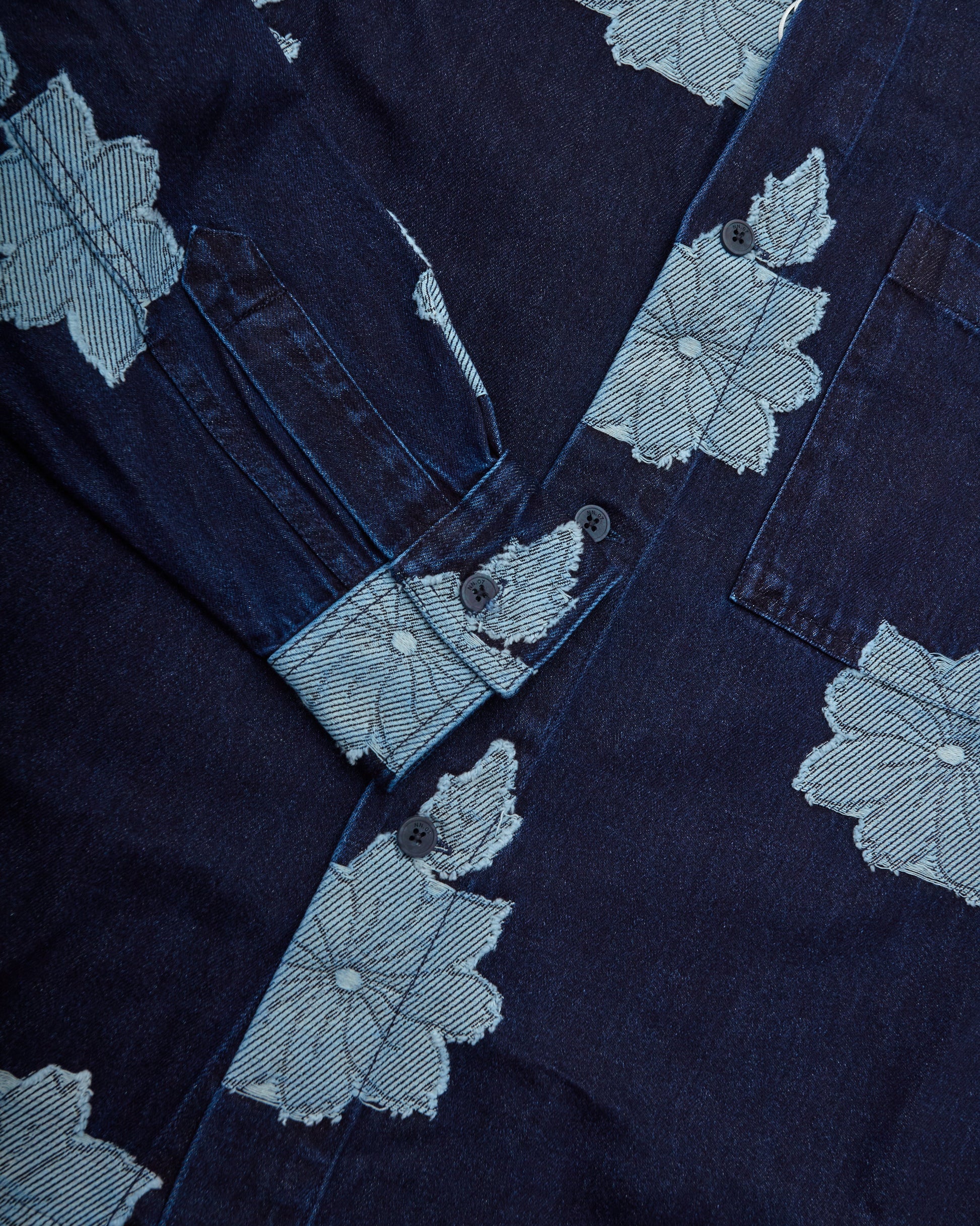 Camicia in denim blu scuro con ricami floreali chiari su tutta la superficie e tasca sul petto.