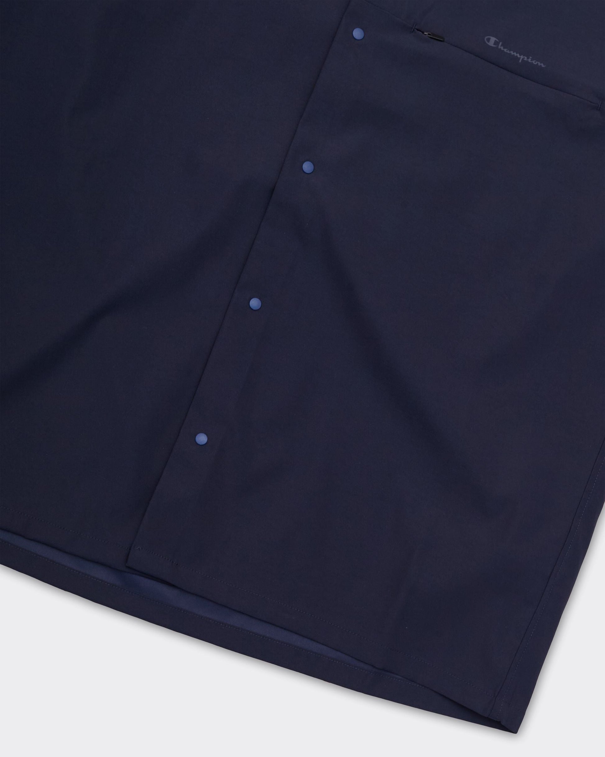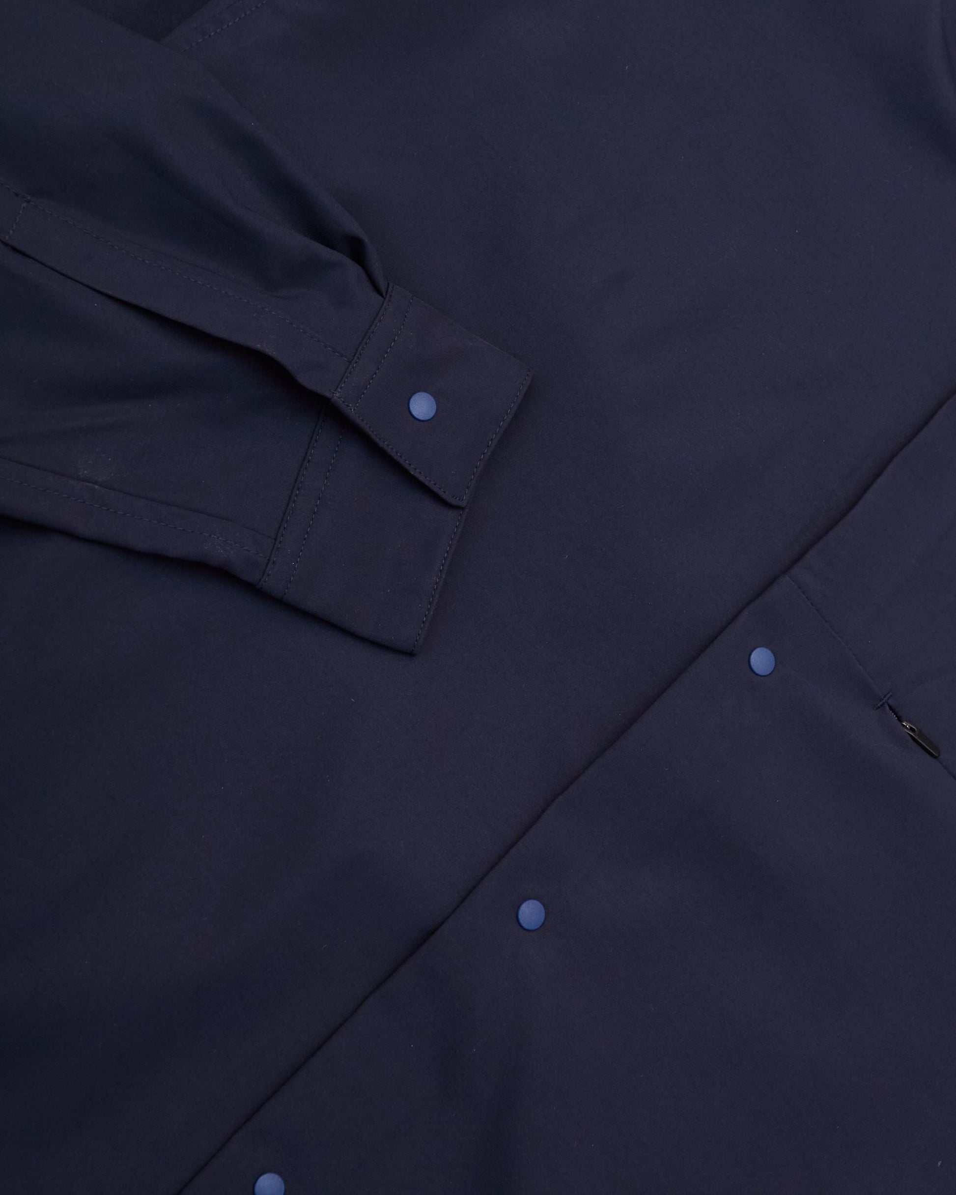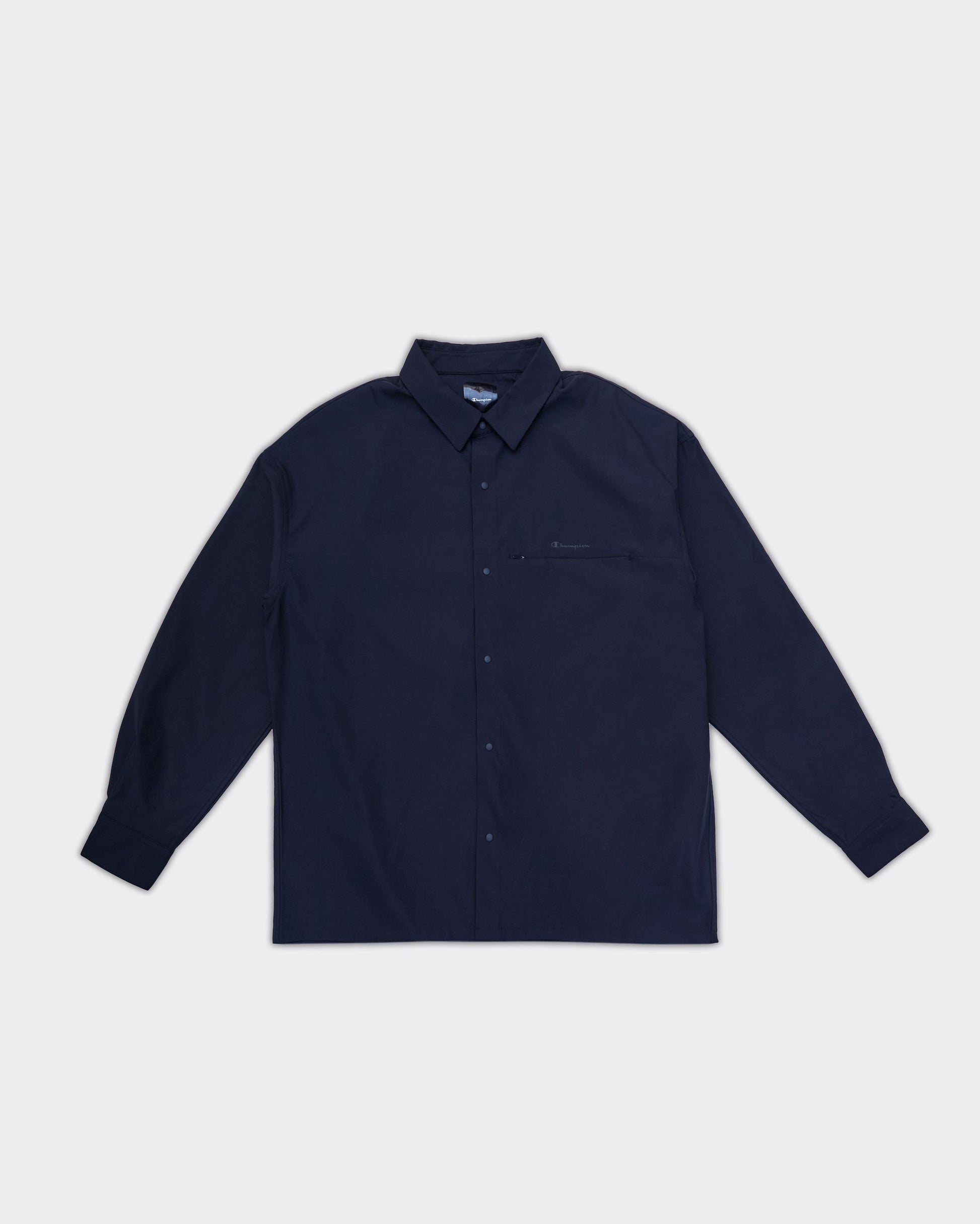 Camicia blu con bottoni coordinati, tasca sul petto con piccolo logo ricamato sopra. Maniche lunghe e colletto classico.
