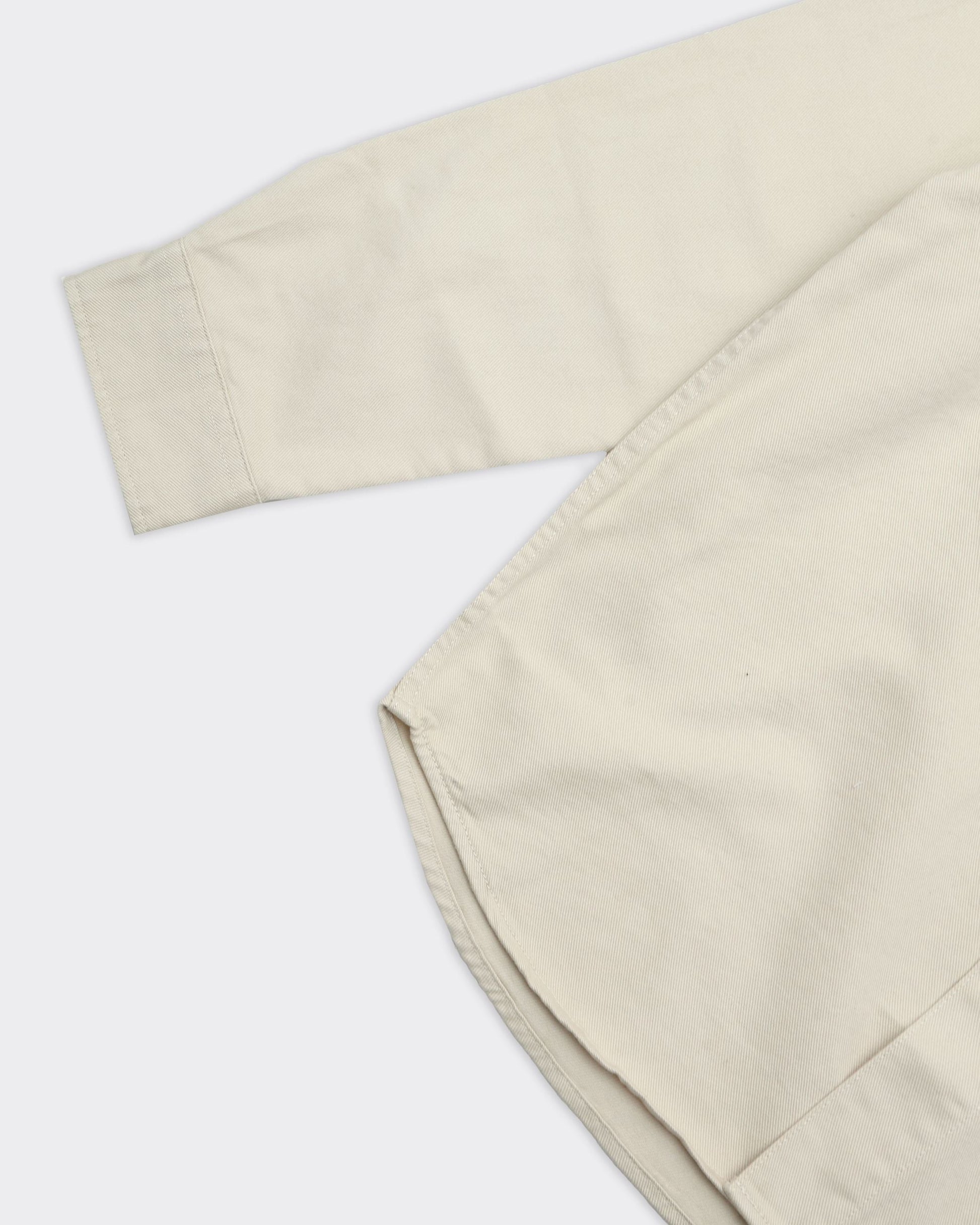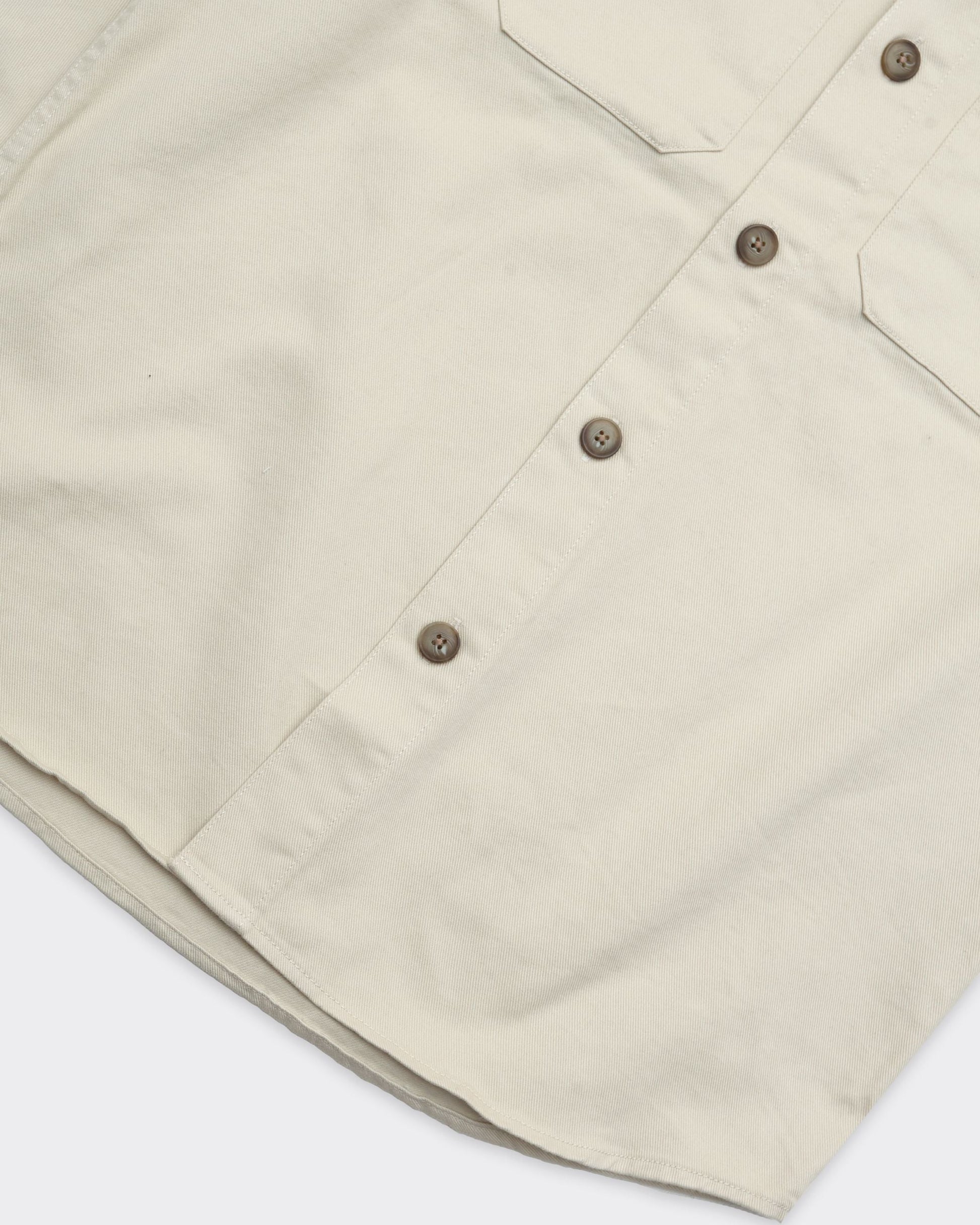 Colore avena, tessuto twill. Due tasche sul petto e bottoni frontali in tono scuro.