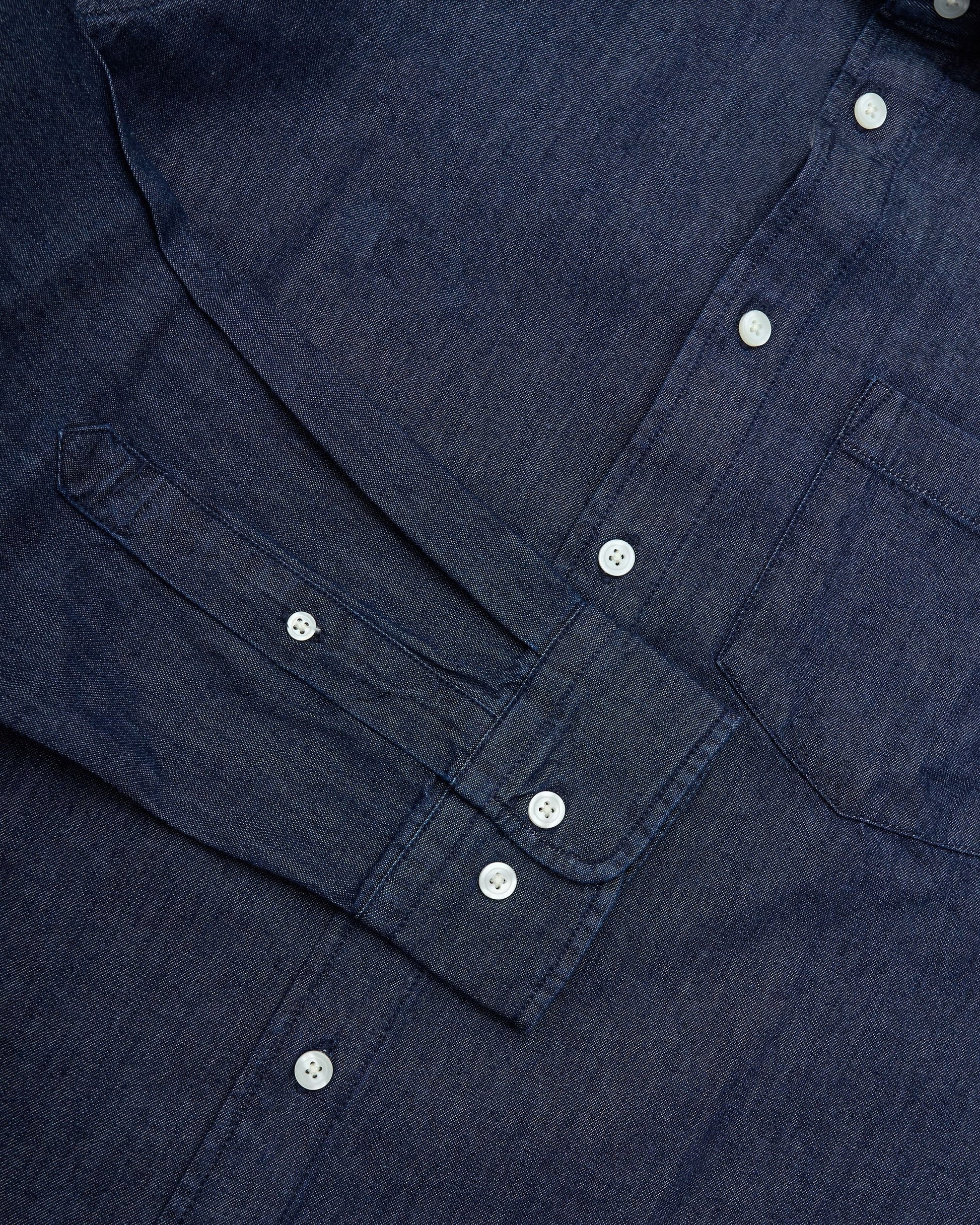 Camicia in denim blu scuro con bottoni bianchi sul davanti, taschino sul petto e colletto classico.
