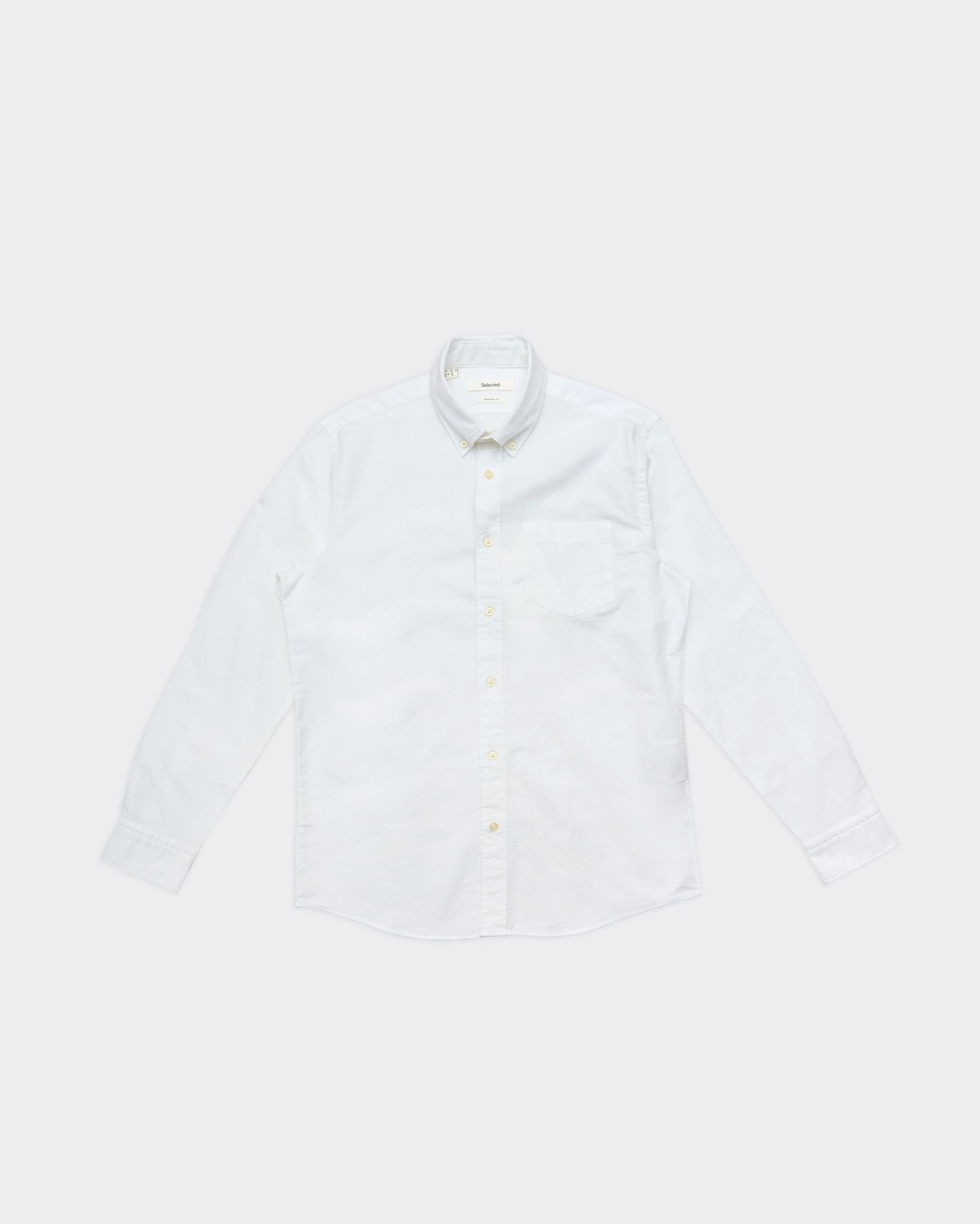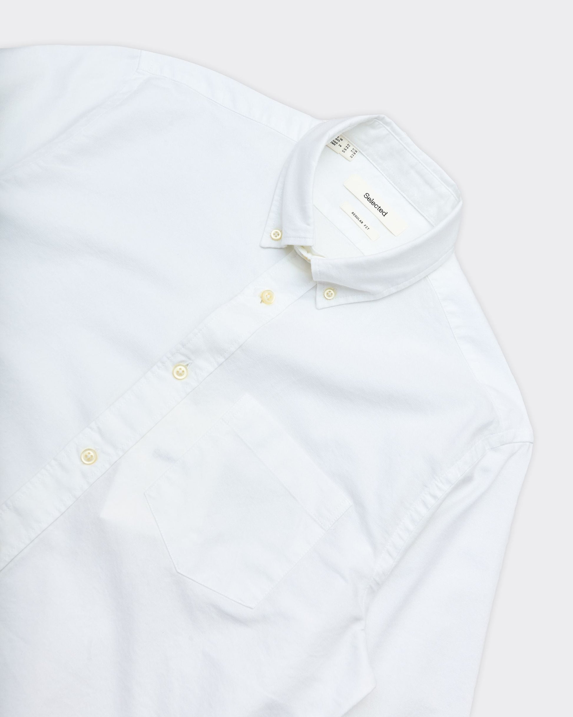 Camicia bianca con taschino sul petto e bottoni frontali.