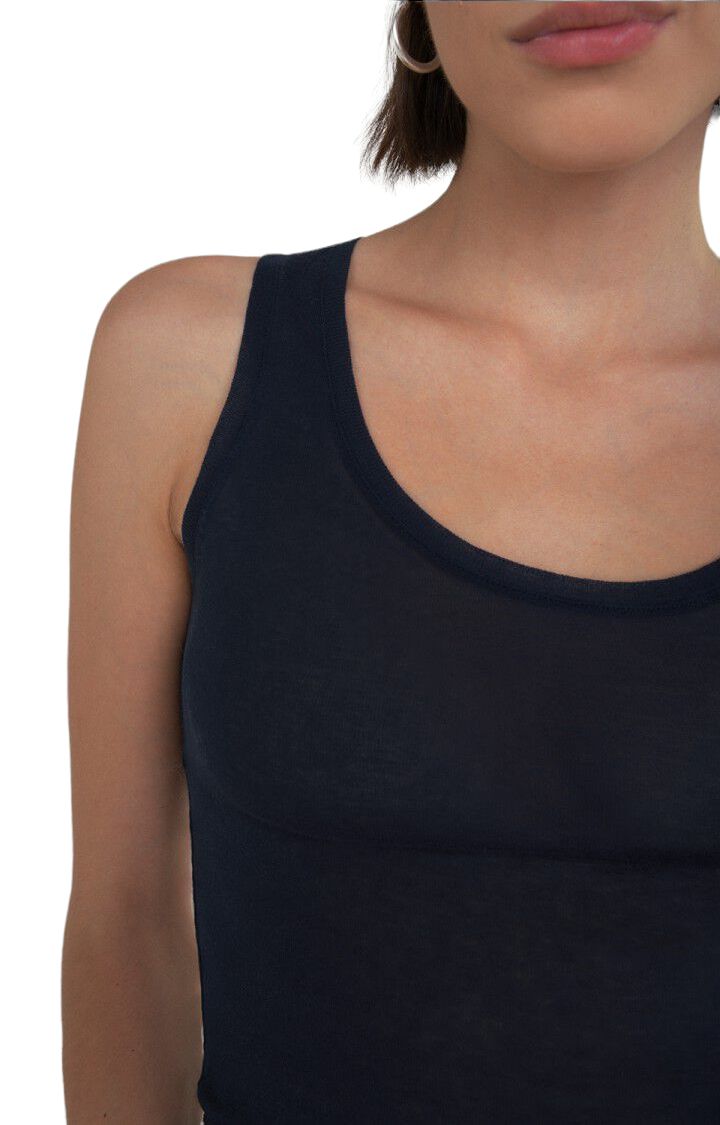 Questa canotta è tagliata in un tessuto leggermente trasparente, in jersey a costine, che garantisce un comfort di base per diversi stili. La sua versatilità la rende adatta a essere indossata da sola o sotto altri capi, come camicie o giacche, per creare strati di abbigliamento. Il modello senza maniche e con scollo rotondo aggiunge un tocco di semplicità e raffinatezza.