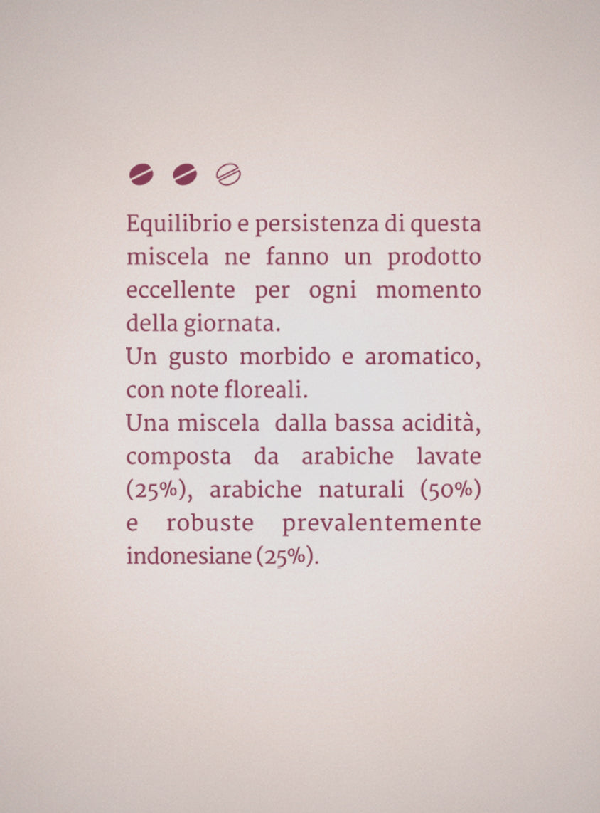 La sua miscela, dalla bassa acidità, è composta da arabiche lavate, arabiche naturali e robuste prevalentemente indonesiane.