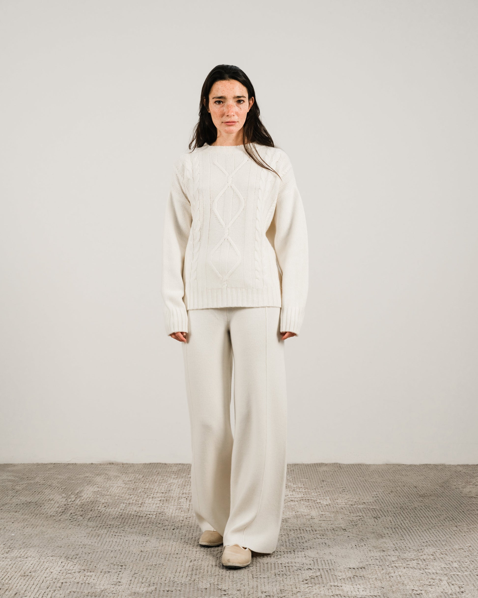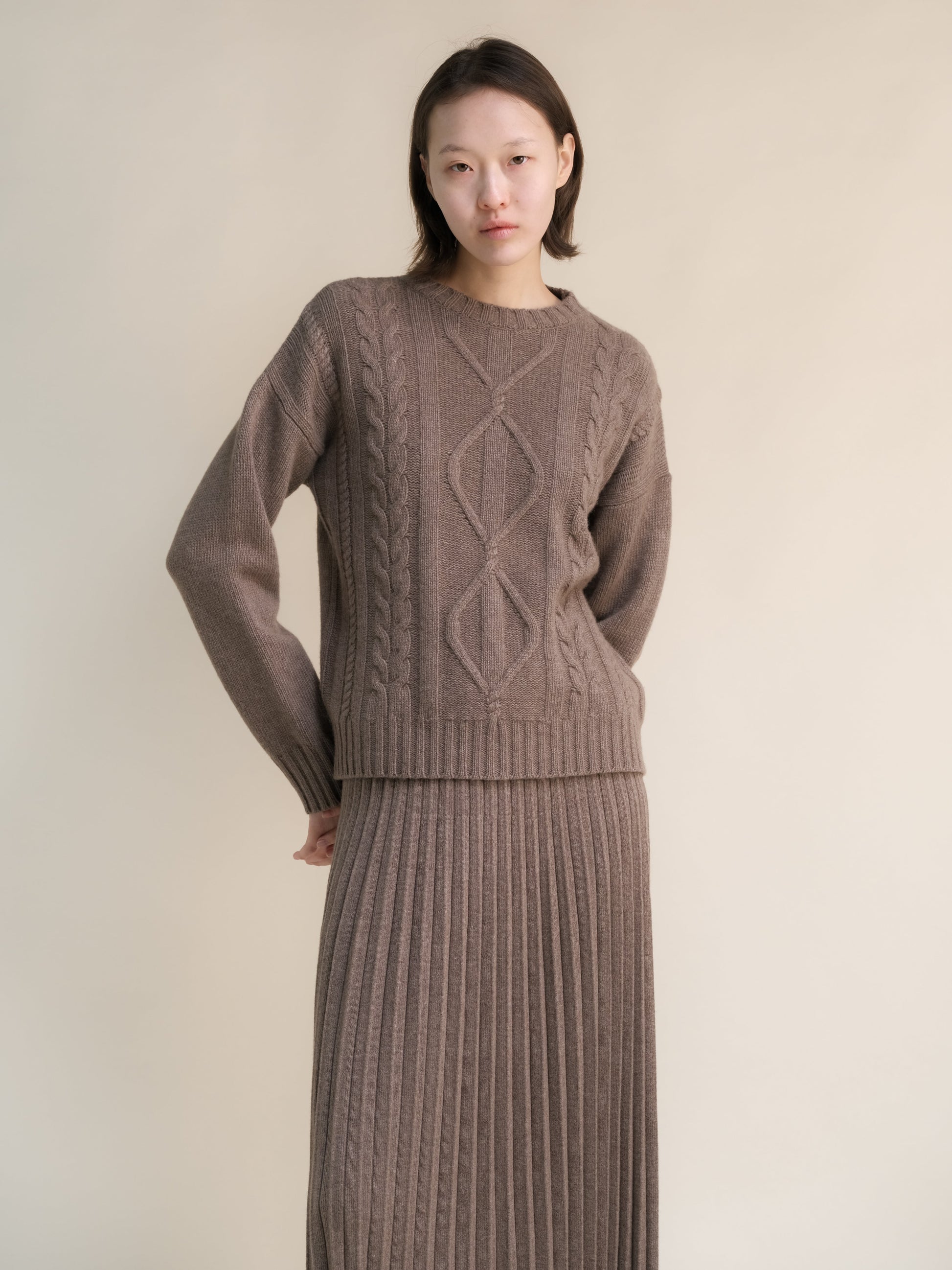 It features an oversized ribbed neckline, hem, and cuffs, with plain knit sleeves and a beautifully textured cable knit body.