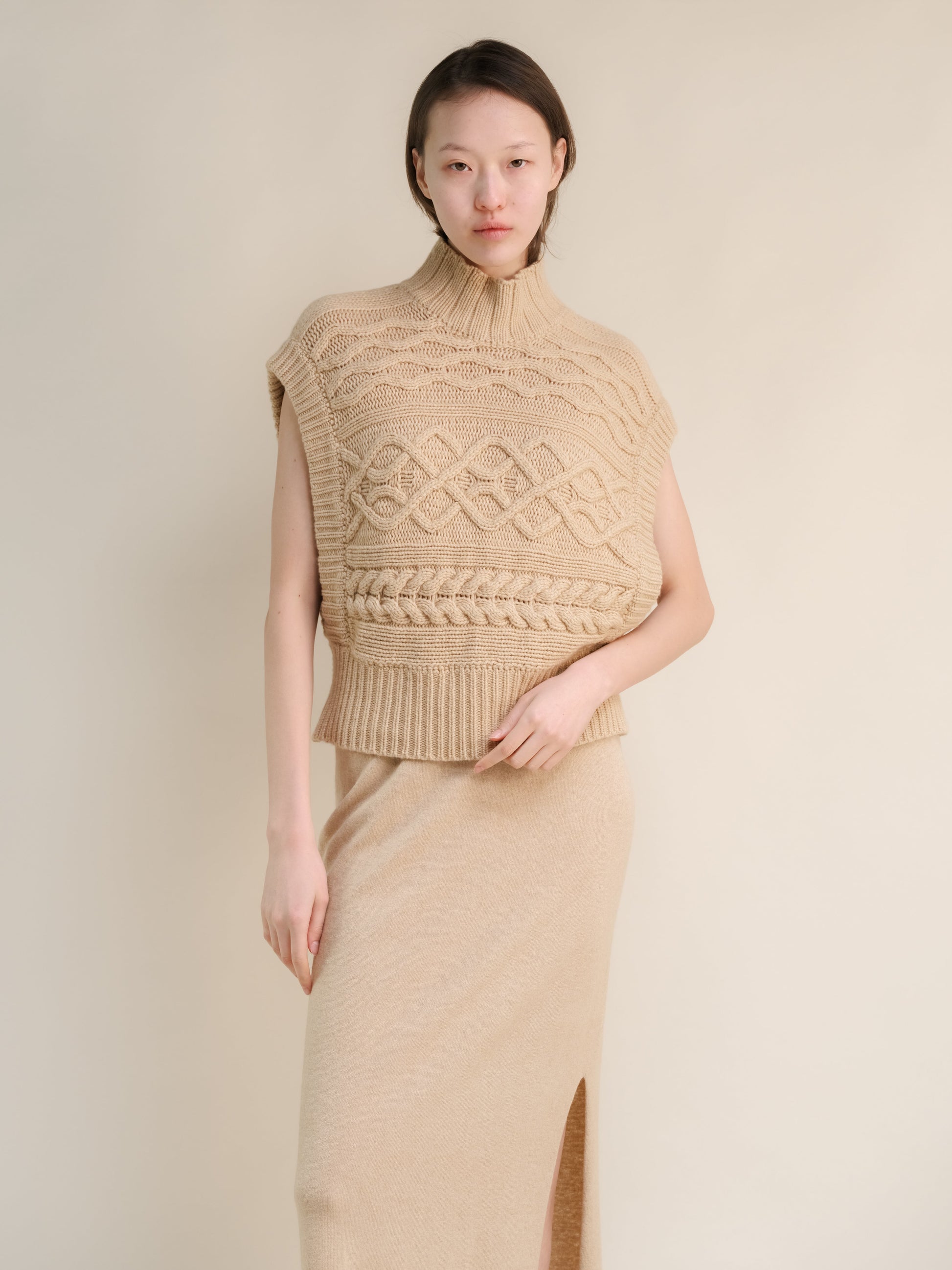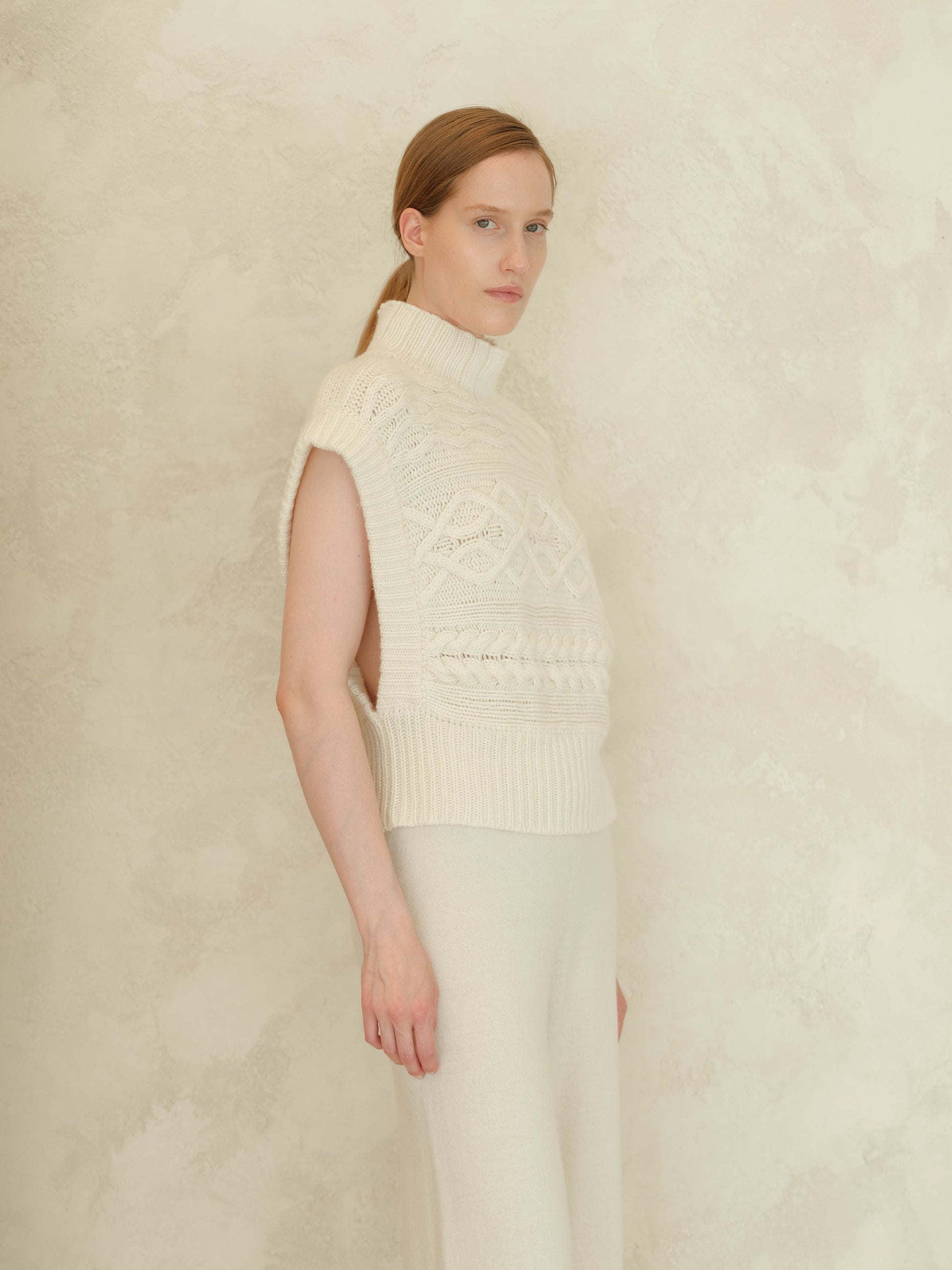 A cozy tunic in a luxurious cashmere blend, featuring a relaxed fit with an intricate cable-knit pattern. The wide double-ribbed armholes offer ease of movement while adding a touch of casual sophistication. Perfect for layering or wearing on its own, it combines warmth, elegance, and everyday comfort.
