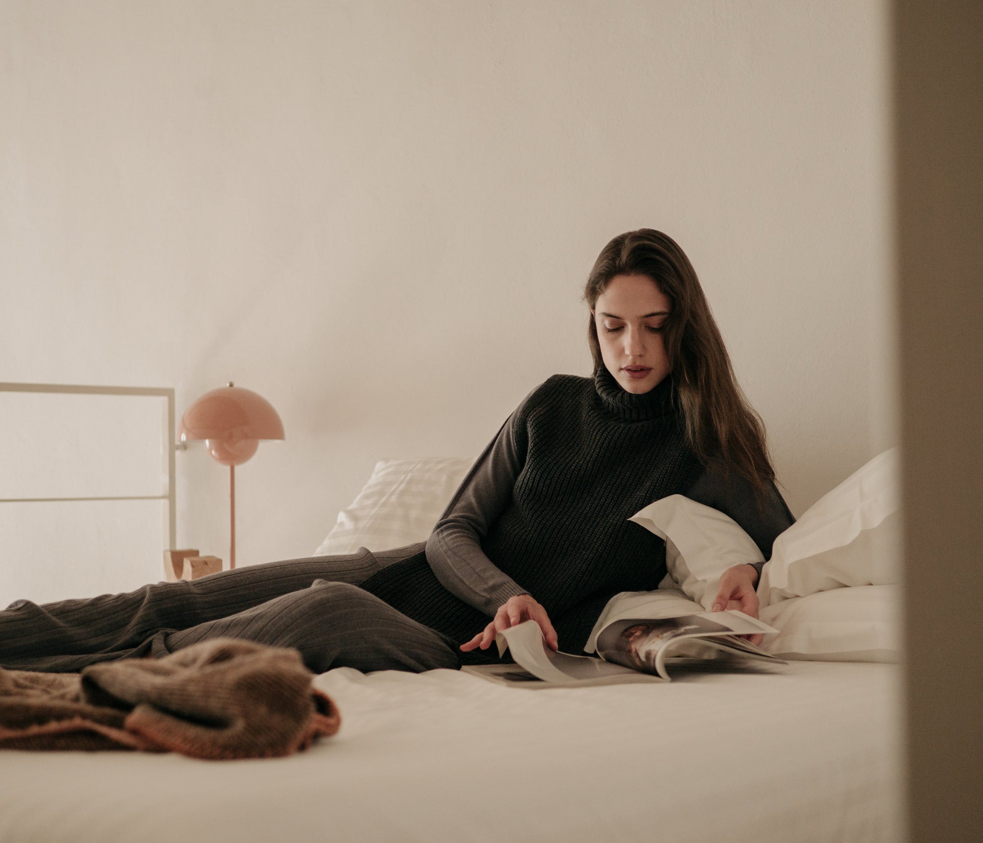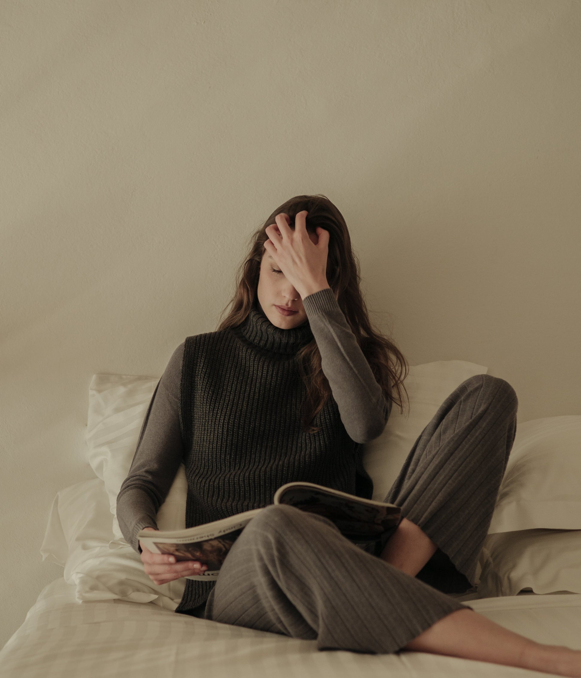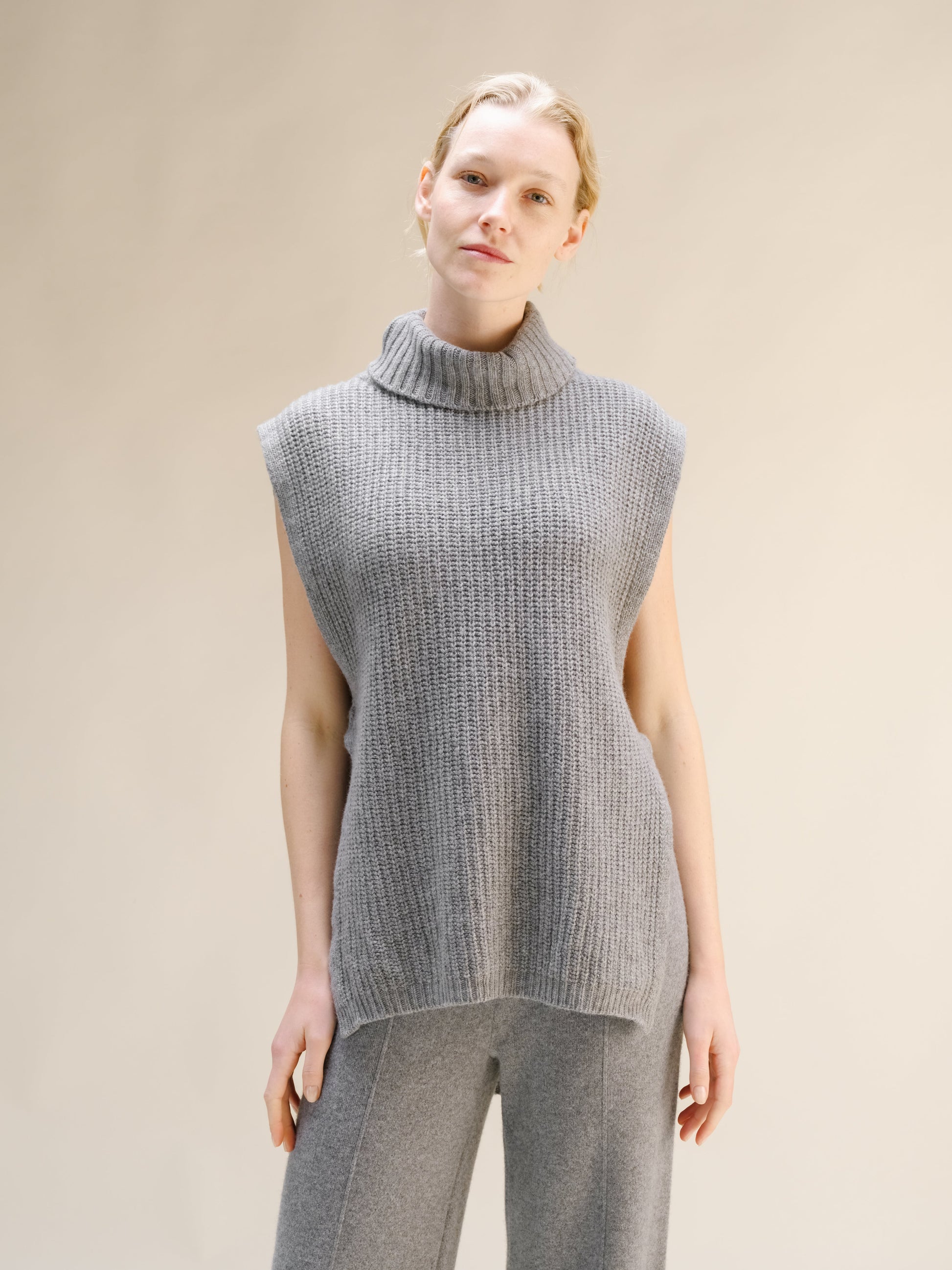 Crafted using a refined multi-thread half-cardigan rib technique, this sleeveless tunic offers a graceful silhouette with its high neckline and minimalist cut. A versatile piece, it’s ideal for layering or wearing solo, adding understated elegance to any look.