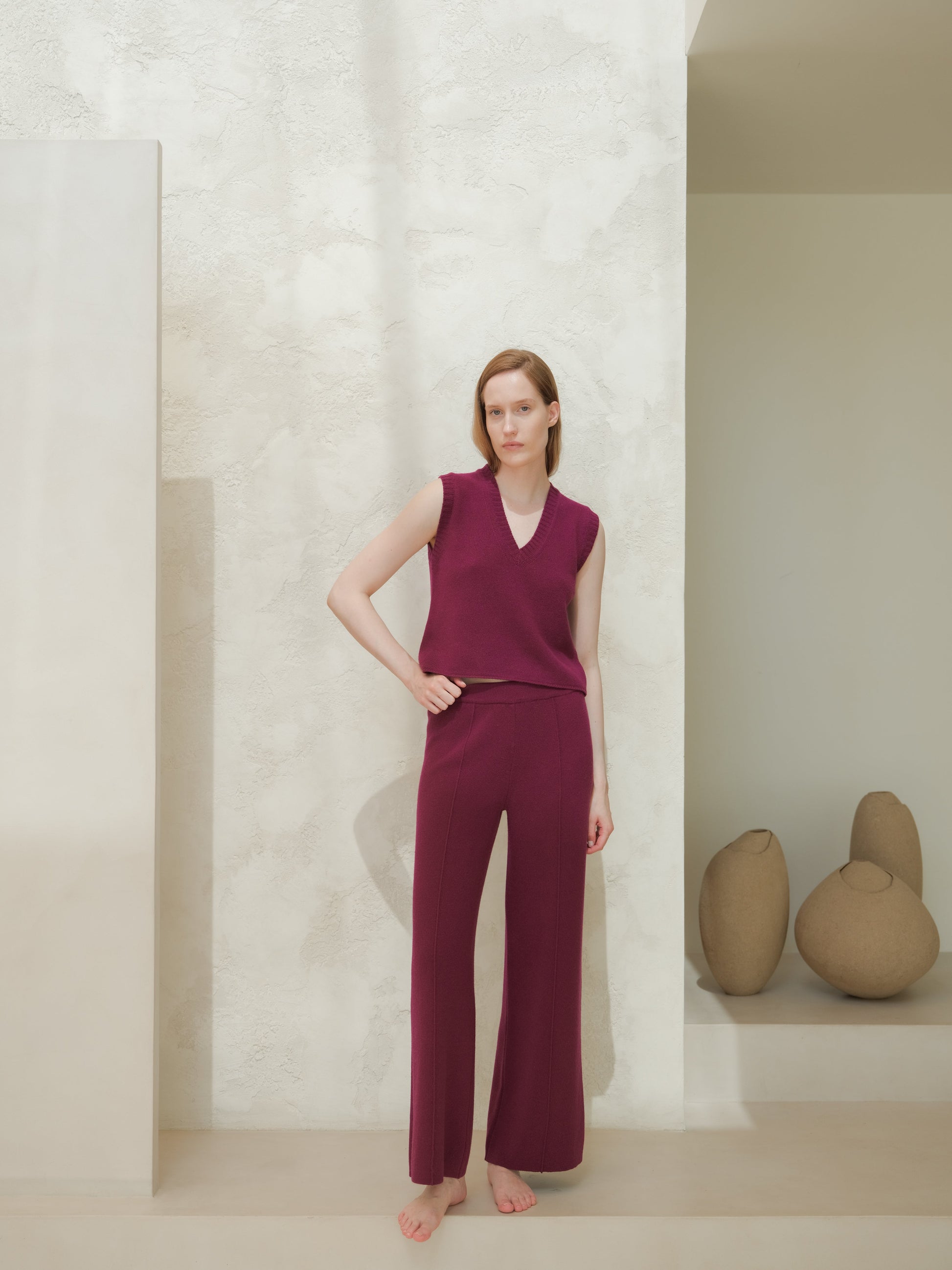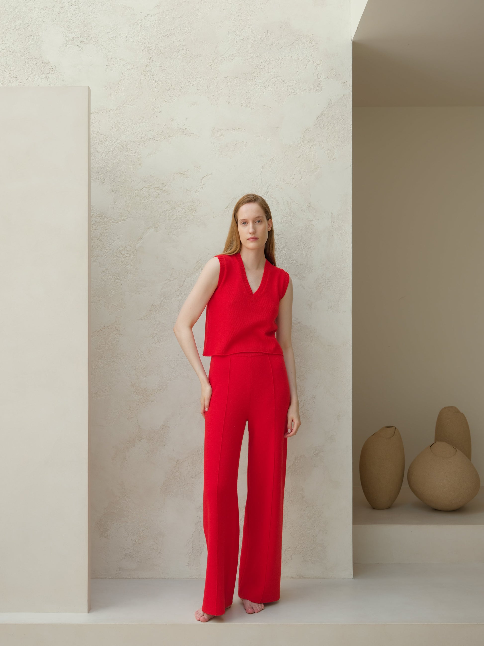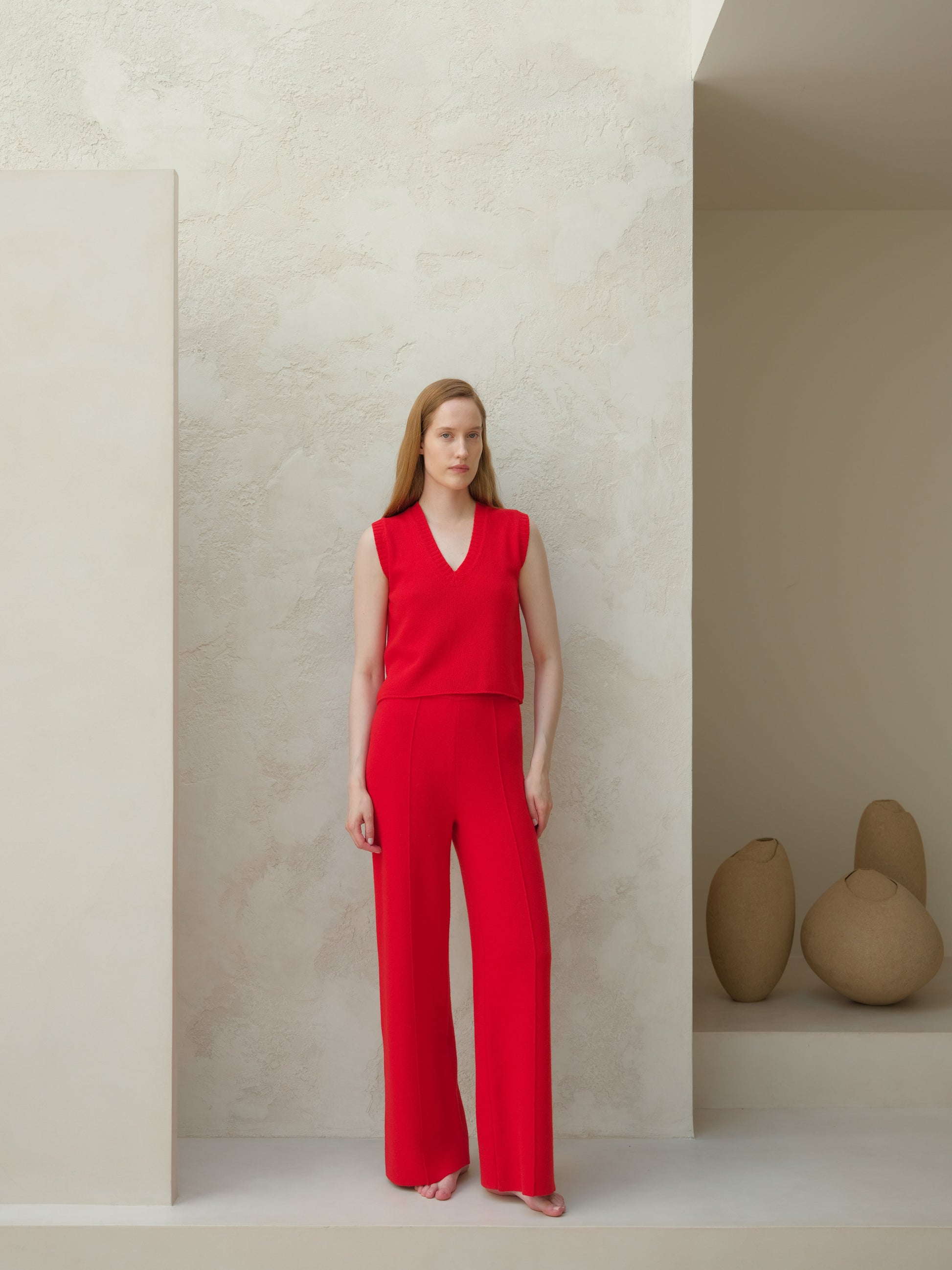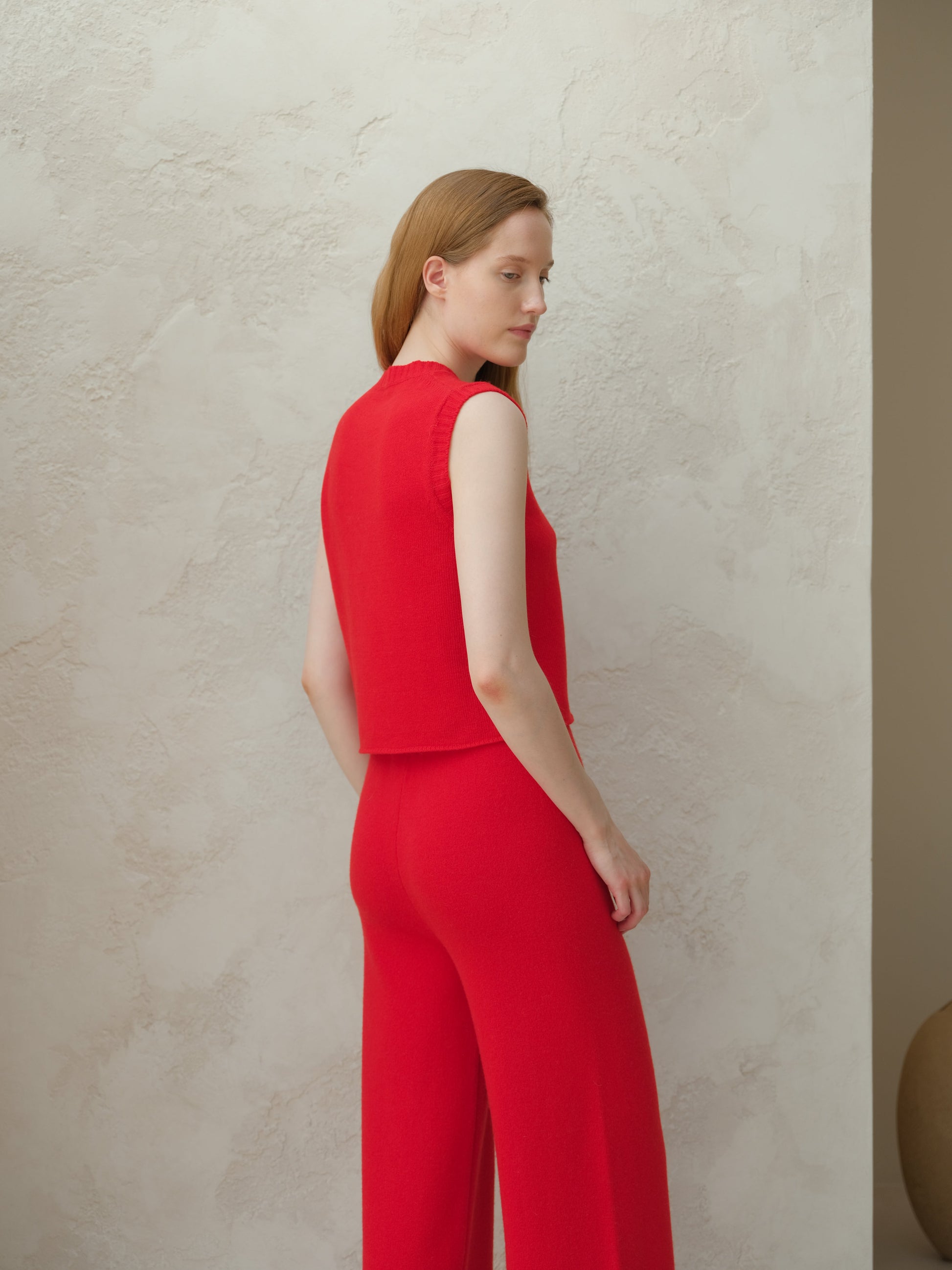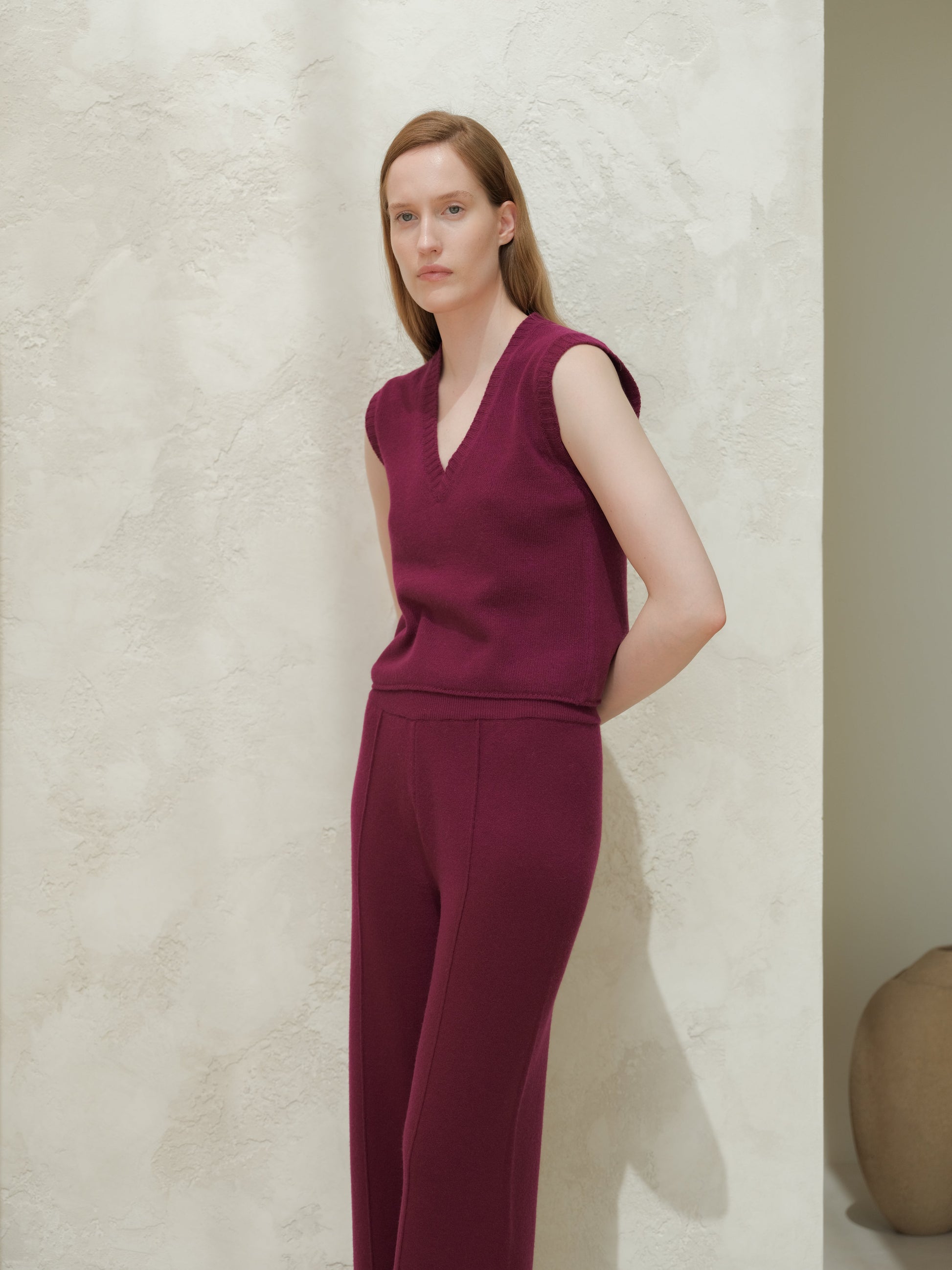 This sleeveless top in soft cashmere mix features a defined V-neckline and ribbed trims that enhance its minimal silhouette.