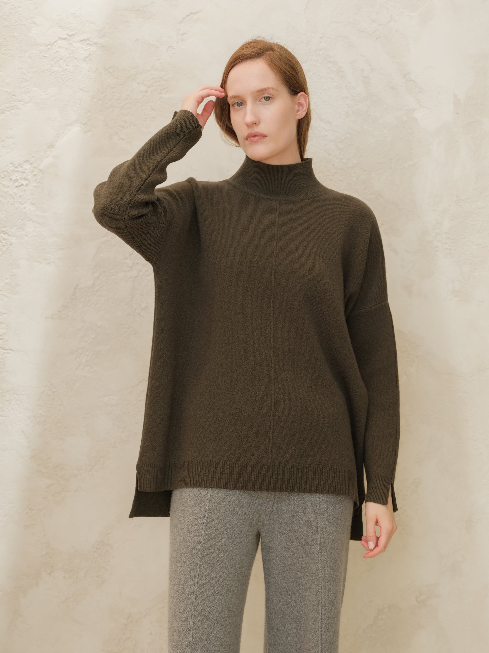 With its sculptural high collar and soft, voluminous shape, this sweater gently frames the figure while offering absolute comfort. Made from our signature cashmere mix, it lends warmth and softness with a minimalist edge.