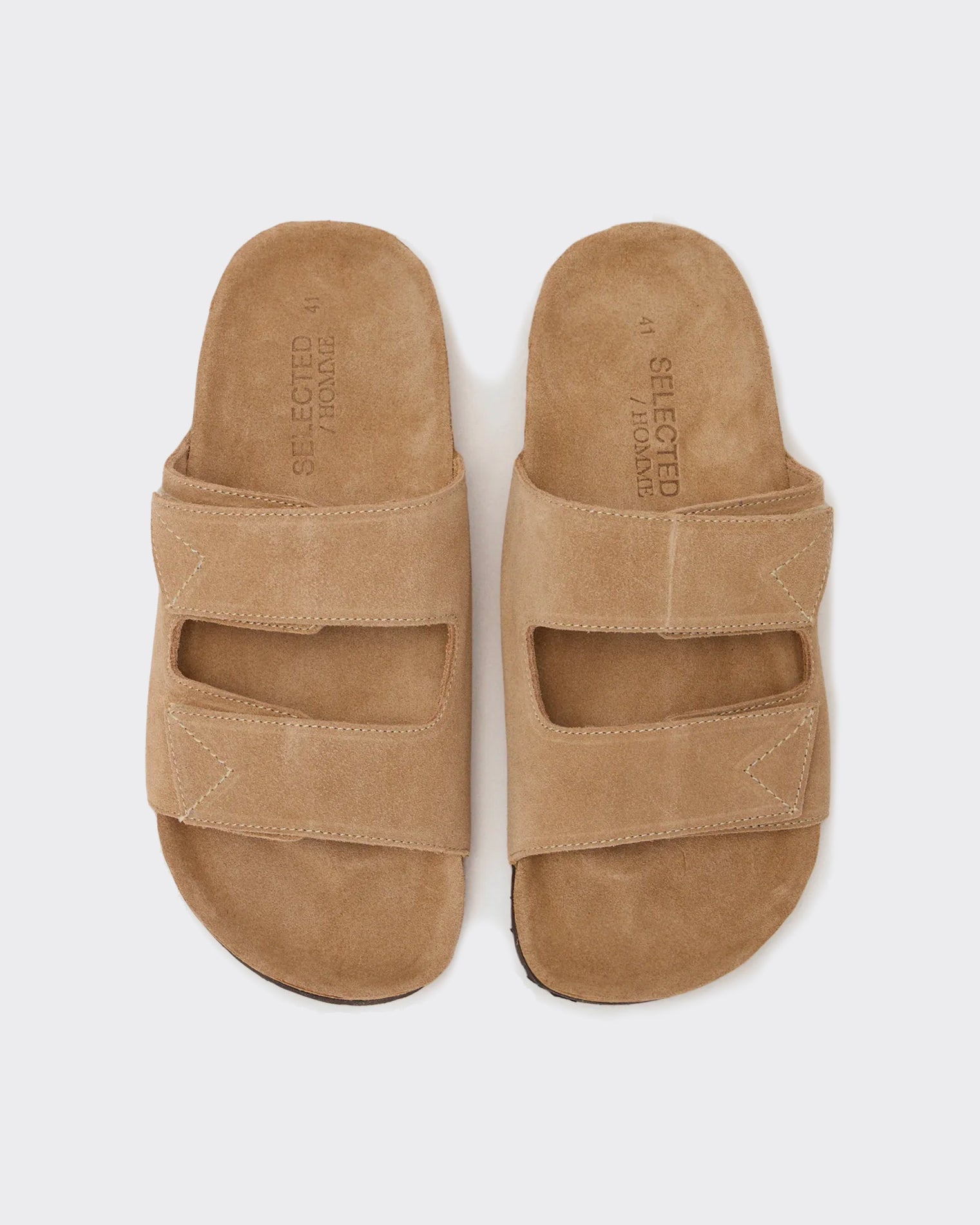 Colore sabbia, realizzate in pelle scamosciata visibile sulla tomaia e sui lati. Due fasce larghe con cuciture accentuate nella parte superiore. Suola interna visibile in sughero, suola esterna nera con motivo zigrinato.