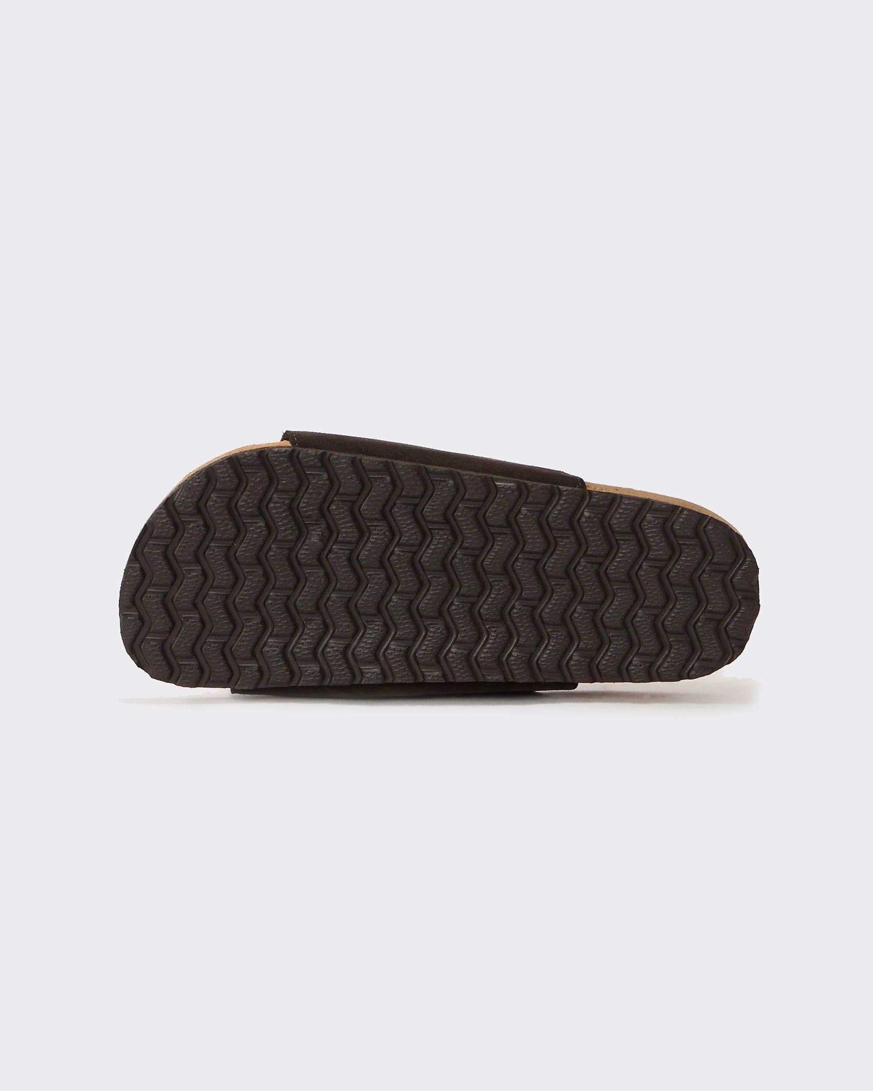 Ciabatta in suede marrone con doppio strap sul collo, dettagli cuciti visibili.
