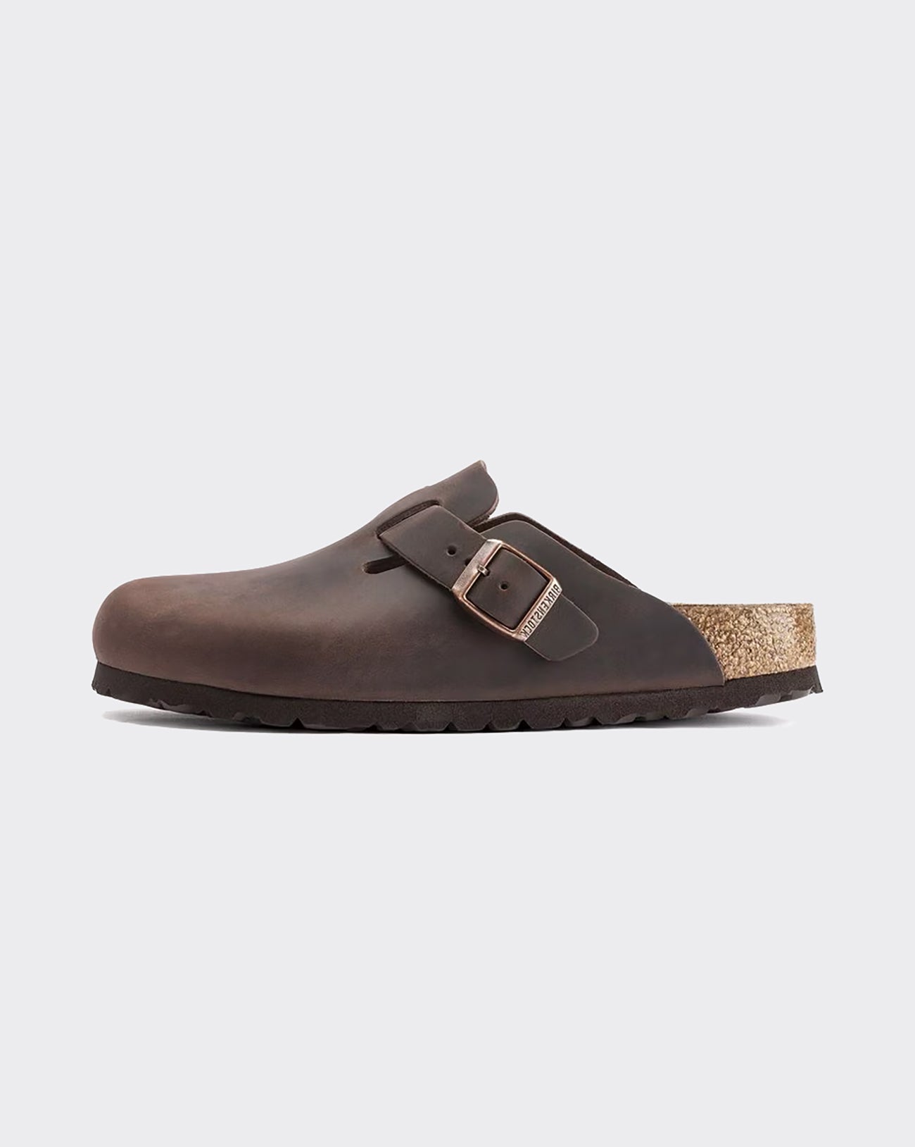 Ciabatta in pelle marrone oliata, fibbia metallica regolabile lateralmente, suola in sughero e gomma.